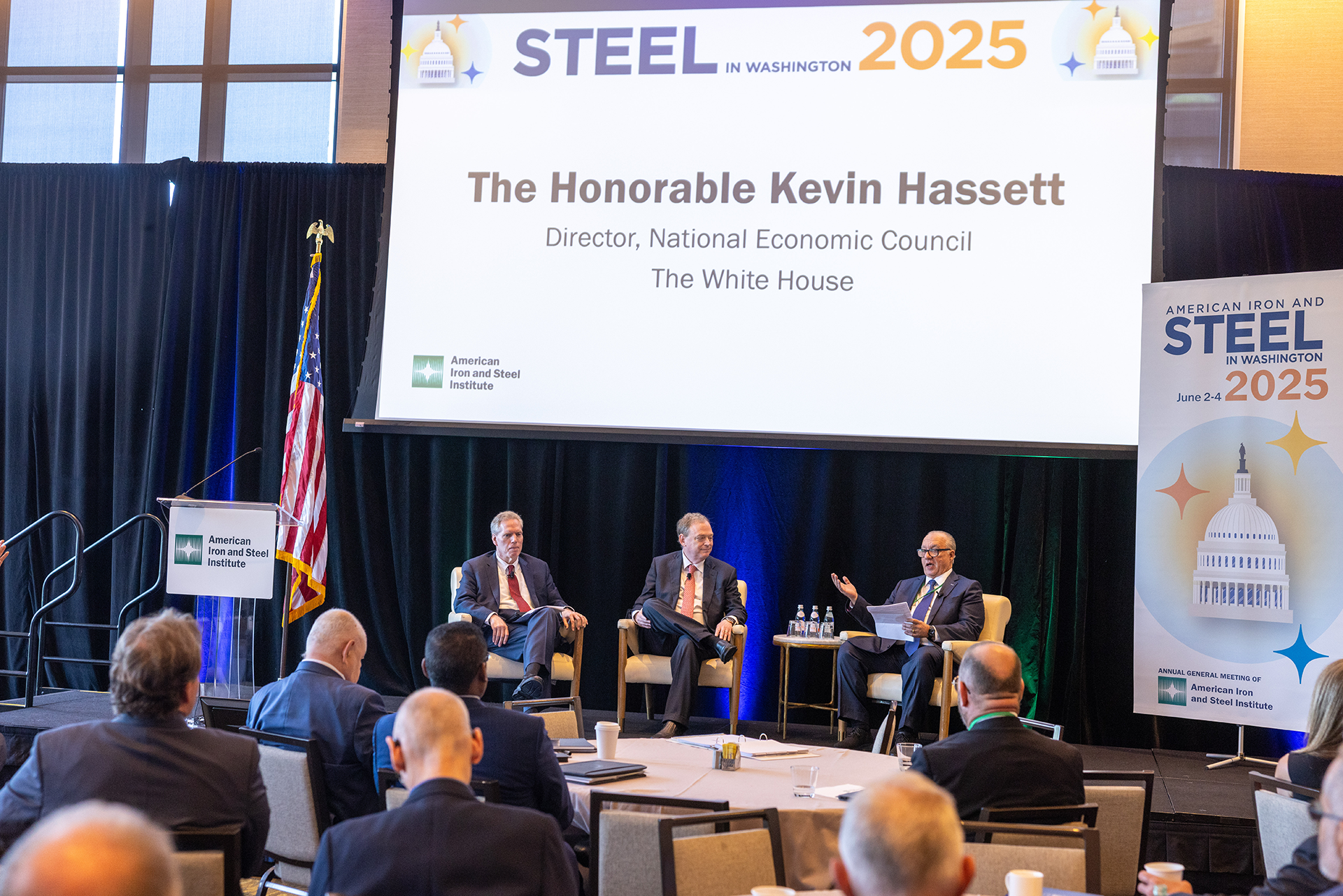 Pictured: From left, Kevin Dempsey, AISI President & CEO, The Honorable Kevin Hassett, Director of the National Economic Council, The White House, and Lourenco Goncalves, Chairman, President & CEO of Cleveland-Cliffs.