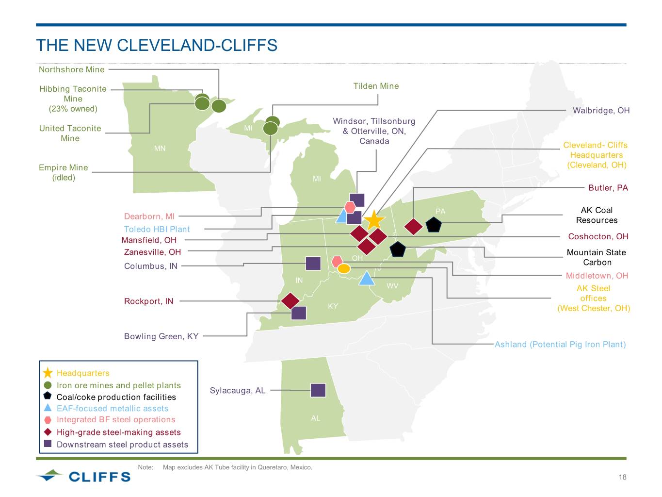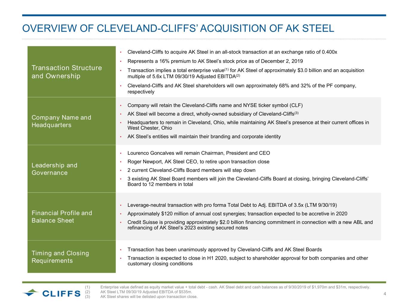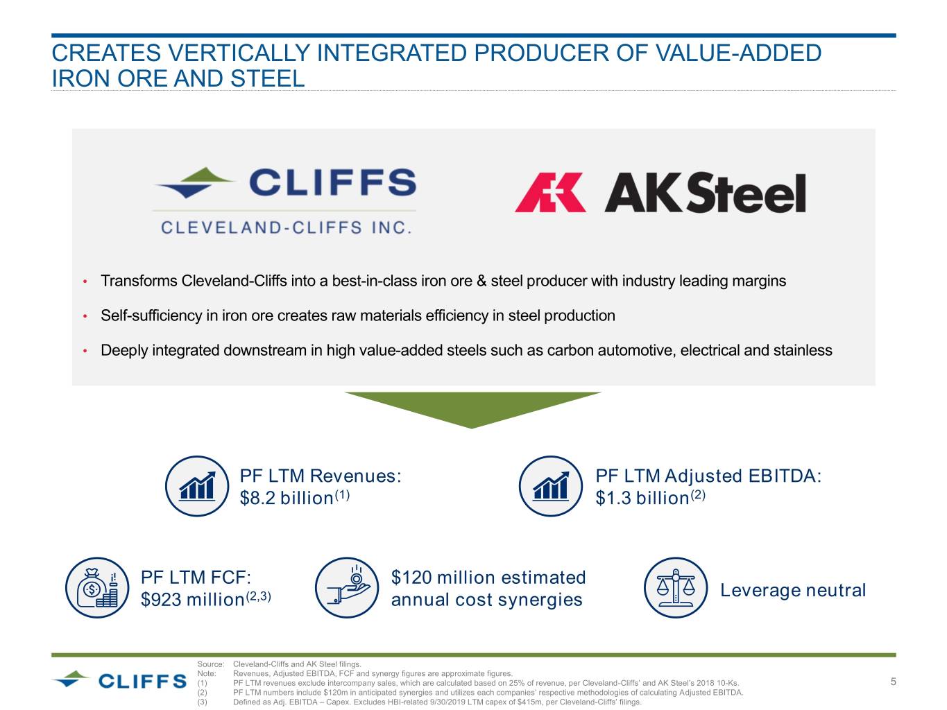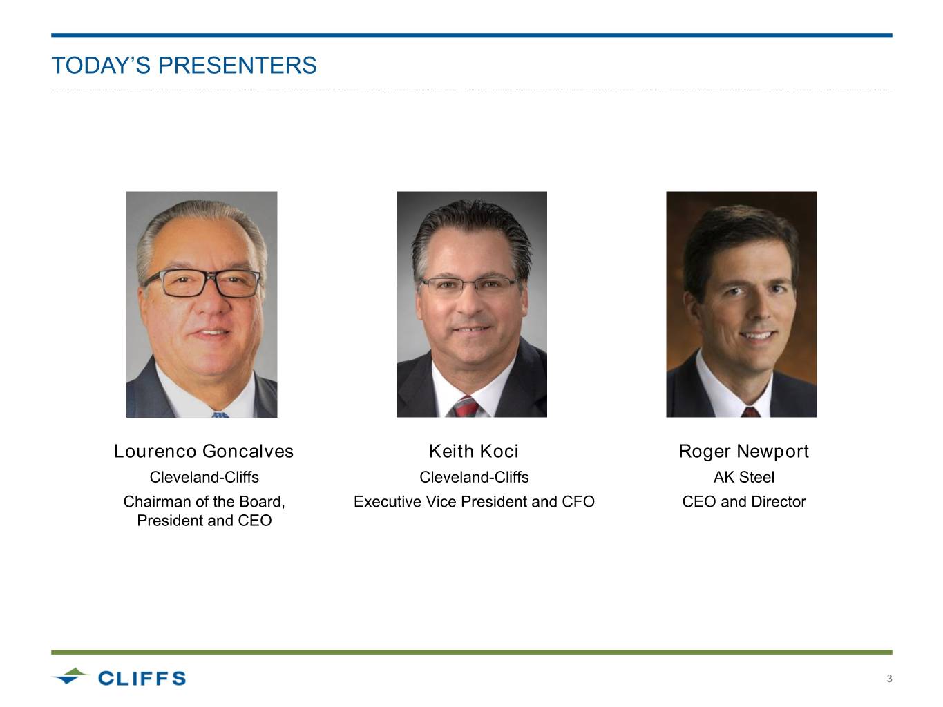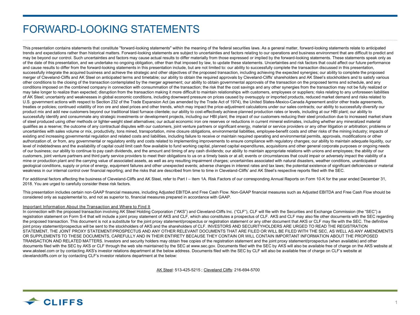 FORWARD-LOOKING STATEMENTS This presentation contains statements that constitute "forward-looking statements" within the meaning of the federal securities laws. As a general matter, forward-looking statements relate to anticipated trends and expectations rather than historical matters. Forward-looking statements are subject to uncertainties and factors relating to our operations and business environment that are difficult to predict and may be beyond our control. Such uncertainties and factors may cause actual results to differ materially from those expressed or implied by the forward-looking statements. These statements speak only as of the date of this presentation, and we undertake no ongoing obligation, other than that imposed by law, to update these statements. Uncertainties and risk factors that could affect our future performance and cause results to differ from the forward-looking statements in this presentation include, but are not limited to: our ability to successfully complete the transaction discussed in this presentation, successfully integrate the acquired business and achieve the strategic and other objectives of the proposed transaction, including achieving the expected synergies; our ability to complete the proposed merger of Cleveland-Cliffs and AK Steel on anticipated terms and timetable; our ability to obtain the required approvals by Cleveland-Cliffs’ shareholders and AK Steel’s stockholders and to satisfy various other conditions to the closing of the transaction contemplated by the merger agreement; our ability to obtain governmental approvals of the transaction on the proposed terms and schedule, and any conditions imposed on the combined company in connection with consummation of the transaction; the risk that the cost savings and any other synergies from the transaction may not be fully realized or may take longer to realize than expected; disruption from the transaction making it more difficult to maintain relationships with customers, employees or suppliers; risks relating to any unforeseen liabilities of AK Steel; uncertainty and weaknesses in global economic conditions, including downward pressure on prices caused by oversupply or imported products, reduced market demand and risks related to U.S. government actions with respect to Section 232 of the Trade Expansion Act (as amended by the Trade Act of 1974), the United States-Mexico-Canada Agreement and/or other trade agreements, treaties or policies; continued volatility of iron ore and steel prices and other trends, which may impact the price-adjustment calculations under our sales contracts; our ability to successfully diversify our product mix and add new customers beyond our traditional blast furnace clientele; our ability to cost-effectively achieve planned production rates or levels, including at our HBI plant; our ability to successfully identify and consummate any strategic investments or development projects, including our HBI plant; the impact of our customers reducing their steel production due to increased market share of steel produced using other methods or lighter-weight steel alternatives; our actual economic iron ore reserves or reductions in current mineral estimates, including whether any mineralized material qualifies as a reserve; the outcome of any contractual disputes with our customers, joint venture partners or significant energy, material or service providers or any other litigation or arbitration; problems or uncertainties with sales volume or mix, productivity, tons mined, transportation, mine closure obligations, environmental liabilities, employee-benefit costs and other risks of the mining industry; impacts of existing and increasing governmental regulation and related costs and liabilities, including failure to receive or maintain required operating and environmental permits, approvals, modifications or other authorization of, or from, any governmental or regulatory entity and costs related to implementing improvements to ensure compliance with regulatory changes; our ability to maintain adequate liquidity, our level of indebtedness and the availability of capital could limit cash flow available to fund working capital, planned capital expenditures, acquisitions and other general corporate purposes or ongoing needs of our business; our ability to continue to pay cash dividends, and the amount and timing of any cash dividends; our ability to maintain appropriate relations with unions and employees; the ability of our customers, joint venture partners and third party service providers to meet their obligations to us on a timely basis or at all; events or circumstances that could impair or adversely impact the viability of a mine or production plant and the carrying value of associated assets, as well as any resulting impairment charges; uncertainties associated with natural disasters, weather conditions, unanticipated geological conditions, supply or price of energy, equipment failures and other unexpected events; adverse changes in interest rates and tax laws; the potential existence of significant deficiencies or material weakness in our internal control over financial reporting; and the risks that are described from time to time in Cleveland-Cliffs’ and AK Steel’s respective reports filed with the SEC. For additional factors affecting the business of Cleveland-Cliffs and AK Steel, refer to Part I – Item 1A. Risk Factors of our corresponding Annual Reports on Form 10-K for the year ended December 31, 2018. You are urged to carefully consider these risk factors. This presentation includes certain non-GAAP financial measures, including Adjusted EBITDA and Free Cash Flow. Non-GAAP financial measures such as Adjusted EBITDA and Free Cash Flow should be considered only as supplemental to, and not as superior to, financial measures prepared in accordance with GAAP. Important Information About the Transaction and Where to Find It In connection with the proposed transaction