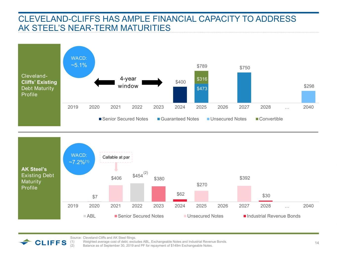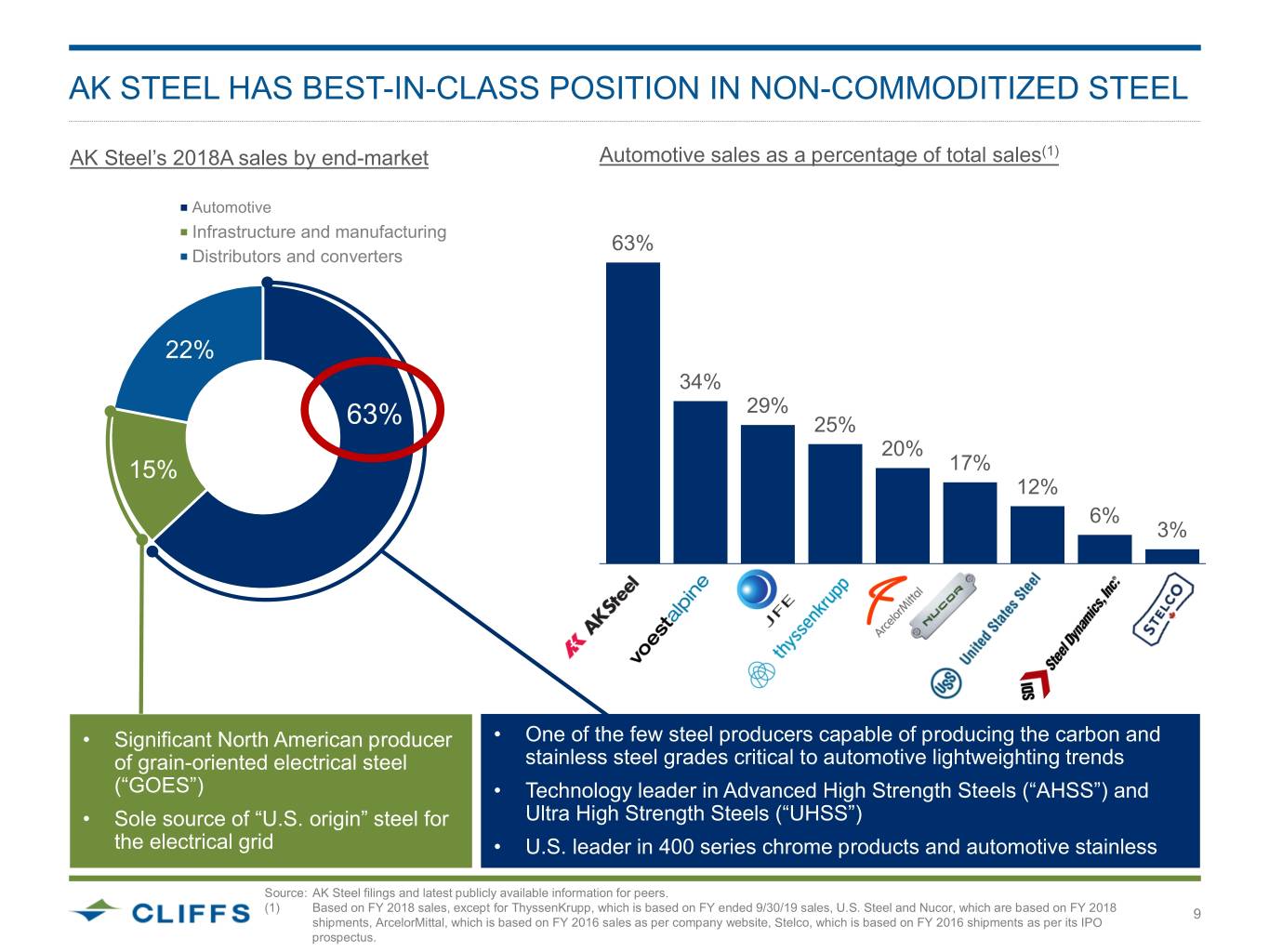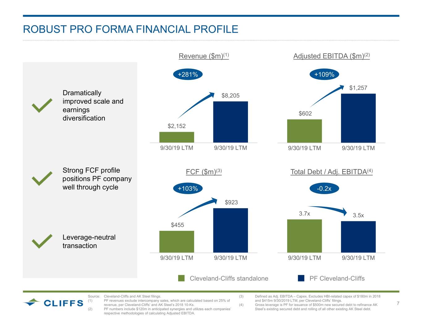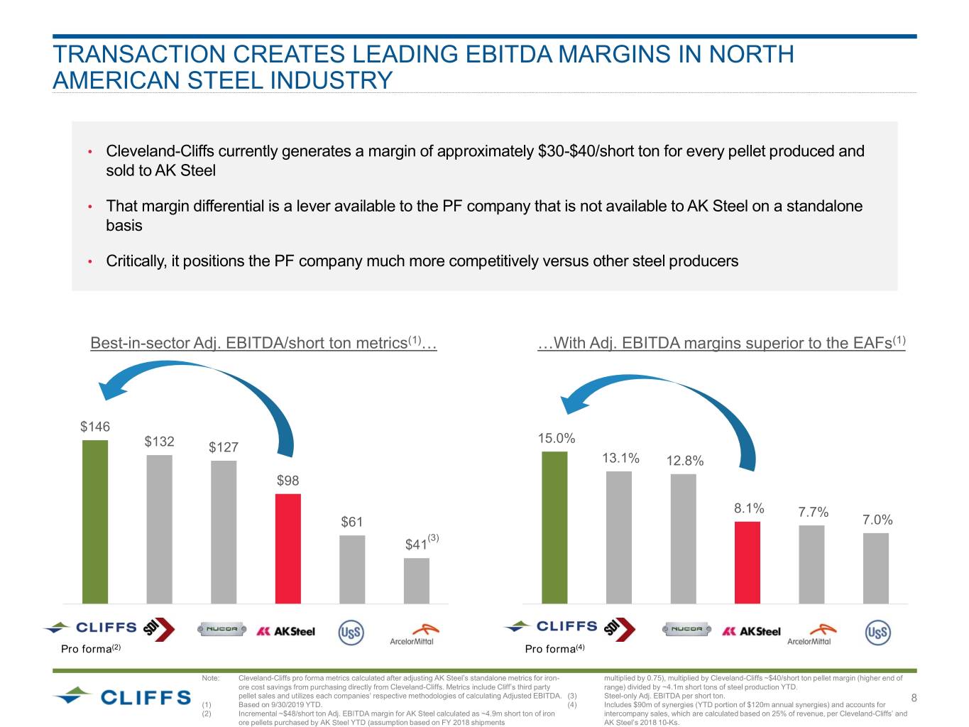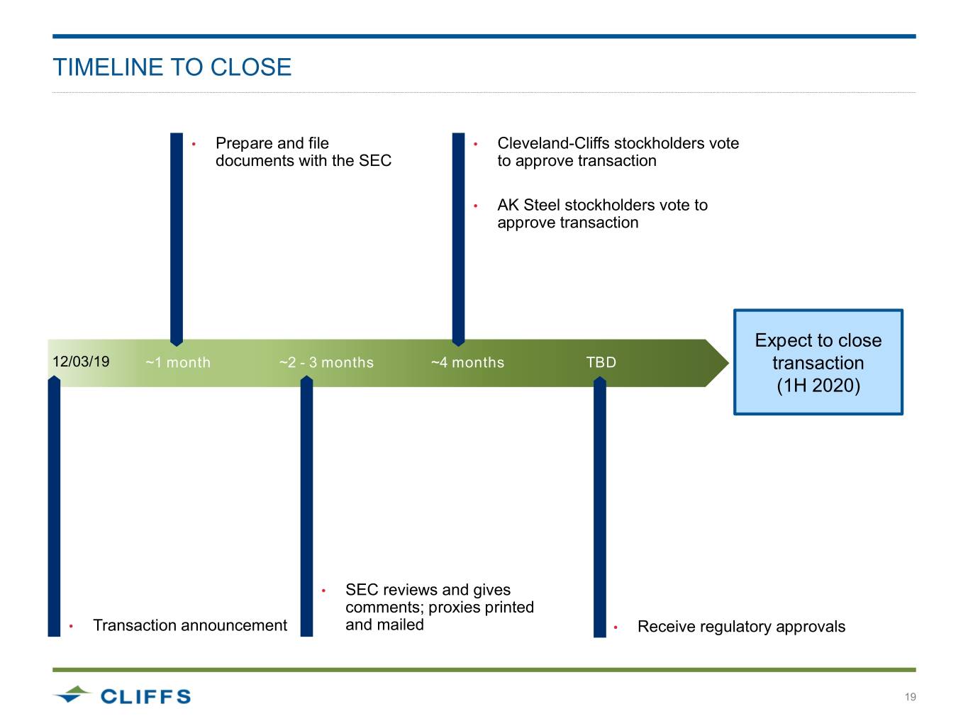 FORWARD-LOOKING STATEMENTS This presentation contains statements that constitute "forward-looking statements" within the meaning of the federal securities laws. As a general matter, forward-looking statements relate to anticipated trends and expectations rather than historical matters. Forward-looking statements are subject to uncertainties and factors relating to our operations and business environment that are difficult to predict and may be beyond our control. Such uncertainties and factors may cause actual results to differ materially from those expressed or implied by the forward-looking statements. These statements speak only as of the date of this presentation, and we undertake no ongoing obligation, other than that imposed by law, to update these statements. Uncertainties and risk factors that could affect our future performance and cause results to differ from the forward-looking statements in this presentation include, but are not limited to: our ability to successfully complete the transaction discussed in this presentation, successfully integrate the acquired business and achieve the strategic and other objectives of the proposed transaction, including achieving the expected synergies; our ability to complete the proposed merger of Cleveland-Cliffs and AK Steel on anticipated terms and timetable; our ability to obtain the required approvals by Cleveland-Cliffs’ shareholders and AK Steel’s stockholders and to satisfy various other conditions to the closing of the transaction contemplated by the merger agreement; our ability to obtain governmental approvals of the transaction on the proposed terms and schedule, and any conditions imposed on the combined company in connection with consummation of the transaction; the risk that the cost savings and any other synergies from the transaction may not be fully realized or may take longer to realize than expected; disruption from the transaction making it more difficult to maintain relationships with customers, employees or suppliers; risks relating to any unforeseen liabilities of AK Steel; uncertainty and weaknesses in global economic conditions, including downward pressure on prices caused by oversupply or imported products, reduced market demand and risks related to U.S. government actions with respect to Section 232 of the Trade Expansion Act (as amended by the Trade Act of 1974), the United States-Mexico-Canada Agreement and/or other trade agreements, treaties or policies; continued volatility of iron ore and steel prices and other trends, which may impact the price-adjustment calculations under our sales contracts; our ability to successfully diversify our product mix and add new customers beyond our traditional blast furnace clientele; our ability to cost-effectively achieve planned production rates or levels, including at our HBI plant; our ability to successfully identify and consummate any strategic investments or development projects, including our HBI plant; the impact of our customers reducing their steel production due to increased market share of steel produced using other methods or lighter-weight steel alternatives; our actual economic iron ore reserves or reductions in current mineral estimates, including whether any mineralized material qualifies as a reserve; the outcome of any contractual disputes with our customers, joint venture partners or significant energy, material or service providers or any other litigation or arbitration; problems or uncertainties with sales volume or mix, productivity, tons mined, transportation, mine closure obligations, environmental liabilities, employee-benefit costs and other risks of the mining industry; impacts of existing and increasing governmental regulation and related costs and liabilities, including failure to receive or maintain required operating and environmental permits, approvals, modifications or other authorization of, or from, any governmental or regulatory entity and costs related to implementing improvements to ensure compliance with regulatory changes; our ability to maintain adequate liquidity, our level of indebtedness and the availability of capital could limit cash flow available to fund working capital, planned capital expenditures, acquisitions and other general corporate purposes or ongoing needs of our business; our ability to continue to pay cash dividends, and the amount and timing of any cash dividends; our ability to maintain appropriate relations with unions and employees; the ability of our customers, joint venture partners and third party service providers to meet their obligations to us on a timely basis or at all; events or circumstances that could impair or adversely impact the viability of a mine or production plant and the carrying value of associated assets, as well as any resulting impairment charges; uncertainties associated with natural disasters, weather conditions, unanticipated geological conditions, supply or price of energy, equipment failures and other unexpected events; adverse changes in interest rates and tax laws; the potential existence of significant deficiencies or material weakness in our internal control over financial reporting; and the risks that are described from time to time in Cleveland-Cliffs’ and AK Steel’s respective reports filed with the SEC. For additional factors affecting the business of Cleveland-Cliffs and AK Steel, refer to Part I – Item 1A. Risk Factors of our corresponding Annual Reports on Form 10-K for the year ended December 31, 2018. You are urged to carefully consider these risk factors. This presentation includes certain non-GAAP financial measures, including Adjusted EBITDA and Free Cash Flow. Non-GAAP financial measures such as Adjusted EBITDA and Free Cash Flow should be considered only as supplemental to, and not as superior to, financial measures prepared in accordance with GAAP. Important Information About the Transaction and Where to Find It In connection with the proposed transaction