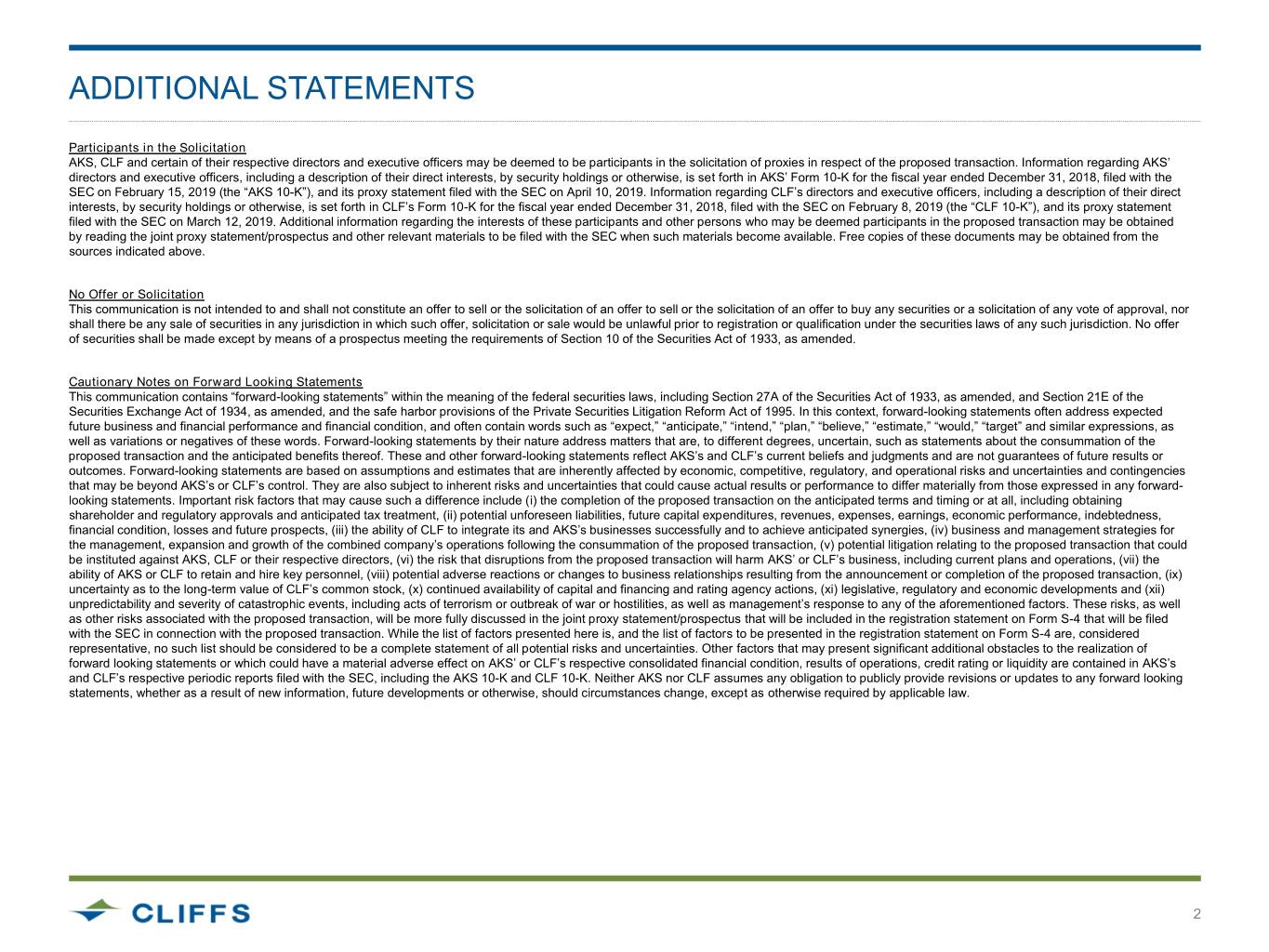 ADDITIONAL STATEMENTS Participants in the Solicitation AKS, CLF and certain of their respective directors and executive officers may be deemed to be participants in the solicitation of proxies in respect of the proposed transaction. Information regarding AKS’ directors and executive officers, including a description of their direct interests, by security holdings or otherwise, is set forth in AKS’ Form 10-K for the fiscal year ended December 31, 2018, filed with the SEC on February 15, 2019 (the “AKS 10-K”), and its proxy statement filed with the SEC on April 10, 2019. Information regarding CLF’s directors and executive officers, including a description of their direct interests, by security holdings or otherwise, is set forth in CLF’s Form 10-K for the fiscal year ended December 31, 2018, filed with the SEC on February 8, 2019 (the “CLF 10-K”), and its proxy statement filed with the SEC on March 12, 2019. Additional information regarding the interests of these participants and other persons who may be deemed participants in the proposed transaction may be obtained by reading the joint proxy statement/prospectus and other relevant materials to be filed with the SEC when such materials become available. Free copies of these documents may be obtained from the sources indicated above. No Offer or Solicitation This communication is not intended to and shall not constitute an offer to sell or the solicitation of an offer to sell or the solicitation of an offer to buy any securities or a solicitation of any vote of approval, nor shall there be any sale of securities in any jurisdiction in which such offer, solicitation or sale would be unlawful prior to registration or qualification under the securities laws of any such jurisdiction. No offer of securities shall be made except by means of a prospectus meeting the requirements of Section 10 of the Securities Act of 1933, as amended. Cautionary Notes on Forward Looking Statements This communication contains “forward-looking statements” within the meaning of the federal securities laws, including Section 27A of the Securities Act of 1933, as amended, and Section 21E of the Securities Exchange Act of 1934, as amended, and the safe harbor provisions of the Private Securities Litigation Reform Act of 1995. In this context, forward-looking statements often address expected future business and financial performance and financial condition, and often contain words such as “expect,” “anticipate,” “intend,” “plan,” “believe,” “estimate,” “would,” “target” and similar expressions, as well as variations or negatives of these words. Forward-looking statements by their nature address matters that are, to different degrees, uncertain, such as statements about the consummation of the proposed transaction and the anticipated benefits thereof. These and other forward-looking statements reflect AKS’s and CLF’s current beliefs and judgments and are not guarantees of future results or outcomes. Forward-looking statements are based on assumptions and estimates that are inherently affected by economic, competitive, regulatory, and operational risks and uncertainties and contingencies that may be beyond AKS’s or CLF’s control. They are also subject to inherent risks and uncertainties that could cause actual results or performance to differ materially from those expressed in any forward- looking statements. Important risk factors that may cause such a difference include (i) the completion of the proposed transaction on the anticipated terms and timing or at all, including obtaining shareholder and regulatory approvals and anticipated tax treatment, (ii) potential unforeseen liabilities, future capital expenditures, revenues, expenses, earnings, economic performance, indebtedness, financial condition, losses and future prospects, (iii) the ability of CLF to integrate its and AKS’s businesses successfully and to achieve anticipated synergies, (iv) business and management strategies for the management, expansion and growth of the combined company’s operations following the consummation of the proposed transaction, (v) potential litigation relating to the proposed transaction that could be instituted against AKS, CLF or their respective directors, (vi) the risk that disruptions from the proposed transaction will harm AKS’ or CLF’s business, including current plans and operations, (vii) the ability of AKS or CLF to retain and hire key personnel, (viii) potential adverse reactions or changes to business relationships resulting from the announcement or completion of the proposed transaction, (ix) uncertainty as to the long-term value of CLF’s common stock, (x) continued availability of capital and financing and rating agency actions, (xi) legislative, regulatory and economic developments and (xii) unpredictability and severity of catastrophic events, including acts of terrorism or outbreak of war or hostilities, as well as management’s response to any of the aforementioned factors. These risks, as well as other risks associated with the proposed transaction, will be more fully discussed in the joint proxy statement/prospectus that will be included in the registration statement on Form S-4 that will be filed with the SEC in connection with the proposed transaction. While the list of factors presented here is, and the list of factors to be presented in the registration statement on Form S-4 are, considered representative, no such list should be considered to be a complete statement of all potential risks and uncertainties. Other factors that may present significant additional obstacles to the realization of forward looking statements or which could have a material adverse effect on AKS’ or CLF’s respective consolidated financial condition, results of operations, credit rating or liquidity are contained in AKS’s and CLF’s respective periodic reports filed with the SEC, including the AKS 10-K and CLF 