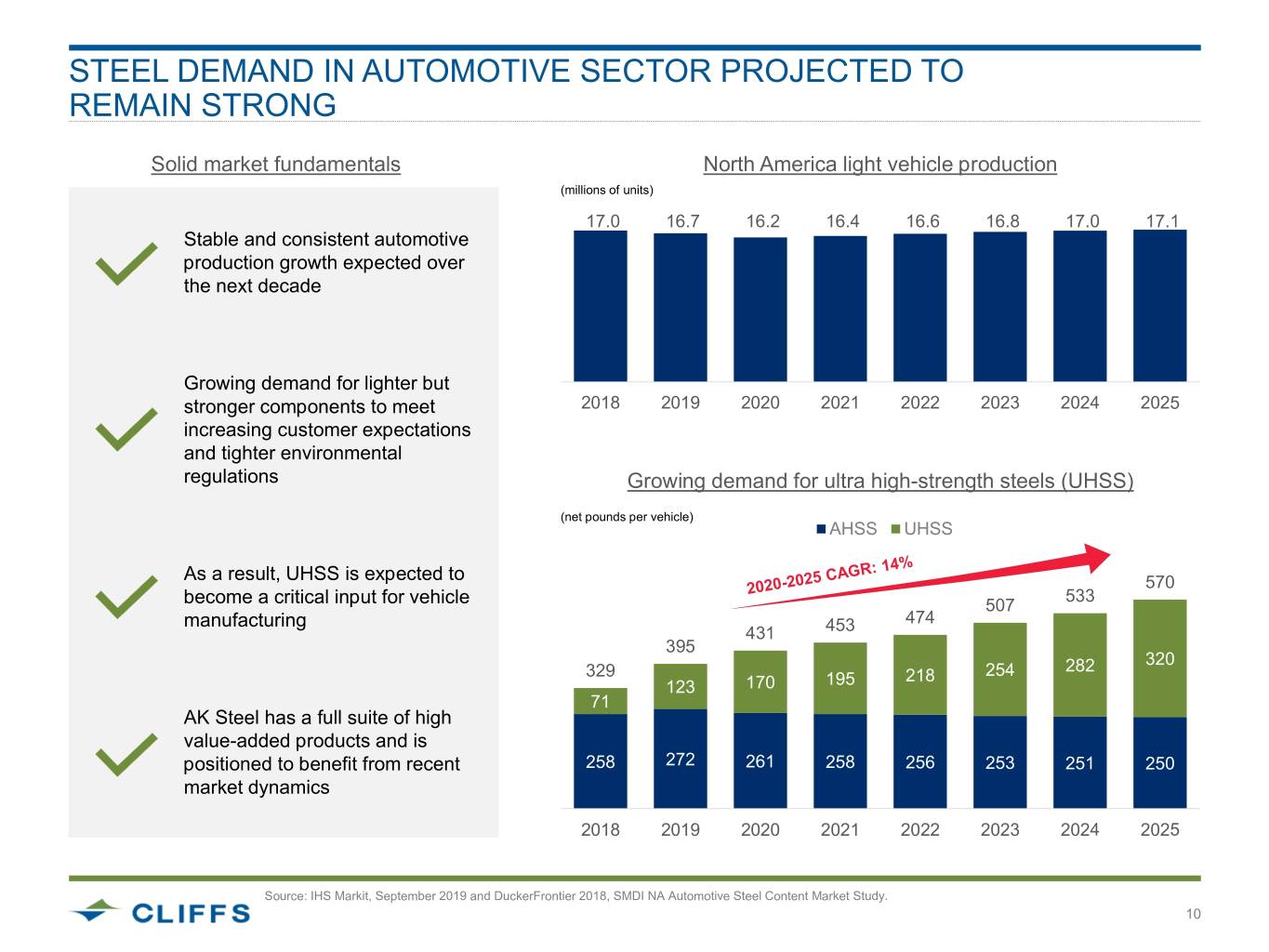 AK STEEL HAS BEST-IN-CLASS POSITION IN NON-COMMODITIZED STEEL AK Steel’s 2018A sales by end-market Automotive sales as a percentage of total sales(1) Automotive Infrastructure and manufacturing 63% Distributors and converters 22% 34% 29% 63% 25% 20% 15% 17% 12% 6% 3% • Significant North American producer • One of the few steel producers capable of producing the carbon and of grain-oriented electrical steel stainless steel grades critical to automotive lightweighting trends (“GOES”) • Technology leader in Advanced High Strength Steels (“AHSS”) and • Sole source of “U.S. origin” steel for Ultra High Strength Steels (“UHSS”) the electrical grid • U.S. leader in 400 series chrome products and automotive stainless Source: AK Steel filings and latest publicly available information for peers. (1) Based on FY 2018 sales, except for ThyssenKrupp, which is based on FY ended 9/30/19 sales, U.S. Steel and Nucor, which are based on FY 2018 9 shipments, ArcelorMittal, which is based on FY 2016 sales as per company website, Stelco, which is based on FY 2016 shipments as per its IPO prospectus.