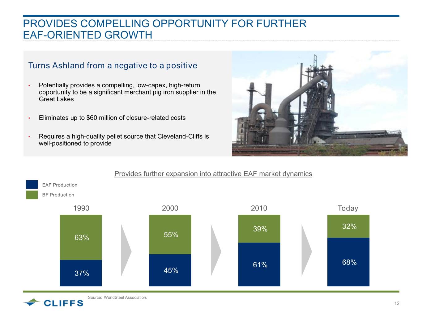 SIGNIFICANTLY DE-RISKS CLEVELAND-CLIFFS’ FUTURE PELLET OFFTAKE Illustrative shipment breakdown (current) Pro Forma – sample pellet demand breakdown (Long tons) (Long tons) Contracted through Contracted through 2026: 7-10mt 2026: 7-10mt Additional third party sales and/or Contracted through Ashland Pig Iron: 2-3mt ~20mt of 2020/2024: 4-5mt pellets Up to ~60% of AK Steel: ~6mt intercompany AK Steel: ~6mt Eliminates sales renewal risk (Expires 2022 and 2023) HBI Run-Rate: ~3mt ~5% intercompany HBI Startup: ~1mt sales Solidifies demand for substantially all of Cleveland-Cliffs’ pellets for the foreseeable future Note: For illustrative purposes: midpoints of ranges are being used to add to 20mt. 11