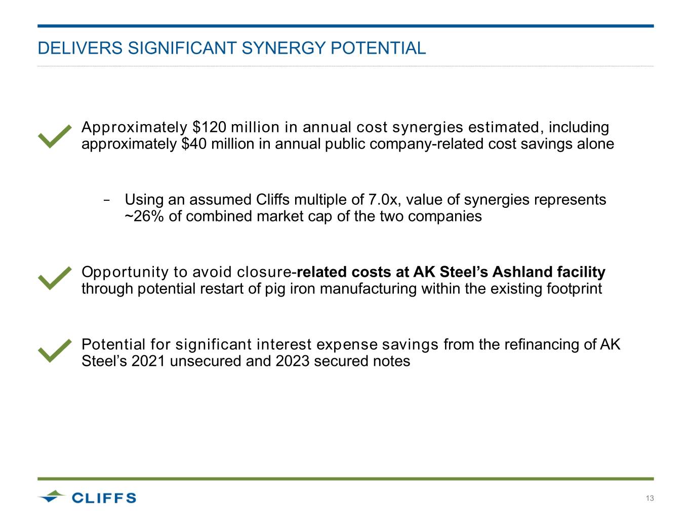 DELIVERS SIGNIFICANT SYNERGY POTENTIAL . Approximately $120 million in annual cost synergies estimated, including approximately $40 million in annual public company-related cost savings alone − Using an assumed Cliffs multiple of 7.0x, value of synergies represents ~26% of combined market cap of the two companies . Opportunity to avoid closure-related costs at AK Steel’s Ashland facility through potential restart of pig iron manufacturing within the existing footprint . Potential for significant interest expense savings from the refinancing of AK Steel’s 2021 unsecured and 2023 secured notes 13