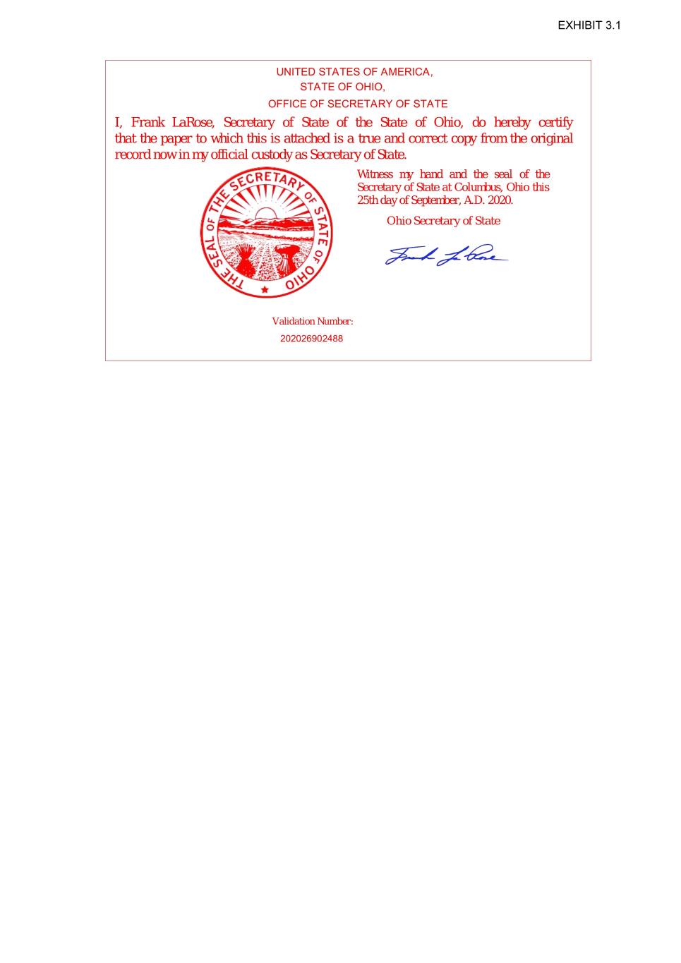 EXHIBIT 3.1 UNITED STATES OF AMERICA, STATE OF OHIO, OFFICE OF SECRETARY OF STATE I, Frank LaRose, Secretary of State of the State of Ohio, do hereby certify that the paper to which this is attached is a true and correct copy from the original record now in my official custody as Secretary of State. Witness my hand and the seal of the Secretary of State at Columbus, Ohio this 25th day of September, A.D. 2020. Ohio Secretary of State Validation Number: 202026902488