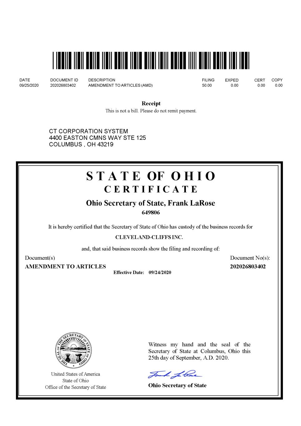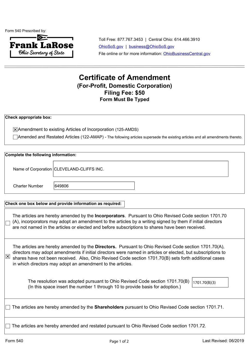 Form 540 Prescribed by: Toll Free: 877.767.3453 | Central Ohio: 614.466.3910 OhioSoS.gov | business@OhioSoS.gov File online or for more information: OhioBusinessCentral.gov Certificate of Amendment (For-Profit, Domestic Corporation) Filing Fee: $50 Form Must Be Typed Check appropriate box: Amendment to existing Articles of Incorporation (125-AMDS) Amended and Restated Articles (122-AMAP) - The following articles supersede the existing articles and all amendments thereto. Complete the following information: Name of Corporation CLEVELAND-CLIFFS INC. Charter Number 649806 Check one box below and provide information as required: The articles are hereby amended by the Incorporators. Pursuant to Ohio Revised Code section 1701.70 (A), incorporators may adopt an amendment to the articles by a writing signed by them if initial directors are not named in the articles or elected and before subscriptions to shares have been received. The articles are hereby amended by the Directors. Pursuant to Ohio Revised Code section 1701.70(A), directors may adopt amendments if initial directors were named in articles or elected, but subscriptions to shares have not been received. Also, Ohio Revised Code section 1701.70(B) sets forth additional cases in which directors may adopt an amendment to the articles. The resolution was adopted pursuant to Ohio Revised Code section 1701.70(B) 1701.70(B)(3) (In this space insert the number 1 through 10 to provide basis for adoption.) The articles are hereby amended by the Shareholders pursuant to Ohio Revised Code section 1701.71. The articles are hereby amended and restated pursuant to Ohio Revised Code section 1701.72. Form 540 Page 1 of 2 Last Revised: 06/2019