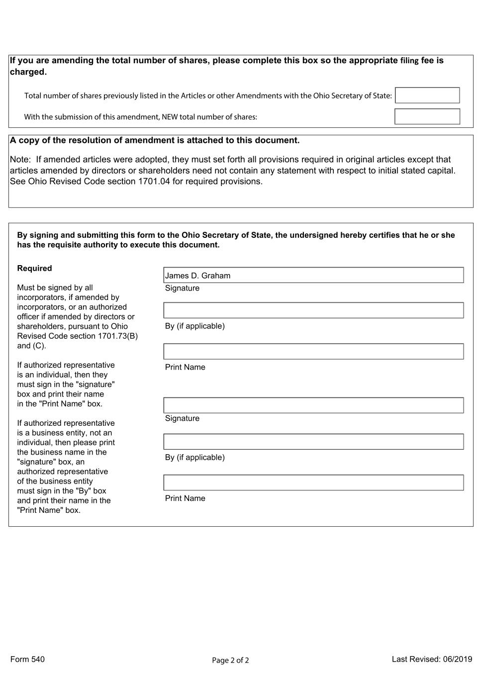 If you are amending the total number of shares, please complete this box so the appropriate filing fee is charged. Total number of shares previously listed in the Articles or other Amendments with the Ohio Secretary of State: With the submission of this amendment, NEW total number of shares: A copy of the resolution of amendment is attached to this document. Note: If amended articles were adopted, they must set forth all provisions required in original articles except that articles amended by directors or shareholders need not contain any statement with respect to initial stated capital. See Ohio Revised Code section 1701.04 for required provisions. By signing and submitting this form to the Ohio Secretary of State, the undersigned hereby certifies that he or she has the requisite authority to execute this document. Required James D. Graham Must be signed by all Signature incorporators, if amended by incorporators, or an authorized officer if amended by directors or shareholders, pursuant to Ohio By (if applicable) Revised Code section 1701.73(B) and (C). If authorized representative Print Name is an individual, then they must sign in the "signature" box and print their name in the "Print Name" box. Signature If authorized representative is a business entity, not an individual, then please print the business name in the By (if applicable) "signature" box, an authorized representative of the business entity must sign in the "By" box and print their name in the Print Name "Print Name" box. Form 540 Page 2 of 2 Last Revised: 06/2019