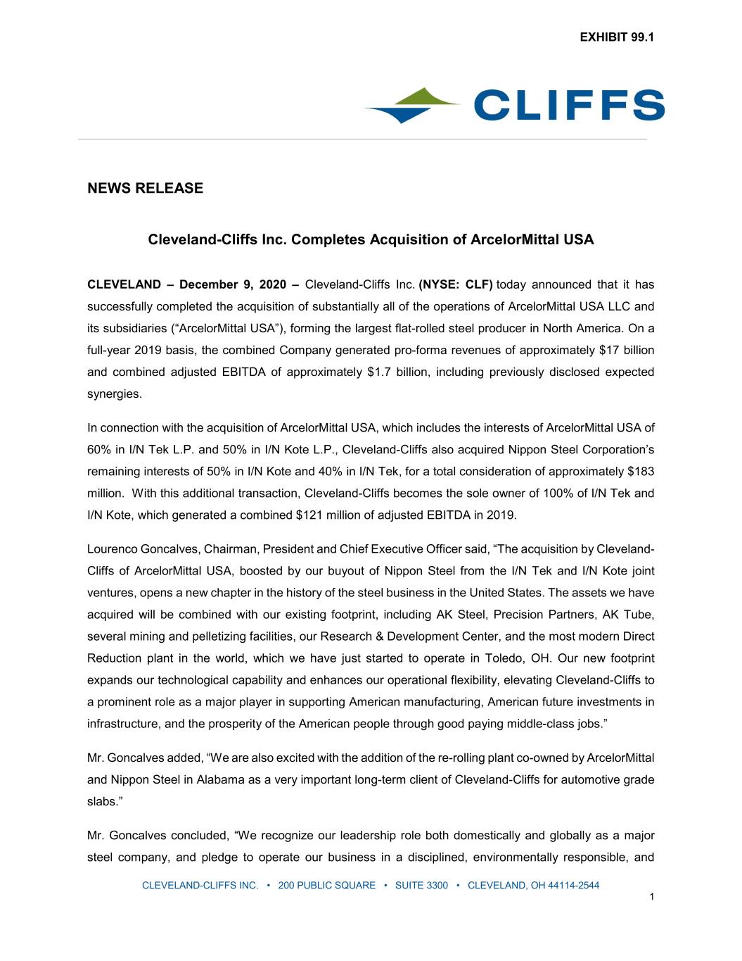 CLEVELAND-CLIFFS INC. • 200 PUBLIC SQUARE • SUITE 3300 • CLEVELAND, OH 44114-2544 1 NEWS RELEASE Cleveland-Cliffs Inc. Completes Acquisition of ArcelorMittal USA CLEVELAND – December 9, 2020 – Cleveland-Cliffs Inc. (NYSE: CLF) today announced that it has successfully completed the acquisition of substantially all of the operations of ArcelorMittal USA LLC and its subsidiaries (“ArcelorMittal USA”), forming the largest flat-rolled steel producer in North America. On a full-year 2019 basis, the combined Company generated pro-forma revenues of approximately $17 billion and combined adjusted EBITDA of approximately $1.7 billion, including previously disclosed expected synergies. In connection with the acquisition of ArcelorMittal USA, which includes the interests of ArcelorMittal USA of 60% in I/N Tek L.P. and 50% in I/N Kote L.P., Cleveland-Cliffs also acquired Nippon Steel Corporation’s remaining interests of 50% in I/N Kote and 40% in I/N Tek, for a total consideration of approximately $183 million. With this additional transaction, Cleveland-Cliffs becomes the sole owner of 100% of I/N Tek and I/N Kote, which generated a combined $121 million of adjusted EBITDA in 2019. Lourenco Goncalves, Chairman, President and Chief Executive Officer said, “The acquisition by Cleveland- Cliffs of ArcelorMittal USA, boosted by our buyout of Nippon Steel from the I/N Tek and I/N Kote joint ventures, opens a new chapter in the history of the steel business in the United States. The assets we have acquired will be combined with our existing footprint, including AK Steel, Precision Partners, AK Tube, several mining and pelletizing facilities, our Research & Development Center, and the most modern Direct Reduction plant in the world, which we have just started to operate in Toledo, OH. Our new footprint expands our technological capability and enhances our operational flexibility, elevating Cleveland-Cliffs to a prominent role as a major player in supporting American manufacturing, American future investments in infrastructure, and the prosperity of the American people through good paying middle-class jobs.” Mr. Goncalves added, “We are also excited with the addition of the re-rolling plant co-owned by ArcelorMittal and Nippon Steel in Alabama as a very important long-term client of Cleveland-Cliffs for automotive grade slabs.” Mr. Goncalves concluded, “We recognize our leadership role both domestically and globally as a major steel company, and pledge to operate our business in a disciplined, environmentally responsible, and EXHIBIT 99.1