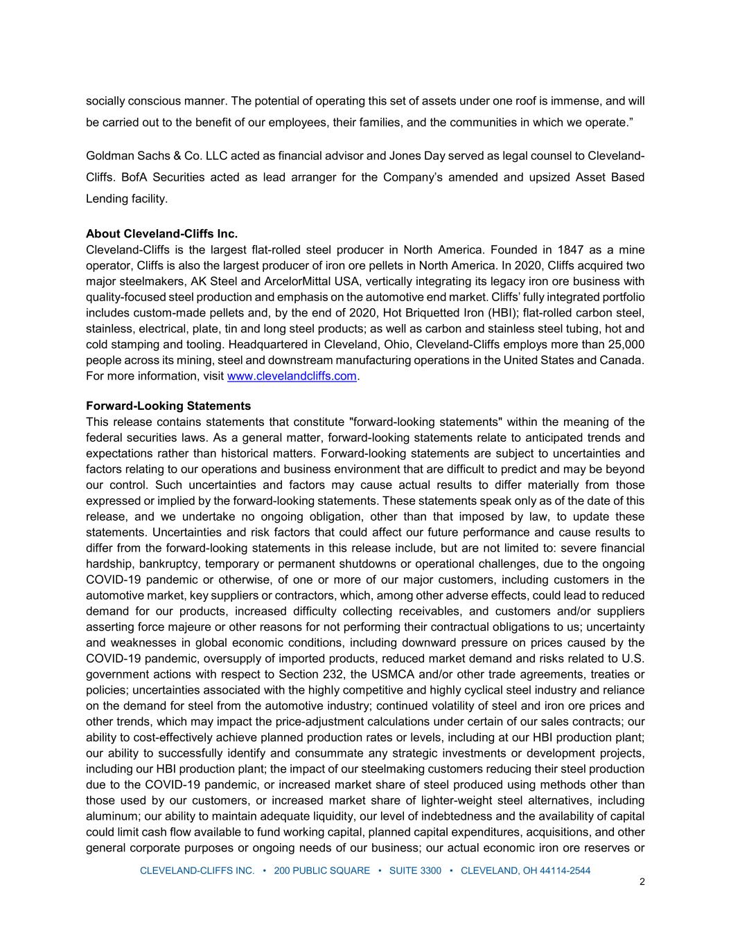 CLEVELAND-CLIFFS INC. • 200 PUBLIC SQUARE • SUITE 3300 • CLEVELAND, OH 44114-2544 2 socially conscious manner. The potential of operating this set of assets under one roof is immense, and will be carried out to the benefit of our employees, their families, and the communities in which we operate.” Goldman Sachs & Co. LLC acted as financial advisor and Jones Day served as legal counsel to Cleveland- Cliffs. BofA Securities acted as lead arranger for the Company’s amended and upsized Asset Based Lending facility. About Cleveland-Cliffs Inc. Cleveland-Cliffs is the largest flat-rolled steel producer in North America. Founded in 1847 as a mine operator, Cliffs is also the largest producer of iron ore pellets in North America. In 2020, Cliffs acquired two major steelmakers, AK Steel and ArcelorMittal USA, vertically integrating its legacy iron ore business with quality-focused steel production and emphasis on the automotive end market. Cliffs’ fully integrated portfolio includes custom-made pellets and, by the end of 2020, Hot Briquetted Iron (HBI); flat-rolled carbon steel, stainless, electrical, plate, tin and long steel products; as well as carbon and stainless steel tubing, hot and cold stamping and tooling. Headquartered in Cleveland, Ohio, Cleveland-Cliffs employs more than 25,000 people across its mining, steel and downstream manufacturing operations in the United States and Canada. For more information, visit www.clevelandcliffs.com. Forward-Looking Statements This release contains statements that constitute "forward-looking statements" within the meaning of the federal securities laws. As a general matter, forward-looking statements relate to anticipated trends and expectations rather than historical matters. Forward-looking statements are subject to uncertainties and factors relating to our operations and business environment that are difficult to predict and may be beyond our control. Such uncertainties and factors may cause actual results to differ materially from those expressed or implied by the forward-looking statements. These statements speak only as of the date of this release, and we undertake no ongoing obligation, other than that imposed by law, to update these statements. Uncertainties and risk factors that could affect our future performance and cause results to differ from the forward-looking statements in this release include, but are not limited to: severe financial hardship, bankruptcy, temporary or permanent shutdowns or operational challenges, due to the ongoing COVID-19 pandemic or otherwise, of one or more of our major customers, including customers in the automotive market, key suppliers or contractors, which, among other adverse effects, could lead to reduced demand for our products, increased difficulty collecting receivables, and customers and/or suppliers asserting force majeure or other reasons for not performing their contractual obligations to us; uncertainty and weaknesses in global economic conditions, including downward pressure on prices caused by the COVID-19 pandemic, oversupply of imported products, reduced market demand and risks related to U.S. government actions with respect to Section 232, the USMCA and/or other trade agreements, treaties or policies; uncertainties associated with the highly competitive and highly cyclical steel industry and reliance on the demand for steel from the automotive industry; continued volatility of steel and iron ore prices and other trends, which may impact the price-adjustment calculations under certain of our sales contracts; our ability to cost-effectively achieve planned production rates or levels, including at our HBI production plant; our ability to successfully identify and consummate any strategic investments or development projects, including our HBI production plant; the impact of our steelmaking customers reducing their steel production due to the COVID-19 pandemic, or increased market share of steel produced using methods other than those used by our customers, or increased market share of lighter-weight steel alternatives, including aluminum; our ability to maintain adequate liquidity, our level of indebtedness and the availability of capital could limit cash flow available to fund working capital, planned capital expenditures, acquisitions, and other general corporate purposes or ongoing needs of our business; our actual economic iron ore reserves or