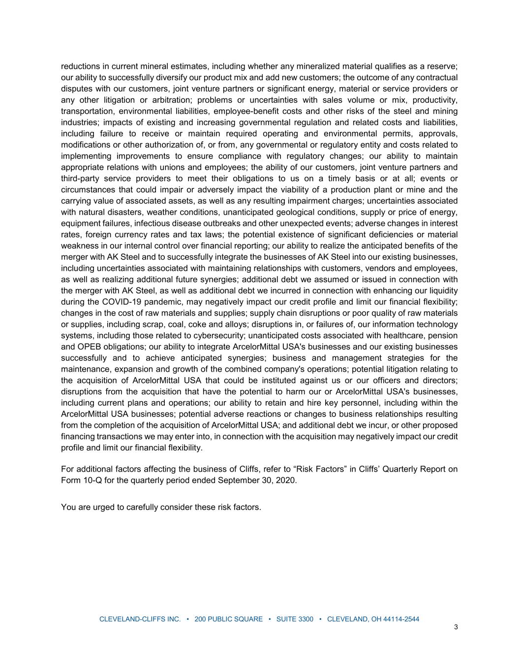 CLEVELAND-CLIFFS INC. • 200 PUBLIC SQUARE • SUITE 3300 • CLEVELAND, OH 44114-2544 3 reductions in current mineral estimates, including whether any mineralized material qualifies as a reserve; our ability to successfully diversify our product mix and add new customers; the outcome of any contractual disputes with our customers, joint venture partners or significant energy, material or service providers or any other litigation or arbitration; problems or uncertainties with sales volume or mix, productivity, transportation, environmental liabilities, employee-benefit costs and other risks of the steel and mining industries; impacts of existing and increasing governmental regulation and related costs and liabilities, including failure to receive or maintain required operating and environmental permits, approvals, modifications or other authorization of, or from, any governmental or regulatory entity and costs related to implementing improvements to ensure compliance with regulatory changes; our ability to maintain appropriate relations with unions and employees; the ability of our customers, joint venture partners and third-party service providers to meet their obligations to us on a timely basis or at all; events or circumstances that could impair or adversely impact the viability of a production plant or mine and the carrying value of associated assets, as well as any resulting impairment charges; uncertainties associated with natural disasters, weather conditions, unanticipated geological conditions, supply or price of energy, equipment failures, infectious disease outbreaks and other unexpected events; adverse changes in interest rates, foreign currency rates and tax laws; the potential existence of significant deficiencies or material weakness in our internal control over financial reporting; our ability to realize the anticipated benefits of the merger with AK Steel and to successfully integrate the businesses of AK Steel into our existing businesses, including uncertainties associated with maintaining relationships with customers, vendors and employees, as well as realizing additional future synergies; additional debt we assumed or issued in connection with the merger with AK Steel, as well as additional debt we incurred in connection with enhancing our liquidity during the COVID-19 pandemic, may negatively impact our credit profile and limit our financial flexibility; changes in the cost of raw materials and supplies; supply chain disruptions or poor quality of raw materials or supplies, including scrap, coal, coke and alloys; disruptions in, or failures of, our information technology systems, including those related to cybersecurity; unanticipated costs associated with healthcare, pension and OPEB obligations; our ability to integrate ArcelorMittal USA's businesses and our existing businesses successfully and to achieve anticipated synergies; business and management strategies for the maintenance, expansion and growth of the combined company's operations; potential litigation relating to the acquisition of ArcelorMittal USA that could be instituted against us or our officers and directors; disruptions from the acquisition that have the potential to harm our or ArcelorMittal USA's businesses, including current plans and operations; our ability to retain and hire key personnel, including within the ArcelorMittal USA businesses; potential adverse reactions or changes to business relationships resulting from the completion of the acquisition of ArcelorMittal USA; and additional debt we incur, or other proposed financing transactions we may enter into, in connection with the acquisition may negatively impact our credit profile and limit our financial flexibility. For additional factors affecting the business of Cliffs, refer to “Risk Factors” in Cliffs’ Quarterly Report on Form 10-Q for the quarterly period ended September 30, 2020. You are urged to carefully consider these risk factors.