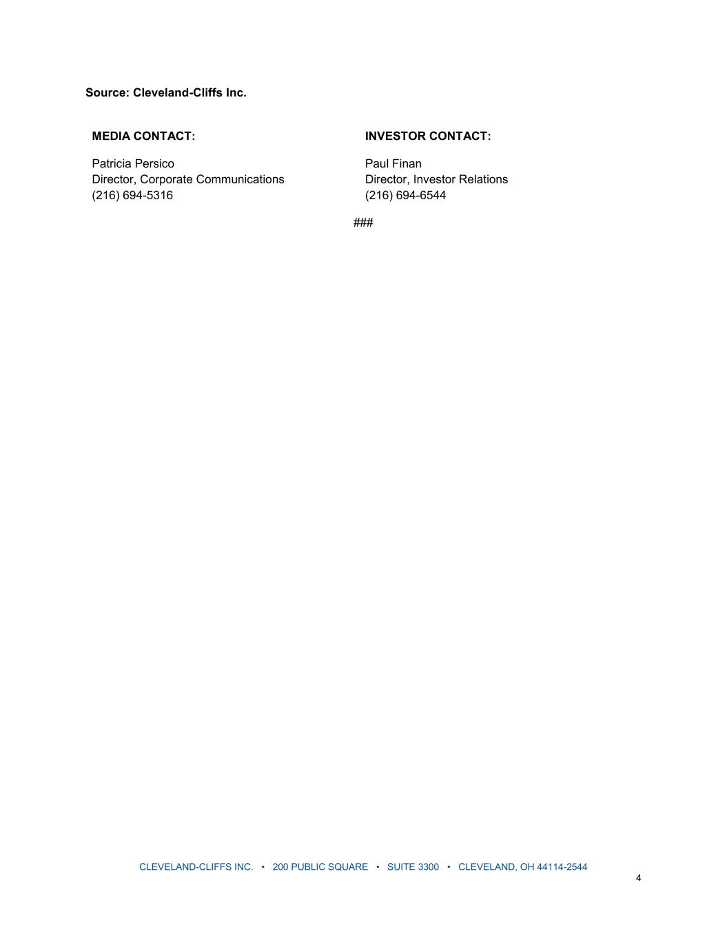 CLEVELAND-CLIFFS INC. • 200 PUBLIC SQUARE • SUITE 3300 • CLEVELAND, OH 44114-2544 4 Source: Cleveland-Cliffs Inc. MEDIA CONTACT: Patricia Persico Director, Corporate Communications (216) 694-5316 INVESTOR CONTACT: Paul Finan Director, Investor Relations (216) 694-6544 ###