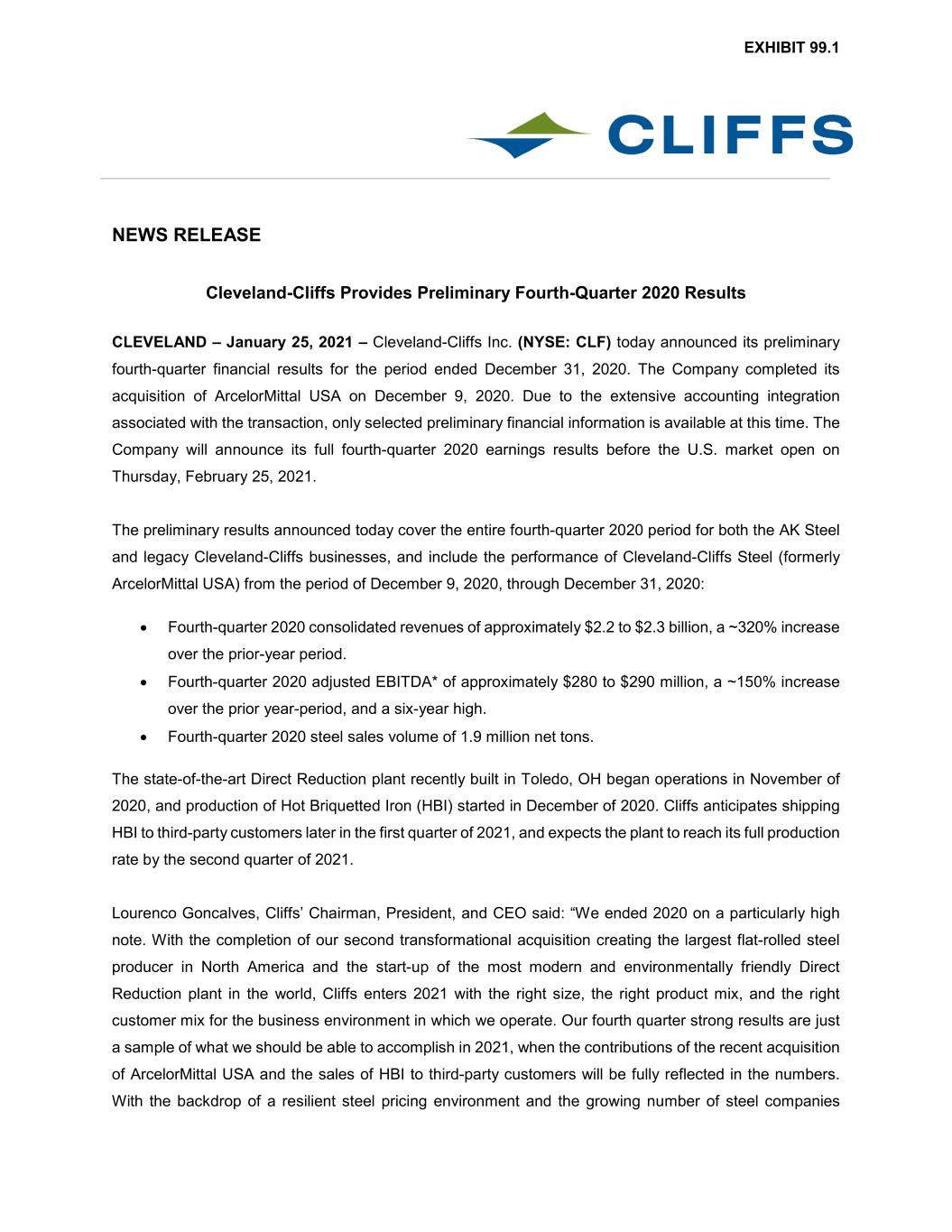 NEWS RELEASE Cleveland-Cliffs Provides Preliminary Fourth-Quarter 2020 Results CLEVELAND – January 25, 2021 – Cleveland-Cliffs Inc. (NYSE: CLF) today announced its preliminary fourth-quarter financial results for the period ended December 31, 2020. The Company completed its acquisition of ArcelorMittal USA on December 9, 2020. Due to the extensive accounting integration associated with the transaction, only selected preliminary financial information is available at this time. The Company will announce its full fourth-quarter 2020 earnings results before the U.S. market open on Thursday, February 25, 2021. The preliminary results announced today cover the entire fourth-quarter 2020 period for both the AK Steel and legacy Cleveland-Cliffs businesses, and include the performance of Cleveland-Cliffs Steel (formerly ArcelorMittal USA) from the period of December 9, 2020, through December 31, 2020: • Fourth-quarter 2020 consolidated revenues of approximately $2.2 to $2.3 billion, a ~320% increase over the prior-year period. • Fourth-quarter 2020 adjusted EBITDA* of approximately $280 to $290 million, a ~150% increase over the prior year-period, and a six-year high. • Fourth-quarter 2020 steel sales volume of 1.9 million net tons. The state-of-the-art Direct Reduction plant recently built in Toledo, OH began operations in November of 2020, and production of Hot Briquetted Iron (HBI) started in December of 2020. Cliffs anticipates shipping HBI to third-party customers later in the first quarter of 2021, and expects the plant to reach its full production rate by the second quarter of 2021. Lourenco Goncalves, Cliffs’ Chairman, President, and CEO said: “We ended 2020 on a particularly high note. With the completion of our second transformational acquisition creating the largest flat-rolled steel producer in North America and the start-up of the most modern and environmentally friendly Direct Reduction plant in the world, Cliffs enters 2021 with the right size, the right product mix, and the right customer mix for the business environment in which we operate. Our fourth quarter strong results are just a sample of what we should be able to accomplish in 2021, when the contributions of the recent acquisition of ArcelorMittal USA and the sales of HBI to third-party customers will be fully reflected in the numbers. With the backdrop of a resilient steel pricing environment and the growing number of steel companies EXHIBIT 99.1