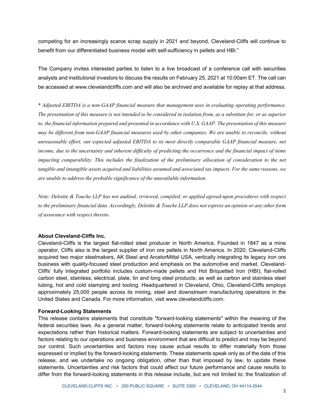 CLEVELAND-CLIFFS INC. • 200 PUBLIC SQUARE • SUITE 3300 • CLEVELAND, OH 44114-2544 2 competing for an increasingly scarce scrap supply in 2021 and beyond, Cleveland-Cliffs will continue to benefit from our differentiated business model with self-sufficiency in pellets and HBI.” The Company invites interested parties to listen to a live broadcast of a conference call with securities analysts and institutional investors to discuss the results on February 25, 2021 at 10:00am ET. The call can be accessed at www.clevelandcliffs.com and will also be archived and available for replay at that address. * Adjusted EBITDA is a non-GAAP financial measure that management uses in evaluating operating performance. The presentation of this measure is not intended to be considered in isolation from, as a substitute for, or as superior to, the financial information prepared and presented in accordance with U.S. GAAP. The presentation of this measure may be different from non-GAAP financial measures used by other companies. We are unable to reconcile, without unreasonable effort, our expected adjusted EBITDA to its most directly comparable GAAP financial measure, net income, due to the uncertainty and inherent difficulty of predicting the occurrence and the financial impact of items impacting comparability. This includes the finalization of the preliminary allocation of consideration to the net tangible and intangible assets acquired and liabilities assumed and associated tax impacts. For the same reasons, we are unable to address the probable significance of the unavailable information. Note: Deloitte & Touche LLP has not audited, reviewed, compiled, or applied agreed-upon procedures with respect to the preliminary financial data. Accordingly, Deloitte & Touche LLP does not express an opinion or any other form of assurance with respect thereto. About Cleveland-Cliffs Inc. Cleveland-Cliffs is the largest flat-rolled steel producer in North America. Founded in 1847 as a mine operator, Cliffs also is the largest supplier of iron ore pellets in North America. In 2020, Cleveland-Cliffs acquired two major steelmakers, AK Steel and ArcelorMittal USA, vertically integrating its legacy iron ore business with quality-focused steel production and emphasis on the automotive end market. Cleveland- Cliffs’ fully integrated portfolio includes custom-made pellets and Hot Briquetted Iron (HBI); flat-rolled carbon steel, stainless, electrical, plate, tin and long steel products; as well as carbon and stainless steel tubing, hot and cold stamping and tooling. Headquartered in Cleveland, Ohio, Cleveland-Cliffs employs approximately 25,000 people across its mining, steel and downstream manufacturing operations in the United States and Canada. For more information, visit www.clevelandcliffs.com. Forward-Looking Statements This release contains statements that constitute "forward-looking statements" within the meaning of the federal securities laws. As a general matter, forward-looking statements relate to anticipated trends and expectations rather than historical matters. Forward-looking statements are subject to uncertainties and factors relating to our operations and business environment that are difficult to predict and may be beyond our control. Such uncertainties and factors may cause actual results to differ materially from those expressed or implied by the forward-looking statements. These statements speak only as of the date of this release, and we undertake no ongoing obligation, other than that imposed by law, to update these statements. Uncertainties and risk factors that could affect our future performance and cause results to differ from the forward-looking statements in this release include, but are not limited to: the finalization of