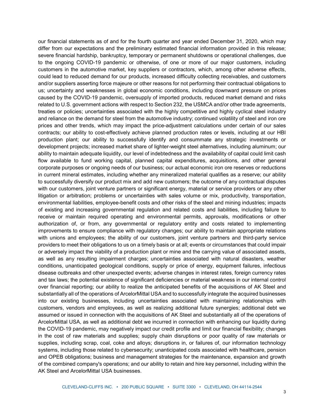 CLEVELAND-CLIFFS INC. • 200 PUBLIC SQUARE • SUITE 3300 • CLEVELAND, OH 44114-2544 3 our financial statements as of and for the fourth quarter and year ended December 31, 2020, which may differ from our expectations and the preliminary estimated financial information provided in this release; severe financial hardship, bankruptcy, temporary or permanent shutdowns or operational challenges, due to the ongoing COVID-19 pandemic or otherwise, of one or more of our major customers, including customers in the automotive market, key suppliers or contractors, which, among other adverse effects, could lead to reduced demand for our products, increased difficulty collecting receivables, and customers and/or suppliers asserting force majeure or other reasons for not performing their contractual obligations to us; uncertainty and weaknesses in global economic conditions, including downward pressure on prices caused by the COVID-19 pandemic, oversupply of imported products, reduced market demand and risks related to U.S. government actions with respect to Section 232, the USMCA and/or other trade agreements, treaties or policies; uncertainties associated with the highly competitive and highly cyclical steel industry and reliance on the demand for steel from the automotive industry; continued volatility of steel and iron ore prices and other trends, which may impact the price-adjustment calculations under certain of our sales contracts; our ability to cost-effectively achieve planned production rates or levels, including at our HBI production plant; our ability to successfully identify and consummate any strategic investments or development projects; increased market share of lighter-weight steel alternatives, including aluminum; our ability to maintain adequate liquidity, our level of indebtedness and the availability of capital could limit cash flow available to fund working capital, planned capital expenditures, acquisitions, and other general corporate purposes or ongoing needs of our business; our actual economic iron ore reserves or reductions in current mineral estimates, including whether any mineralized material qualifies as a reserve; our ability to successfully diversify our product mix and add new customers; the outcome of any contractual disputes with our customers, joint venture partners or significant energy, material or service providers or any other litigation or arbitration; problems or uncertainties with sales volume or mix, productivity, transportation, environmental liabilities, employee-benefit costs and other risks of the steel and mining industries; impacts of existing and increasing governmental regulation and related costs and liabilities, including failure to receive or maintain required operating and environmental permits, approvals, modifications or other authorization of, or from, any governmental or regulatory entity and costs related to implementing improvements to ensure compliance with regulatory changes; our ability to maintain appropriate relations with unions and employees; the ability of our customers, joint venture partners and third-party service providers to meet their obligations to us on a timely basis or at all; events or circumstances that could impair or adversely impact the viability of a production plant or mine and the carrying value of associated assets, as well as any resulting impairment charges; uncertainties associated with natural disasters, weather conditions, unanticipated geological conditions, supply or price of energy, equipment failures, infectious disease outbreaks and other unexpected events; adverse changes in interest rates, foreign currency rates and tax laws; the potential existence of significant deficiencies or material weakness in our internal control over financial reporting; our ability to realize the anticipated benefits of the acquisitions of AK Steel and substantially all of the operations of ArcelorMittal USA and to successfully integrate the acquired businesses into our existing businesses, including uncertainties associated with maintaining relationships with customers, vendors and employees, as well as realizing additional future synergies; additional debt we assumed or issued in connection with the acquisitions of AK Steel and substantially all of the operations of ArcelorMittal USA, as well as additional debt we incurred in connection with enhancing our liquidity during the COVID-19 pandemic, may negatively impact our credit profile and limit our financial flexibility; changes in the cost of raw materials and supplies; supply chain disruptions or poor quality of raw materials or supplies, including scrap, coal, coke and alloys; disruptions in, or failures of, our information technology systems, including those related to cybersecurity; unanticipated costs associated with healthcare, pension and OPEB obligations; business and management strategies for the maintenance, expansion and growth of the combined company's operations; and our ability to retain and hire key personnel, including within the AK Steel and ArcelorMittal USA businesses.