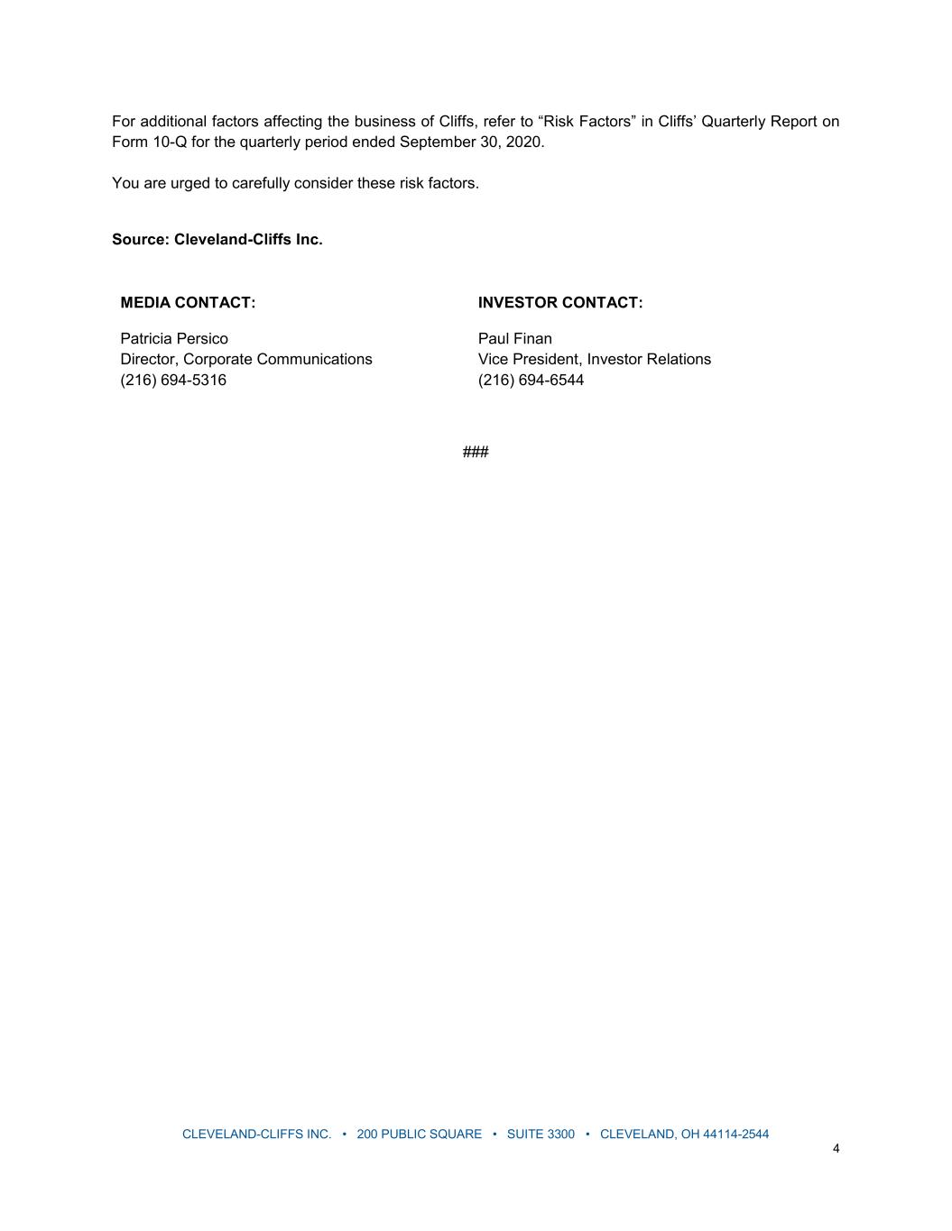 CLEVELAND-CLIFFS INC. • 200 PUBLIC SQUARE • SUITE 3300 • CLEVELAND, OH 44114-2544 4 For additional factors affecting the business of Cliffs, refer to “Risk Factors” in Cliffs’ Quarterly Report on Form 10-Q for the quarterly period ended September 30, 2020. You are urged to carefully consider these risk factors. Source: Cleveland-Cliffs Inc. MEDIA CONTACT: Patricia Persico Director, Corporate Communications (216) 694-5316 INVESTOR CONTACT: Paul Finan Vice President, Investor Relations (216) 694-6544 ###