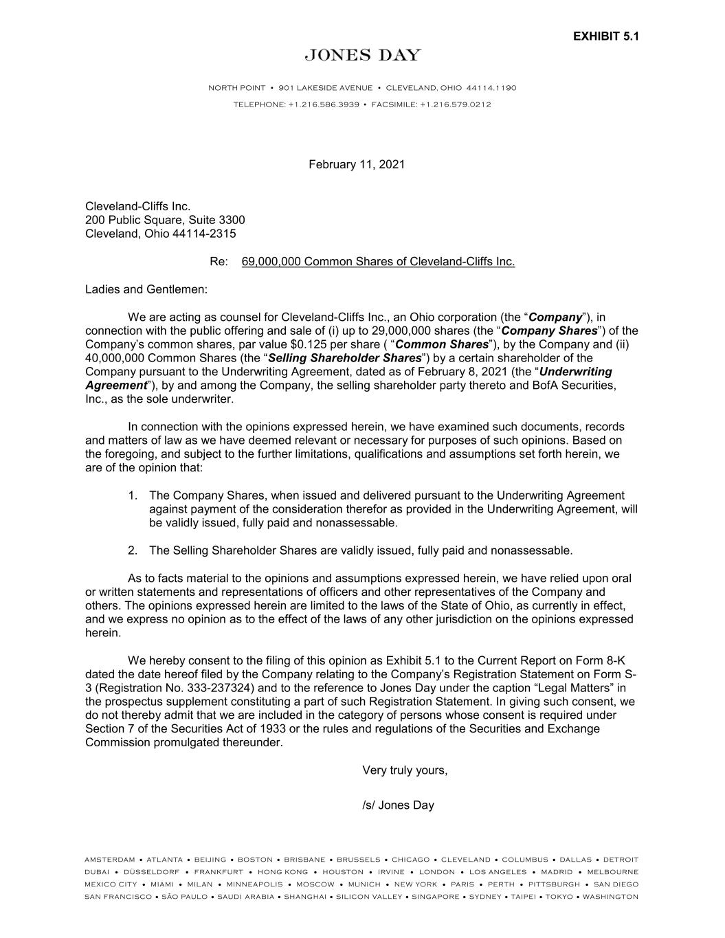 NORTH POINT • 901 LAKESIDE AVENUE • CLEVELAND, OHIO 44114.1190 TELEPHONE: +1.216.586.3939 • FACSIMILE: +1.216.579.0212 AMSTERDAM • ATL ANTA • BEIJING • BOSTON • BRISBANE • BRUSSELS • CHICAGO • CLEVEL AND • COLUMBUS • DALL AS • DETROIT DUBAI • DÜSSELDORF • FRANKFURT • HONG KONG • HOUSTON • IRVINE • LONDON • LOS ANGELES • MADRID • MELBOURNE MEXICO CIT Y • MIAMI • MIL AN • MINNEAPOLIS • MOSCOW • MUNICH • NEW YORK • PARIS • PERTH • PITTSBURGH • SAN DIEGO SAN FRANCISCO • SÃO PAULO • SAUDI ARABIA • SHANGHAI • SILICON VALLEY • SINGAPORE • SYDNEY • TAIPEI • TOKYO • WASHINGTON February 11, 2021 Cleveland-Cliffs Inc. 200 Public Square, Suite 3300 Cleveland, Ohio 44114-2315 Re: 69,000,000 Common Shares of Cleveland-Cliffs Inc. Ladies and Gentlemen: We are acting as counsel for Cleveland-Cliffs Inc., an Ohio corporation (the “Company”), in connection with the public offering and sale of (i) up to 29,000,000 shares (the “Company Shares”) of the Company’s common shares, par value $0.125 per share ( “Common Shares”), by the Company and (ii) 40,000,000 Common Shares (the “Selling Shareholder Shares”) by a certain shareholder of the Company pursuant to the Underwriting Agreement, dated as of February 8, 2021 (the “Underwriting Agreement”), by and among the Company, the selling shareholder party thereto and BofA Securities, Inc., as the sole underwriter. In connection with the opinions expressed herein, we have examined such documents, records and matters of law as we have deemed relevant or necessary for purposes of such opinions. Based on the foregoing, and subject to the further limitations, qualifications and assumptions set forth herein, we are of the opinion that: 1. The Company Shares, when issued and delivered pursuant to the Underwriting Agreement against payment of the consideration therefor as provided in the Underwriting Agreement, will be validly issued, fully paid and nonassessable. 2. The Selling Shareholder Shares are validly issued, fully paid and nonassessable. As to facts material to the opinions and assumptions expressed herein, we have relied upon oral or written statements and representations of officers and other representatives of the Company and others. The opinions expressed herein are limited to the laws of the State of Ohio, as currently in effect, and we express no opinion as to the effect of the laws of any other jurisdiction on the opinions expressed herein. We hereby consent to the filing of this opinion as Exhibit 5.1 to the Current Report on Form 8-K dated the date hereof filed by the Company relating to the Company’s Registration Statement on Form S- 3 (Registration No. 333-237324) and to the reference to Jones Day under the caption “Legal Matters” in the prospectus supplement constituting a part of such Registration Statement. In giving such consent, we do not thereby admit that we are included in the category of persons whose consent is required under Section 7 of the Securities Act of 1933 or the rules and regulations of the Securities and Exchange Commission promulgated thereunder. Very truly yours, /s/ Jones Day EXHIBIT 5.1
