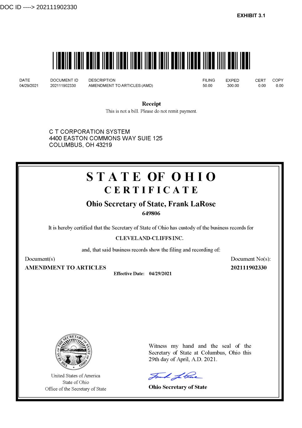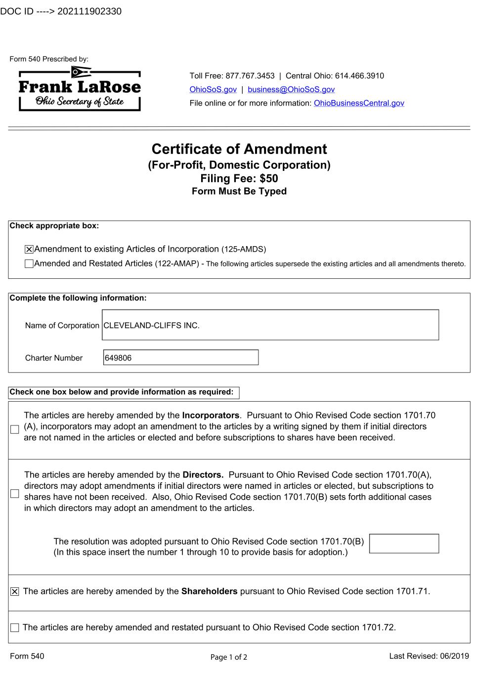 DOC ID ----> 202111902330 Page 1 of 2Form 540 Last Revised: 06/2019 Toll Free: 877.767.3453 | Central Ohio: 614.466.3910 OhioSoS.gov | business@OhioSoS.gov File online or for more information: OhioBusinessCentral.gov Certificate of Amendment (For-Profit, Domestic Corporation) Filing Fee: $50 Form Must Be Typed Check appropriate box: Amendment to existing Articles of Incorporation (125-AMDS) Amended and Restated Articles (122-AMAP) - The following articles supersede the existing articles and all amendments thereto. Name of Corporation Charter Number The articles are hereby amended by the Incorporators. Pursuant to Ohio Revised Code section 1701.70 (A), incorporators may adopt an amendment to the articles by a writing signed by them if initial directors are not named in the articles or elected and before subscriptions to shares have been received. The articles are hereby amended by the Directors. Pursuant to Ohio Revised Code section 1701.70(A), directors may adopt amendments if initial directors were named in articles or elected, but subscriptions to shares have not been received. Also, Ohio Revised Code section 1701.70(B) sets forth additional cases in which directors may adopt an amendment to the articles. The articles are hereby amended by the Shareholders pursuant to Ohio Revised Code section 1701.71. The articles are hereby amended and restated pursuant to Ohio Revised Code section 1701.72. The resolution was adopted pursuant to Ohio Revised Code section 1701.70(B) (In this space insert the number 1 through 10 to provide basis for adoption.) Check one box below and provide information as required: Complete the following information: Form 540 Prescribed by: CLEVELAND-CLIFFS INC. 649806