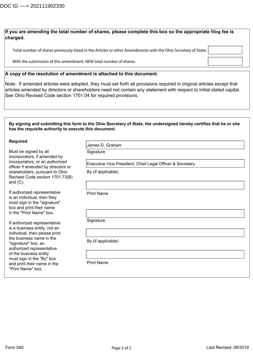 DOC ID ----> 202111902330 Page 2 of 2Form 540 Last Revised: 06/2019 A copy of the resolution of amendment is attached to this document. Note: If amended articles were adopted, they must set forth all provisions required in original articles except that articles amended by directors or shareholders need not contain any statement with respect to initial stated capital. See Ohio Revised Code section 1701.04 for required provisions. If you are amending the total number of shares, please complete this box so the appropriate filing fee is charged. Total number of shares previously listed in the Articles or other Amendments with the Ohio Secretary of State: With the submission of this amendment, NEW total number of shares: Print Name By (if applicable) Signature Print Name By (if applicable) Signature By signing and submitting this form to the Ohio Secretary of State, the undersigned hereby certifies that he or she has the requisite authority to execute this document. Required Must be signed by all incorporators, if amended by incorporators, or an authorized officer if amended by directors or shareholders, pursuant to Ohio Revised Code section 1701.73(B) and (C). If authorized representative is an individual, then they must sign in the "signature" box and print their name in the "Print Name" box. If authorized representative is a business entity, not an individual, then please print the business name in the "signature" box, an authorized representative of the business entity must sign in the "By" box and print their name in the "Print Name" box. Executive Vice President, Chief Legal Officer & Secretary James D. Graham