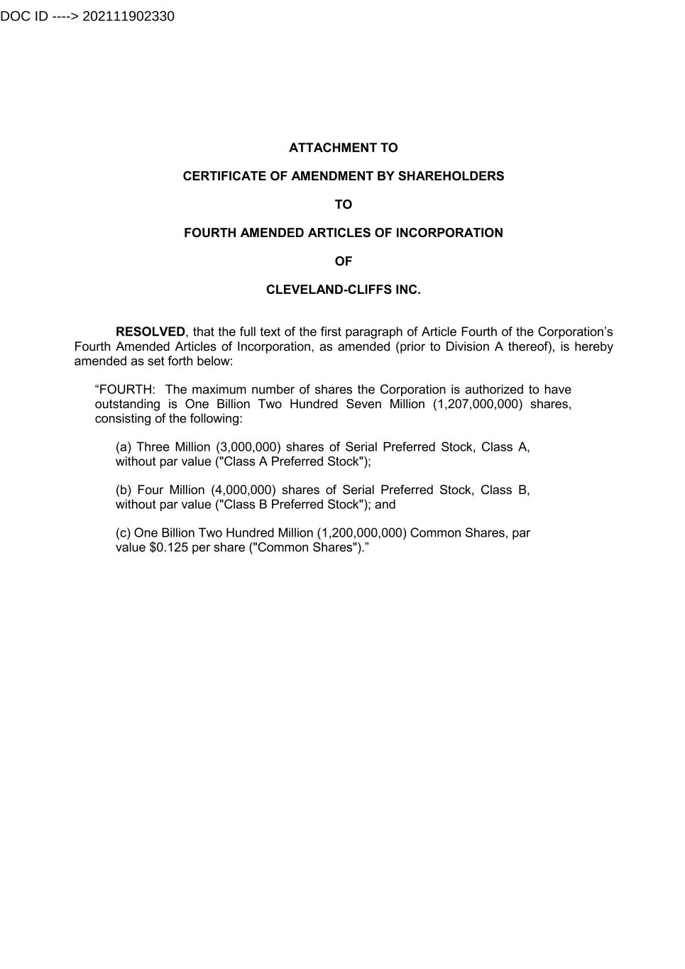 DOC ID ----> 202111902330 ATTACHMENT TO CERTIFICATE OF AMENDMENT BY SHAREHOLDERS TO FOURTH AMENDED ARTICLES OF INCORPORATION OF CLEVELAND-CLIFFS INC. RESOLVED, that the full text of the first paragraph of Article Fourth of the Corporation’s Fourth Amended Articles of Incorporation, as amended (prior to Division A thereof), is hereby amended as set forth below: “FOURTH: The maximum number of shares the Corporation is authorized to have outstanding is One Billion Two Hundred Seven Million (1,207,000,000) shares, consisting of the following: (a) Three Million (3,000,000) shares of Serial Preferred Stock, Class A, without par value ("Class A Preferred Stock"); (b) Four Million (4,000,000) shares of Serial Preferred Stock, Class B, without par value ("Class B Preferred Stock"); and (c) One Billion Two Hundred Million (1,200,000,000) Common Shares, par value $0.125 per share ("Common Shares").”
