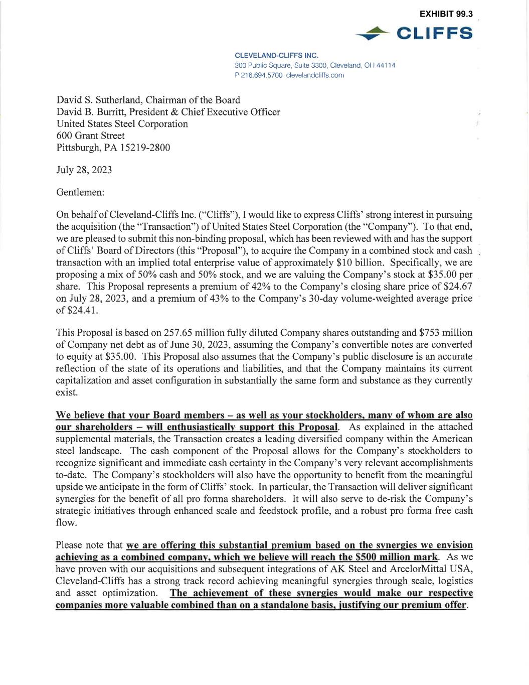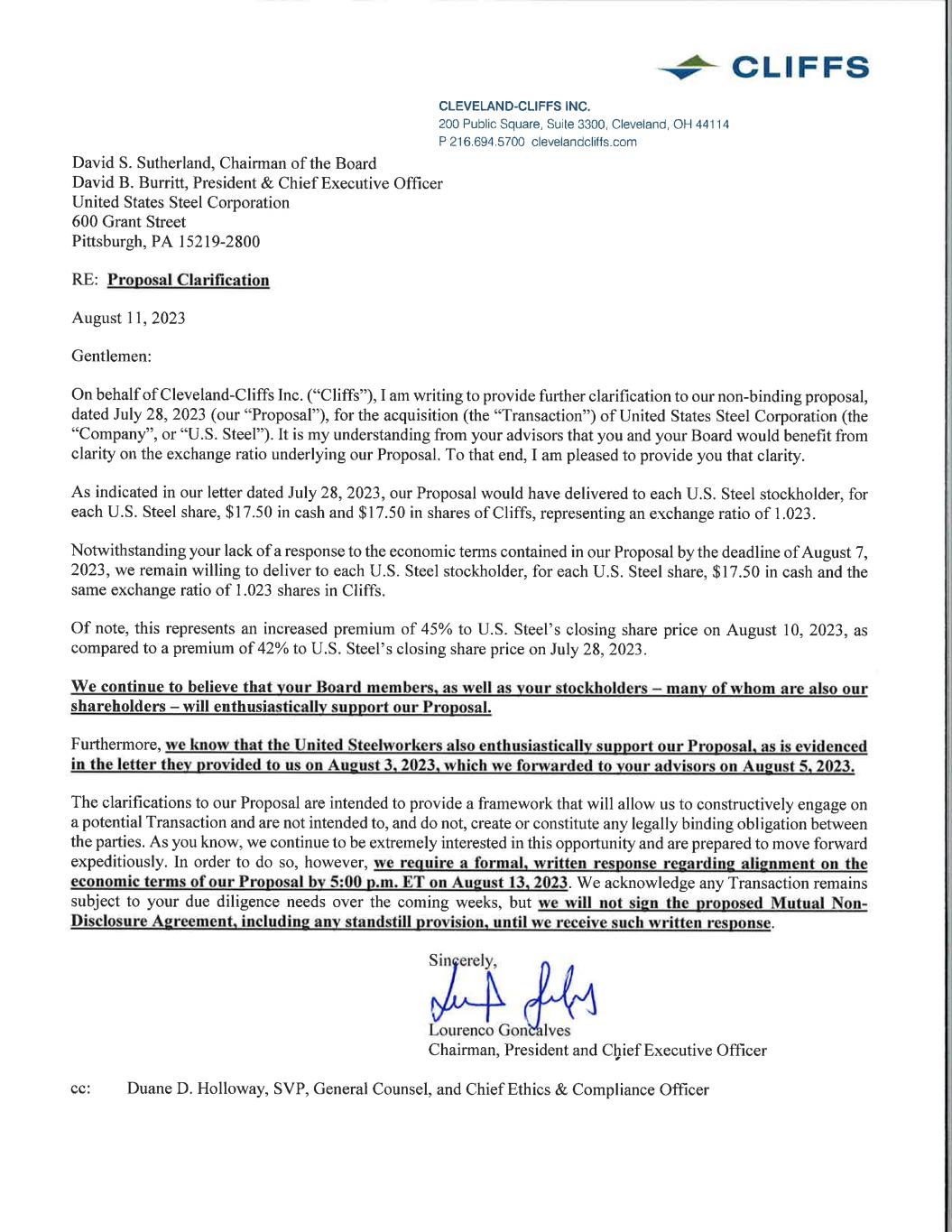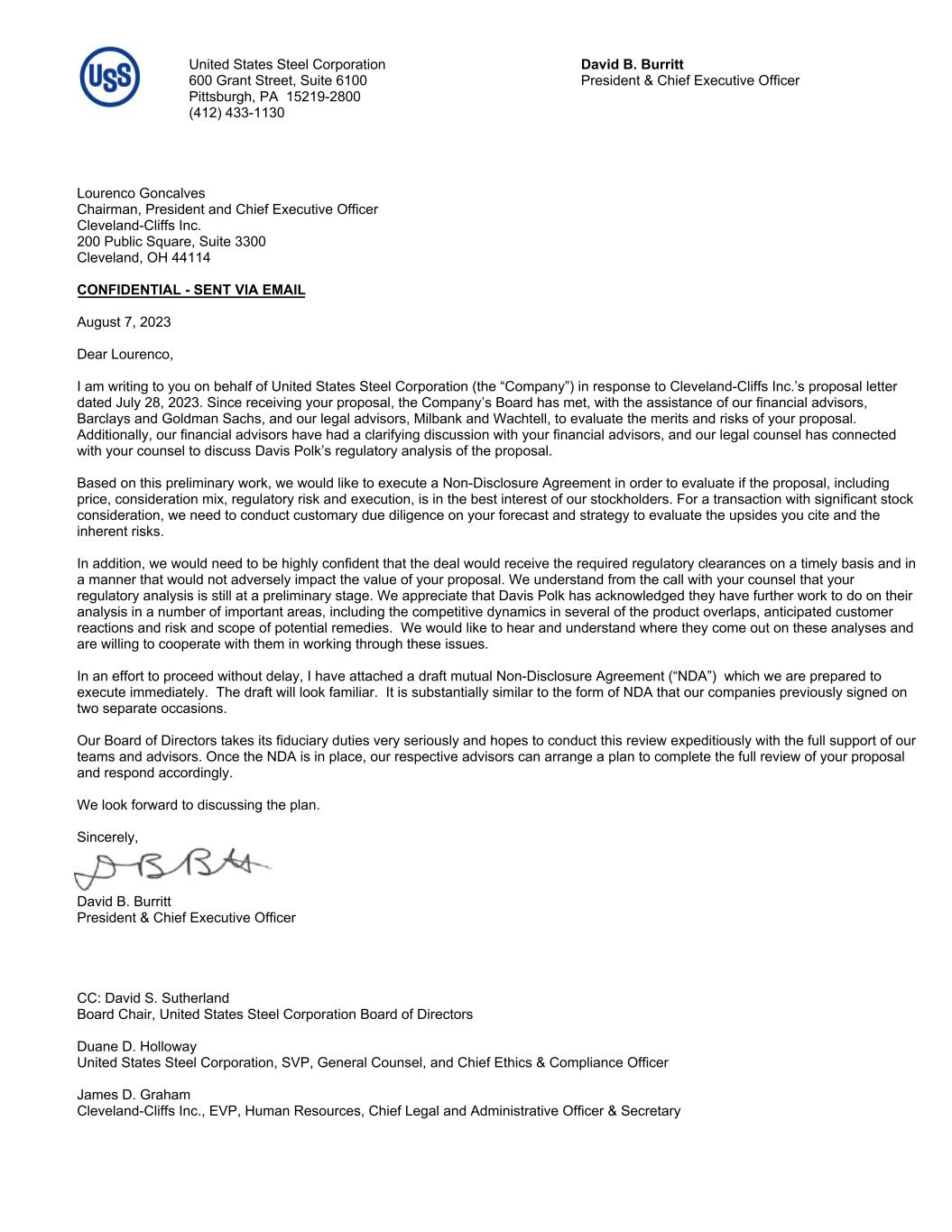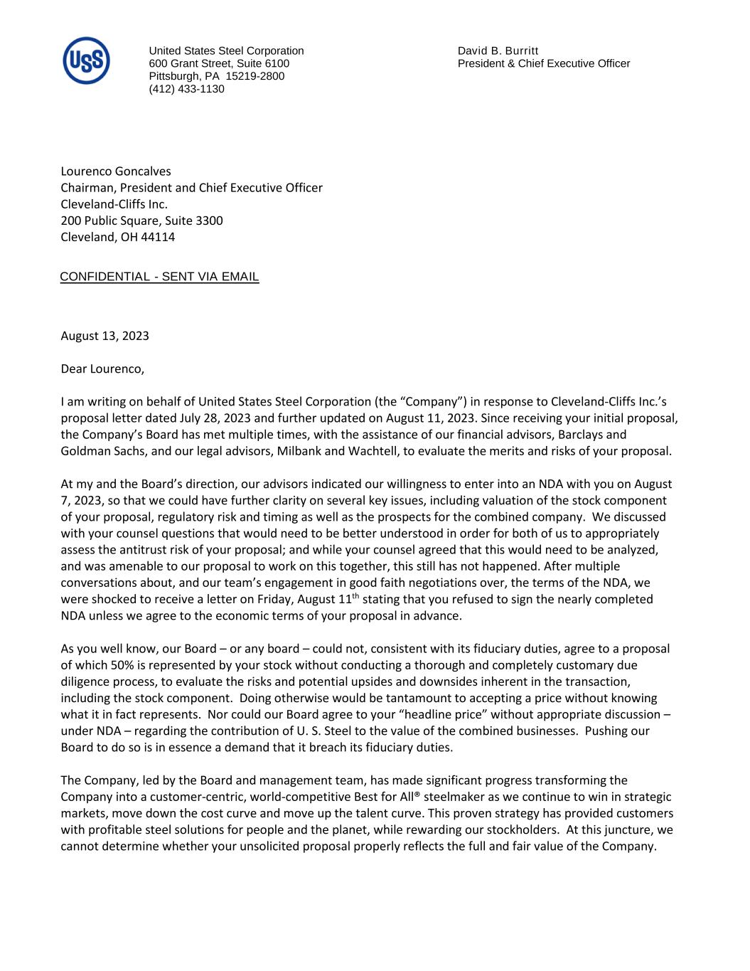 United States Steel Corporation David B. Burritt 600 Grant Street, Suite 6100 President & Chief Executive Officer Pittsburgh, PA 15219-2800 (412) 433-1130 Lourenco Goncalves Chairman, President and Chief Executive Officer Cleveland-Cliffs Inc. 200 Public Square, Suite 3300 Cleveland, OH 44114 August 13, 2023 Dear Lourenco, I am writing on behalf of United States Steel Corporation (the “Company”) in response to Cleveland-Cliffs Inc.’s proposal letter dated July 28, 2023 and further updated on August 11, 2023. Since receiving your initial proposal, the Company’s Board has met multiple times, with the assistance of our financial advisors, Barclays and Goldman Sachs, and our legal advisors, Milbank and Wachtell, to evaluate the merits and risks of your proposal. At my and the Board’s direction, our advisors indicated our willingness to enter into an NDA with you on August 7, 2023, so that we could have further clarity on several key issues, including valuation of the stock component of your proposal, regulatory risk and timing as well as the prospects for the combined company. We discussed with your counsel questions that would need to be better understood in order for both of us to appropriately assess the antitrust risk of your proposal; and while your counsel agreed that this would need to be analyzed, and was amenable to our proposal to work on this together, this still has not happened. After multiple conversations about, and our team’s engagement in good faith negotiations over, the terms of the NDA, we were shocked to receive a letter on Friday, August 11th stating that you refused to sign the nearly completed NDA unless we agree to the economic terms of your proposal in advance. As you well know, our Board – or any board – could not, consistent with its fiduciary duties, agree to a proposal of which 50% is represented by your stock without conducting a thorough and completely customary due diligence process, to evaluate the risks and potential upsides and downsides inherent in the transaction, including the stock component. Doing otherwise would be tantamount to accepting a price without knowing what it in fact represents. Nor could our Board agree to your “headline price” without appropriate discussion – under NDA – regarding the contribution of U. S. Steel to the value of the combined businesses. Pushing our Board to do so is in essence a demand that it breach its fiduciary duties. The Company, led by the Board and management team, has made significant progress transforming the Company into a customer-centric, world-competitive Best for All® steelmaker as we continue to win in strategic markets, move down the cost curve and move up the talent curve. This proven strategy has provided customers with profitable steel solutions for people and the planet, while rewarding our stockholders. At this juncture, we cannot determine whether your unsolicited proposal properly reflects the full and fair value of the Company. CONFIDENTIAL - SENT VIA EMAIL