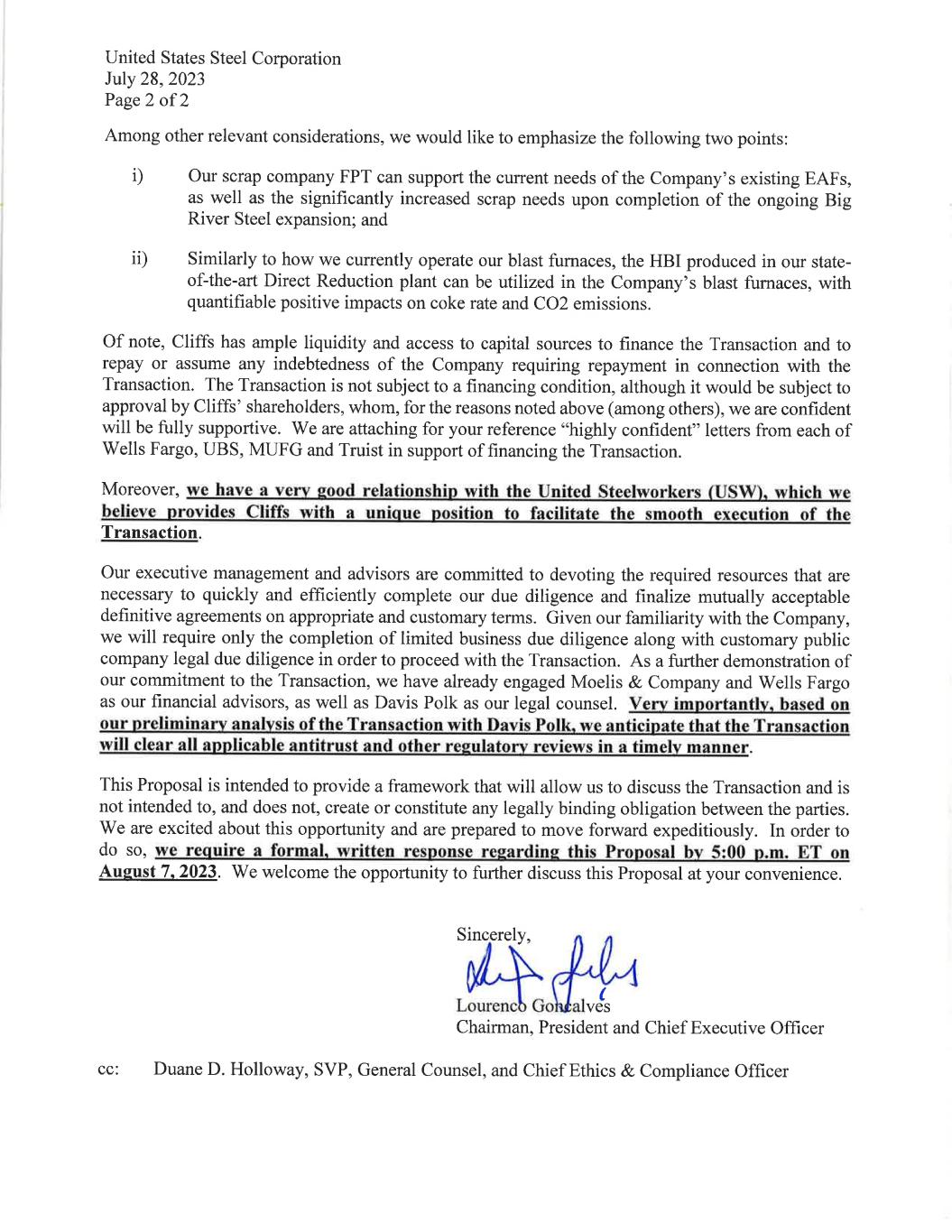 United States Steel Corporation David B. Burritt 600 Grant Street, Suite 6100 President & Chief Executive Officer Pittsburgh, PA 15219-2800 (412) 433-1130 Lourenco Goncalves Chairman, President and Chief Executive Officer Cleveland-Cliffs Inc. 200 Public Square, Suite 3300 Cleveland, OH 44114 CONFIDENTIAL - SENT VIA EMAIL August 7, 2023 Dear Lourenco, I am writing to you on behalf of United States Steel Corporation (the “Company”) in response to Cleveland-Cliffs Inc.’s proposal letter dated July 28, 2023. Since receiving your proposal, the Company’s Board has met, with the assistance of our financial advisors, Barclays and Goldman Sachs, and our legal advisors, Milbank and Wachtell, to evaluate the merits and risks of your proposal. Additionally, our financial advisors have had a clarifying discussion with your financial advisors, and our legal counsel has connected with your counsel to discuss Davis Polk’s regulatory analysis of the proposal. Based on this preliminary work, we would like to execute a Non-Disclosure Agreement in order to evaluate if the proposal, including price, consideration mix, regulatory risk and execution, is in the best interest of our stockholders. For a transaction with significant stock consideration, we need to conduct customary due diligence on your forecast and strategy to evaluate the upsides you cite and the inherent risks. In addition, we would need to be highly confident that the deal would receive the required regulatory clearances on a timely basis and in a manner that would not adversely impact the value of your proposal. We understand from the call with your counsel that your regulatory analysis is still at a preliminary stage. We appreciate that Davis Polk has acknowledged they have further work to do on their analysis in a number of important areas, including the competitive dynamics in several of the product overlaps, anticipated customer reactions and risk and scope of potential remedies. We would like to hear and understand where they come out on these analyses and are willing to cooperate with them in working through these issues. In an effort to proceed without delay, I have attached a draft mutual Non-Disclosure Agreement (“NDA”) which we are prepared to execute immediately. The draft will look familiar. It is substantially similar to the form of NDA that our companies previously signed on two separate occasions. Our Board of Directors takes its fiduciary duties very seriously and hopes to conduct this review expeditiously with the full support of our teams and advisors. Once the NDA is in place, our respective advisors can arrange a plan to complete the full review of your proposal and respond accordingly. We look forward to discussing the plan. Sincerely, David B. Burritt President & Chief Executive Officer CC: David S. Sutherland Board Chair, United States Steel Corporation Board of Directors Duane D. Holloway United States Steel Corporation, SVP, General Counsel, and Chief Ethics & Compliance Officer James D. Graham Cleveland-Cliffs Inc., EVP, Human Resources, Chief Legal and Administrative Officer & Secretary