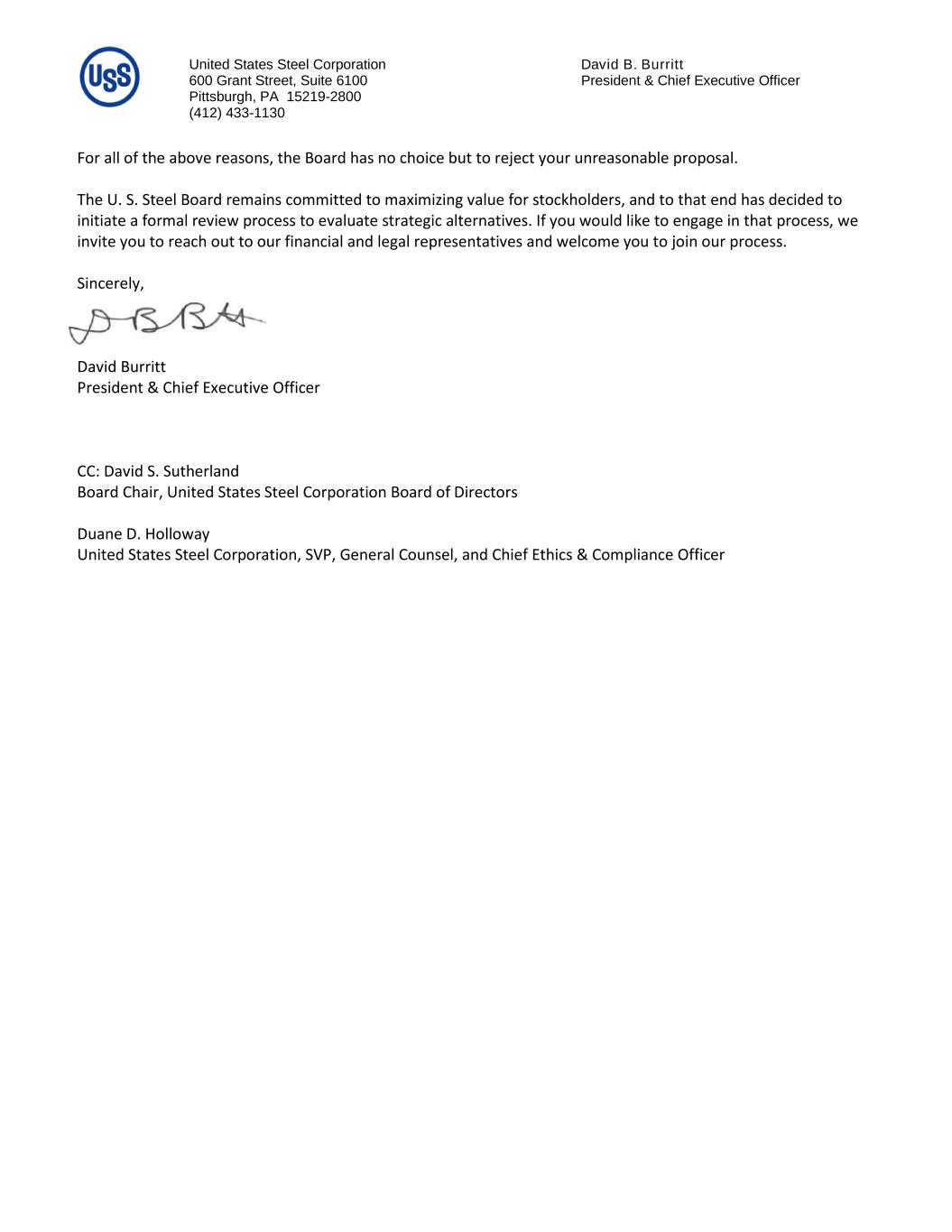 United States Steel Corporation David B. Burritt 600 Grant Street, Suite 6100 President & Chief Executive Officer Pittsburgh, PA 15219-2800 (412) 433-1130 For all of the above reasons, the Board has no choice but to reject your unreasonable proposal. The U. S. Steel Board remains committed to maximizing value for stockholders, and to that end has decided to initiate a formal review process to evaluate strategic alternatives. If you would like to engage in that process, we invite you to reach out to our financial and legal representatives and welcome you to join our process. Sincerely, David Burritt President & Chief Executive Officer CC: David S. Sutherland Board Chair, United States Steel Corporation Board of Directors Duane D. Holloway United States Steel Corporation, SVP, General Counsel, and Chief Ethics & Compliance Officer