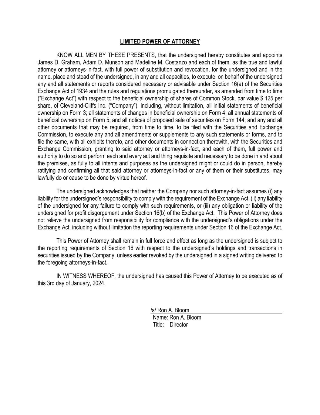 LIMITED POWER OF ATTORNEY KNOW ALL MEN BY THESE PRESENTS, that the undersigned hereby constitutes and appoints James D. Graham, Adam D. Munson and Madeline M. Costanzo and each of them, as the true and lawful attorney or attorneys-in-fact, with full power of substitution and revocation, for the undersigned and in the name, place and stead of the undersigned, in any and all capacities, to execute, on behalf of the undersigned any and all statements or reports considered necessary or advisable under Section 16(a) of the Securities Exchange Act of 1934 and the rules and regulations promulgated thereunder, as amended from time to time (“Exchange Act”) with respect to the beneficial ownership of shares of Common Stock, par value $.125 per share, of Cleveland-Cliffs Inc. (“Company”), including, without limitation, all initial statements of beneficial ownership on Form 3; all statements of changes in beneficial ownership on Form 4; all annual statements of beneficial ownership on Form 5; and all notices of proposed sale of securities on Form 144; and any and all other documents that may be required, from time to time, to be filed with the Securities and Exchange Commission, to execute any and all amendments or supplements to any such statements or forms, and to file the same, with all exhibits thereto, and other documents in connection therewith, with the Securities and Exchange Commission, granting to said attorney or attorneys-in-fact, and each of them, full power and authority to do so and perform each and every act and thing requisite and necessary to be done in and about the premises, as fully to all intents and purposes as the undersigned might or could do in person, hereby ratifying and confirming all that said attorney or attorneys-in-fact or any of them or their substitutes, may lawfully do or cause to be done by virtue hereof. The undersigned acknowledges that neither the Company nor such attorney-in-fact assumes (i) any liability for the undersigned’s responsibility to comply with the requirement of the Exchange Act, (ii) any liability of the undersigned for any failure to comply with such requirements, or (iii) any obligation or liability of the undersigned for profit disgorgement under Section 16(b) of the Exchange Act. This Power of Attorney does not relieve the undersigned from responsibility for compliance with the undersigned’s obligations under the Exchange Act, including without limitation the reporting requirements under Section 16 of the Exchange Act. This Power of Attorney shall remain in full force and effect as long as the undersigned is subject to the reporting requirements of Section 16 with respect to the undersigned’s holdings and transactions in securities issued by the Company, unless earlier revoked by the undersigned in a signed writing delivered to the foregoing attorneys-in-fact. IN WITNESS WHEREOF, the undersigned has caused this Power of Attorney to be executed as of this 3rd day of January, 2024. /s/ Ron A. Bloom Name: Ron A. Bloom Title: Director