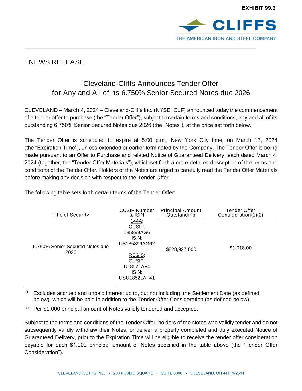CLEVELAND-CLIFFS INC. • 200 PUBLIC SQUARE • SUITE 3300 • CLEVELAND, OH 44114-2544 NEWS RELEASE Cleveland-Cliffs Announces Tender Offer for Any and All of its 6.750% Senior Secured Notes due 2026 CLEVELAND – March 4, 2024 – Cleveland-Cliffs Inc. (NYSE: CLF) announced today the commencement of a tender offer to purchase (the “Tender Offer”), subject to certain terms and conditions, any and all of its outstanding 6.750% Senior Secured Notes due 2026 (the “Notes”), at the price set forth below. The Tender Offer is scheduled to expire at 5:00 p.m., New York City time, on March 13, 2024 (the “Expiration Time”), unless extended or earlier terminated by the Company. The Tender Offer is being made pursuant to an Offer to Purchase and related Notice of Guaranteed Delivery, each dated March 4, 2024 (together, the “Tender Offer Materials”), which set forth a more detailed description of the terms and conditions of the Tender Offer. Holders of the Notes are urged to carefully read the Tender Offer Materials before making any decision with respect to the Tender Offer. The following table sets forth certain terms of the Tender Offer: Title of Security CUSIP Number & ISIN Principal Amount Outstanding Tender Offer Consideration(1)(2) 6.750% Senior Secured Notes due 2026 144A: $828,927,000 $1,018.00 CUSIP: 185899AG6 ISIN: US185899AG62 REG S: CUSIP: U1852LAF4 ISIN: USU1852LAF41 (1) Excludes accrued and unpaid interest up to, but not including, the Settlement Date (as defined below), which will be paid in addition to the Tender Offer Consideration (as defined below). (2) Per $1,000 principal amount of Notes validly tendered and accepted. Subject to the terms and conditions of the Tender Offer, holders of the Notes who validly tender and do not subsequently validly withdraw their Notes, or deliver a properly completed and duly executed Notice of Guaranteed Delivery, prior to the Expiration Time will be eligible to receive the tender offer consideration payable for each $1,000 principal amount of Notes specified in the table above (the “Tender Offer Consideration”). EXHIBIT 99.3