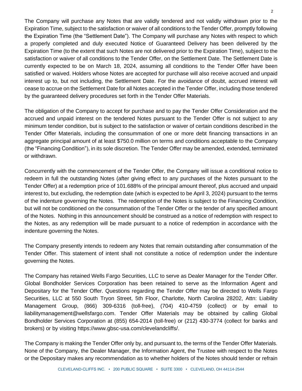 CLEVELAND-CLIFFS INC. • 200 PUBLIC SQUARE • SUITE 3300 • CLEVELAND, OH 44114-2544 2 The Company will purchase any Notes that are validly tendered and not validly withdrawn prior to the Expiration Time, subject to the satisfaction or waiver of all conditions to the Tender Offer, promptly following the Expiration Time (the “Settlement Date”). The Company will purchase any Notes with respect to which a properly completed and duly executed Notice of Guaranteed Delivery has been delivered by the Expiration Time (to the extent that such Notes are not delivered prior to the Expiration Time), subject to the satisfaction or waiver of all conditions to the Tender Offer, on the Settlement Date. The Settlement Date is currently expected to be on March 18, 2024, assuming all conditions to the Tender Offer have been satisfied or waived. Holders whose Notes are accepted for purchase will also receive accrued and unpaid interest up to, but not including, the Settlement Date. For the avoidance of doubt, accrued interest will cease to accrue on the Settlement Date for all Notes accepted in the Tender Offer, including those tendered by the guaranteed delivery procedures set forth in the Tender Offer Materials. The obligation of the Company to accept for purchase and to pay the Tender Offer Consideration and the accrued and unpaid interest on the tendered Notes pursuant to the Tender Offer is not subject to any minimum tender condition, but is subject to the satisfaction or waiver of certain conditions described in the Tender Offer Materials, including the consummation of one or more debt financing transactions in an aggregate principal amount of at least $750.0 million on terms and conditions acceptable to the Company (the “Financing Condition”), in its sole discretion. The Tender Offer may be amended, extended, terminated or withdrawn. Concurrently with the commencement of the Tender Offer, the Company will issue a conditional notice to redeem in full the outstanding Notes (after giving effect to any purchases of the Notes pursuant to the Tender Offer) at a redemption price of 101.688% of the principal amount thereof, plus accrued and unpaid interest to, but excluding, the redemption date (which is expected to be April 3, 2024) pursuant to the terms of the indenture governing the Notes. The redemption of the Notes is subject to the Financing Condition, but will not be conditioned on the consummation of the Tender Offer or the tender of any specified amount of the Notes. Nothing in this announcement should be construed as a notice of redemption with respect to the Notes, as any redemption will be made pursuant to a notice of redemption in accordance with the indenture governing the Notes. The Company presently intends to redeem any Notes that remain outstanding after consummation of the Tender Offer. This statement of intent shall not constitute a notice of redemption under the indenture governing the Notes. The Company has retained Wells Fargo Securities, LLC to serve as Dealer Manager for the Tender Offer. Global Bondholder Services Corporation has been retained to serve as the Information Agent and Depositary for the Tender Offer. Questions regarding the Tender Offer may be directed to Wells Fargo Securities, LLC at 550 South Tryon Street, 5th Floor, Charlotte, North Carolina 28202, Attn: Liability Management Group, (866) 309-6316 (toll-free), (704) 410-4759 (collect) or by email to liabilitymanagement@wellsfargo.com. Tender Offer Materials may be obtained by calling Global Bondholder Services Corporation at (855) 654-2014 (toll-free) or (212) 430-3774 (collect for banks and brokers) or by visiting https://www.gbsc-usa.com/clevelandcliffs/. The Company is making the Tender Offer only by, and pursuant to, the terms of the Tender Offer Materials. None of the Company, the Dealer Manager, the Information Agent, the Trustee with respect to the Notes or the Depositary makes any recommendation as to whether holders of the Notes should tender or refrain