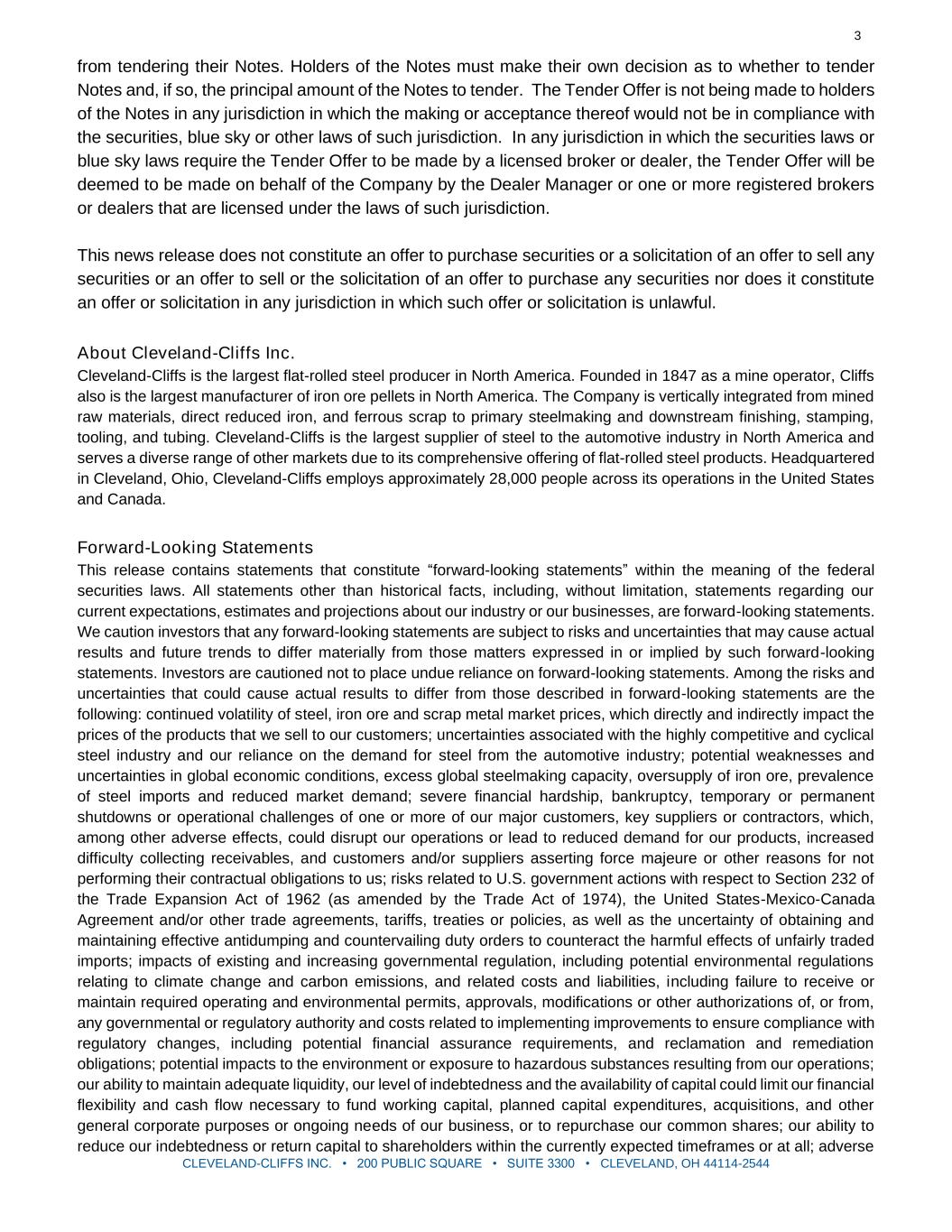 CLEVELAND-CLIFFS INC. • 200 PUBLIC SQUARE • SUITE 3300 • CLEVELAND, OH 44114-2544 3 from tendering their Notes. Holders of the Notes must make their own decision as to whether to tender Notes and, if so, the principal amount of the Notes to tender. The Tender Offer is not being made to holders of the Notes in any jurisdiction in which the making or acceptance thereof would not be in compliance with the securities, blue sky or other laws of such jurisdiction. In any jurisdiction in which the securities laws or blue sky laws require the Tender Offer to be made by a licensed broker or dealer, the Tender Offer will be deemed to be made on behalf of the Company by the Dealer Manager or one or more registered brokers or dealers that are licensed under the laws of such jurisdiction. This news release does not constitute an offer to purchase securities or a solicitation of an offer to sell any securities or an offer to sell or the solicitation of an offer to purchase any securities nor does it constitute an offer or solicitation in any jurisdiction in which such offer or solicitation is unlawful. About Cleveland-Cliffs Inc. Cleveland-Cliffs is the largest flat-rolled steel producer in North America. Founded in 1847 as a mine operator, Cliffs also is the largest manufacturer of iron ore pellets in North America. The Company is vertically integrated from mined raw materials, direct reduced iron, and ferrous scrap to primary steelmaking and downstream finishing, stamping, tooling, and tubing. Cleveland-Cliffs is the largest supplier of steel to the automotive industry in North America and serves a diverse range of other markets due to its comprehensive offering of flat-rolled steel products. Headquartered in Cleveland, Ohio, Cleveland-Cliffs employs approximately 28,000 people across its operations in the United States and Canada. Forward-Looking Statements This release contains statements that constitute “forward-looking statements” within the meaning of the federal securities laws. All statements other than historical facts, including, without limitation, statements regarding our current expectations, estimates and projections about our industry or our businesses, are forward-looking statements. We caution investors that any forward-looking statements are subject to risks and uncertainties that may cause actual results and future trends to differ materially from those matters expressed in or implied by such forward-looking statements. Investors are cautioned not to place undue reliance on forward-looking statements. Among the risks and uncertainties that could cause actual results to differ from those described in forward-looking statements are the following: continued volatility of steel, iron ore and scrap metal market prices, which directly and indirectly impact the prices of the products that we sell to our customers; uncertainties associated with the highly competitive and cyclical steel industry and our reliance on the demand for steel from the automotive industry; potential weaknesses and uncertainties in global economic conditions, excess global steelmaking capacity, oversupply of iron ore, prevalence of steel imports and reduced market demand; severe financial hardship, bankruptcy, temporary or permanent shutdowns or operational challenges of one or more of our major customers, key suppliers or contractors, which, among other adverse effects, could disrupt our operations or lead to reduced demand for our products, increased difficulty collecting receivables, and customers and/or suppliers asserting force majeure or other reasons for not performing their contractual obligations to us; risks related to U.S. government actions with respect to Section 232 of the Trade Expansion Act of 1962 (as amended by the Trade Act of 1974), the United States-Mexico-Canada Agreement and/or other trade agreements, tariffs, treaties or policies, as well as the uncertainty of obtaining and maintaining effective antidumping and countervailing duty orders to counteract the harmful effects of unfairly traded imports; impacts of existing and increasing governmental regulation, including potential environmental regulations relating to climate change and carbon emissions, and related costs and liabilities, including failure to receive or maintain required operating and environmental permits, approvals, modifications or other authorizations of, or from, any governmental or regulatory authority and costs related to implementing improvements to ensure compliance with regulatory changes, including potential financial assurance requirements, and reclamation and remediation obligations; potential impacts to the environment or exposure to hazardous substances resulting from our operations; our ability to maintain adequate liquidity, our level of indebtedness and the availability of capital could limit our financial flexibility and cash flow necessary to fund working capital, planned capital expenditures, acquisitions, and other general corporate purposes or ongoing needs of our business, or to repurchase our common shares; our ability to reduce our indebtedness or return capital to shareholders within the currently expected timeframes or at all; adverse