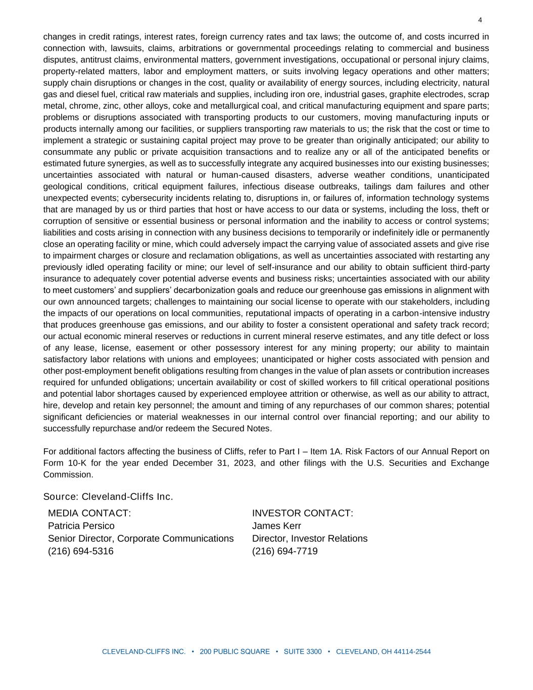 CLEVELAND-CLIFFS INC. • 200 PUBLIC SQUARE • SUITE 3300 • CLEVELAND, OH 44114-2544 4 changes in credit ratings, interest rates, foreign currency rates and tax laws; the outcome of, and costs incurred in connection with, lawsuits, claims, arbitrations or governmental proceedings relating to commercial and business disputes, antitrust claims, environmental matters, government investigations, occupational or personal injury claims, property-related matters, labor and employment matters, or suits involving legacy operations and other matters; supply chain disruptions or changes in the cost, quality or availability of energy sources, including electricity, natural gas and diesel fuel, critical raw materials and supplies, including iron ore, industrial gases, graphite electrodes, scrap metal, chrome, zinc, other alloys, coke and metallurgical coal, and critical manufacturing equipment and spare parts; problems or disruptions associated with transporting products to our customers, moving manufacturing inputs or products internally among our facilities, or suppliers transporting raw materials to us; the risk that the cost or time to implement a strategic or sustaining capital project may prove to be greater than originally anticipated; our ability to consummate any public or private acquisition transactions and to realize any or all of the anticipated benefits or estimated future synergies, as well as to successfully integrate any acquired businesses into our existing businesses; uncertainties associated with natural or human-caused disasters, adverse weather conditions, unanticipated geological conditions, critical equipment failures, infectious disease outbreaks, tailings dam failures and other unexpected events; cybersecurity incidents relating to, disruptions in, or failures of, information technology systems that are managed by us or third parties that host or have access to our data or systems, including the loss, theft or corruption of sensitive or essential business or personal information and the inability to access or control systems; liabilities and costs arising in connection with any business decisions to temporarily or indefinitely idle or permanently close an operating facility or mine, which could adversely impact the carrying value of associated assets and give rise to impairment charges or closure and reclamation obligations, as well as uncertainties associated with restarting any previously idled operating facility or mine; our level of self-insurance and our ability to obtain sufficient third-party insurance to adequately cover potential adverse events and business risks; uncertainties associated with our ability to meet customers’ and suppliers’ decarbonization goals and reduce our greenhouse gas emissions in alignment with our own announced targets; challenges to maintaining our social license to operate with our stakeholders, including the impacts of our operations on local communities, reputational impacts of operating in a carbon-intensive industry that produces greenhouse gas emissions, and our ability to foster a consistent operational and safety track record; our actual economic mineral reserves or reductions in current mineral reserve estimates, and any title defect or loss of any lease, license, easement or other possessory interest for any mining property; our ability to maintain satisfactory labor relations with unions and employees; unanticipated or higher costs associated with pension and other post-employment benefit obligations resulting from changes in the value of plan assets or contribution increases required for unfunded obligations; uncertain availability or cost of skilled workers to fill critical operational positions and potential labor shortages caused by experienced employee attrition or otherwise, as well as our ability to attract, hire, develop and retain key personnel; the amount and timing of any repurchases of our common shares; potential significant deficiencies or material weaknesses in our internal control over financial reporting; and our ability to successfully repurchase and/or redeem the Secured Notes. For additional factors affecting the business of Cliffs, refer to Part I – Item 1A. Risk Factors of our Annual Report on Form 10-K for the year ended December 31, 2023, and other filings with the U.S. Securities and Exchange Commission. Source: Cleveland-Cliffs Inc. MEDIA CONTACT: Patricia Persico Senior Director, Corporate Communications (216) 694-5316 INVESTOR CONTACT: James Kerr Director, Investor Relations (216) 694-7719