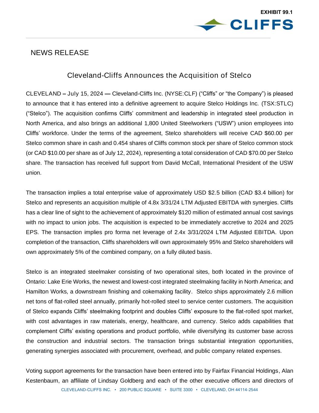 CLEVELAND-CLIFFS INC. • 200 PUBLIC SQUARE • SUITE 3300 • CLEVELAND, OH 44114-2544 NEWS RELEASE Cleveland-Cliffs Announces the Acquisition of Stelco CLEVELAND – July 15, 2024 — Cleveland-Cliffs Inc. (NYSE:CLF) (“Cliffs” or “the Company”) is pleased to announce that it has entered into a definitive agreement to acquire Stelco Holdings Inc. (TSX:STLC) (“Stelco”). The acquisition confirms Cliffs’ commitment and leadership in integrated steel production in North America, and also brings an additional 1,800 United Steelworkers (“USW”) union employees into Cliffs’ workforce. Under the terms of the agreement, Stelco shareholders will receive CAD $60.00 per Stelco common share in cash and 0.454 shares of Cliffs common stock per share of Stelco common stock (or CAD $10.00 per share as of July 12, 2024), representing a total consideration of CAD $70.00 per Stelco share. The transaction has received full support from David McCall, International President of the USW union. The transaction implies a total enterprise value of approximately USD $2.5 billion (CAD $3.4 billion) for Stelco and represents an acquisition multiple of 4.8x 3/31/24 LTM Adjusted EBITDA with synergies. Cliffs has a clear line of sight to the achievement of approximately $120 million of estimated annual cost savings with no impact to union jobs. The acquisition is expected to be immediately accretive to 2024 and 2025 EPS. The transaction implies pro forma net leverage of 2.4x 3/31/2024 LTM Adjusted EBITDA. Upon completion of the transaction, Cliffs shareholders will own approximately 95% and Stelco shareholders will own approximately 5% of the combined company, on a fully diluted basis. Stelco is an integrated steelmaker consisting of two operational sites, both located in the province of Ontario: Lake Erie Works, the newest and lowest-cost integrated steelmaking facility in North America; and Hamilton Works, a downstream finishing and cokemaking facility. Stelco ships approximately 2.6 million net tons of flat-rolled steel annually, primarily hot-rolled steel to service center customers. The acquisition of Stelco expands Cliffs’ steelmaking footprint and doubles Cliffs’ exposure to the flat-rolled spot market, with cost advantages in raw materials, energy, healthcare, and currency. Stelco adds capabilities that complement Cliffs’ existing operations and product portfolio, while diversifying its customer base across the construction and industrial sectors. The transaction brings substantial integration opportunities, generating synergies associated with procurement, overhead, and public company related expenses. Voting support agreements for the transaction have been entered into by Fairfax Financial Holdings, Alan Kestenbaum, an affiliate of Lindsay Goldberg and each of the other executive officers and directors of EXHIBIT 99.1