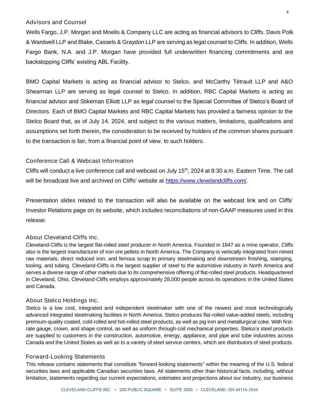 CLEVELAND-CLIFFS INC. • 200 PUBLIC SQUARE • SUITE 3300 • CLEVELAND, OH 44114-2544 4 Advisors and Counsel Wells Fargo, J.P. Morgan and Moelis & Company LLC are acting as financial advisors to Cliffs. Davis Polk & Wardwell LLP and Blake, Cassels & Graydon LLP are serving as legal counsel to Cliffs. In addition, Wells Fargo Bank, N.A. and J.P. Morgan have provided full underwritten financing commitments and are backstopping Cliffs’ existing ABL Facility. BMO Capital Markets is acting as financial advisor to Stelco, and McCarthy Tétrault LLP and A&O Shearman LLP are serving as legal counsel to Stelco. In addition, RBC Capital Markets is acting as financial advisor and Stikeman Elliott LLP as legal counsel to the Special Committee of Stelco’s Board of Directors. Each of BMO Capital Markets and RBC Capital Markets has provided a fairness opinion to the Stelco Board that, as of July 14, 2024, and subject to the various matters, limitations, qualifications and assumptions set forth therein, the consideration to be received by holders of the common shares pursuant to the transaction is fair, from a financial point of view, to such holders. Conference Call & Webcast Information Cliffs will conduct a live conference call and webcast on July 15th, 2024 at 8:30 a.m. Eastern Time. The call will be broadcast live and archived on Cliffs' website at https://www.clevelandcliffs.com/. Presentation slides related to the transaction will also be available on the webcast link and on Cliffs’ Investor Relations page on its website, which includes reconciliations of non-GAAP measures used in this release. About Cleveland-Cliffs Inc. Cleveland-Cliffs is the largest flat-rolled steel producer in North America. Founded in 1847 as a mine operator, Cliffs also is the largest manufacturer of iron ore pellets in North America. The Company is vertically integrated from mined raw materials, direct reduced iron, and ferrous scrap to primary steelmaking and downstream finishing, stamping, tooling, and tubing. Cleveland-Cliffs is the largest supplier of steel to the automotive industry in North America and serves a diverse range of other markets due to its comprehensive offering of flat-rolled steel products. Headquartered in Cleveland, Ohio, Cleveland-Cliffs employs approximately 28,000 people across its operations in the United States and Canada. About Stelco Holdings Inc. Stelco is a low cost, integrated and independent steelmaker with one of the newest and most technologically advanced integrated steelmaking facilities in North America. Stelco produces flat-rolled value-added steels, including premium-quality coated, cold-rolled and hot-rolled steel products, as well as pig iron and metallurgical coke. With first- rate gauge, crown, and shape control, as well as uniform through-coil mechanical properties, Stelco’s steel products are supplied to customers in the construction, automotive, energy, appliance, and pipe and tube industries across Canada and the United States as well as to a variety of steel service centers, which are distributors of steel products. Forward-Looking Statements This release contains statements that constitute "forward-looking statements" within the meaning of the U.S. federal securities laws and applicable Canadian securities laws. All statements other than historical facts, including, without limitation, statements regarding our current expectations, estimates and projections about our industry, our business