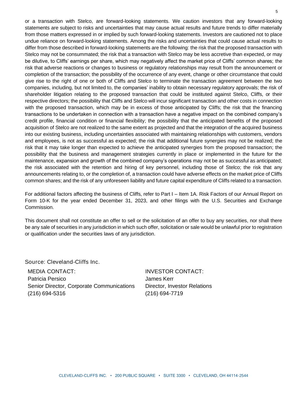 CLEVELAND-CLIFFS INC. • 200 PUBLIC SQUARE • SUITE 3300 • CLEVELAND, OH 44114-2544 5 or a transaction with Stelco, are forward-looking statements. We caution investors that any forward-looking statements are subject to risks and uncertainties that may cause actual results and future trends to differ materially from those matters expressed in or implied by such forward-looking statements. Investors are cautioned not to place undue reliance on forward-looking statements. Among the risks and uncertainties that could cause actual results to differ from those described in forward-looking statements are the following: the risk that the proposed transaction with Stelco may not be consummated; the risk that a transaction with Stelco may be less accretive than expected, or may be dilutive, to Cliffs’ earnings per share, which may negatively affect the market price of Cliffs’ common shares; the risk that adverse reactions or changes to business or regulatory relationships may result from the announcement or completion of the transaction; the possibility of the occurrence of any event, change or other circumstance that could give rise to the right of one or both of Cliffs and Stelco to terminate the transaction agreement between the two companies, including, but not limited to, the companies’ inability to obtain necessary regulatory approvals; the risk of shareholder litigation relating to the proposed transaction that could be instituted against Stelco, Cliffs, or their respective directors; the possibility that Cliffs and Stelco will incur significant transaction and other costs in connection with the proposed transaction, which may be in excess of those anticipated by Cliffs; the risk that the financing transactions to be undertaken in connection with a transaction have a negative impact on the combined company’s credit profile, financial condition or financial flexibility; the possibility that the anticipated benefits of the proposed acquisition of Stelco are not realized to the same extent as projected and that the integration of the acquired business into our existing business, including uncertainties associated with maintaining relationships with customers, vendors and employees, is not as successful as expected; the risk that additional future synergies may not be realized; the risk that it may take longer than expected to achieve the anticipated synergies from the proposed transaction; the possibility that the business and management strategies currently in place or implemented in the future for the maintenance, expansion and growth of the combined company’s operations may not be as successful as anticipated; the risk associated with the retention and hiring of key personnel, including those of Stelco; the risk that any announcements relating to, or the completion of, a transaction could have adverse effects on the market price of Cliffs common shares; and the risk of any unforeseen liability and future capital expenditure of Cliffs related to a transaction. For additional factors affecting the business of Cliffs, refer to Part I – Item 1A. Risk Factors of our Annual Report on Form 10-K for the year ended December 31, 2023, and other filings with the U.S. Securities and Exchange Commission. This document shall not constitute an offer to sell or the solicitation of an offer to buy any securities, nor shall there be any sale of securities in any jurisdiction in which such offer, solicitation or sale would be unlawful prior to registration or qualification under the securities laws of any jurisdiction. Source: Cleveland-Cliffs Inc. MEDIA CONTACT: Patricia Persico Senior Director, Corporate Communications (216) 694-5316 INVESTOR CONTACT: James Kerr Director, Investor Relations (216) 694-7719