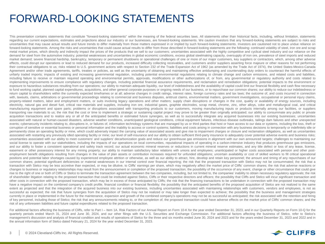 © 2024 Cleveland-Cliffs Inc. All Rights Reserved.2 This presentation has been prepared by Cleveland-Cliffs Inc. (the “Company,” “Cliffs,” “Cleveland-Cliffs,” “we,” or “us”) for the exclusive use of the party to whom the Company delivers this presentation. This presentation is the property of and contains the proprietary confidential in formation of the Company and is being made to you solely for your information and may not be reproduced, further distributed to any other person or published, in whole or in part, for any purpose. By participating in this presentation, you agree to be bound by these terms. This presentation is for information purposes only, and the Company does not make any representation or warranty, either express or implied, as to the accuracy, completeness or reliability of the information contained in this presentation. Acceptance of this presentation further constitutes your acknowledgement and agreement that none of the Company, the Company’s direct and indirect equity holders and their respective affiliates, directors, officers, employees, partners, members, controlling persons, agents or advisers (i) makes any express or implied representation or warranty as to the accuracy, reliability, reasonableness or completeness of the information contained herein and (ii) shall bear any responsibility or have any liability to the recipient or its representatives relating to or arising from the information contained herein or any omissions from such information, or any other written or oral communication transmitted to any interested party in the course of its evaluation of the Company or any potential transaction involving the Company. The Notes (as defined below) discussed herein have not been and will not be registered under the U.S. Securities Act of 1933 (as amended, the “Act”), or any state securities laws or the laws of any foreign jurisdiction. The Notes are being offered only to persons reasonably believed to be “qualified institutional buyers” pursuant to Rule 144A under the Act and to non U.S. persons outside the United States in reliance on Regulation S under the Act. Accordingly, this document is being provided only to persons that are reasonably believed to be “qualified institutional buyers,” as defined in Rule 144A under the Act, or that are non U.S. persons outside the United States. By accepting this presentation, you will be deemed to represent that you are either a qualified institutional buyer or a non U.S. person outside the United States. The Notes have not been approved or disapproved by the U.S. Securities and Exchange Commission, or any other securities regulating body or agency, nor has any such authority, commission, or body passed on the accuracy or adequacy of this presentation. Any representation to the contrary is a criminal offense. The Notes will be subject to restrictions on transferability and resale and may not be transferred or resold except as permitted under the Act and applicable state securities laws pursuant to registration or exemption therefrom. Investors should be aware that they may be required to bear the financial risks of an investment in the Notes for an indefinite period of time. The Notes will not be listed on any securities exchange or automated quotation system, and there is no obligation on the part of any person to make a market for the notes. To the extent any information is inconsistent, this presentation is superseded by and should be read in conjunction with the offering memorandum for the notes discussed herein. Offers to sell and solicitations of offers to buy the Notes, as applicable, are made only by, and the information herein must be read in conjunction with, the preliminary offering memorandum to be provided, as such offering memorandum may be further supplemented, amended or replaced by a final offering memorandum (as so supplemented, amended or replaced, the “Offering Memorandum”). Information contained herein does not purport to be complete and is subject to the same qualifications and assumptions, and should be considered by investors only in light of the same warnings, lack of assurances and representations and other precautionary matters, as disclosed in the Offering Memorandum. This presentation includes certain non-GAAP financial measures of the Company, including Adjusted EBITDA about the Company and Free Cash Flow, and certain non-IFRS financial measures of Stelco Holdings Inc. (“Stelco”), including Adjusted EBITDA. The Company uses Adjusted EBITDA and believes that investors, lenders and other external users of its financial statements use Adjusted EBITDA to assess and compare the Company's operating performance to other companies in the steel industry. In addition, the Company’s management believes Adjusted EBITDA is a useful measure to assess the earnings power of the business without the impact of capital structure and can be used to assess our ability to service debt and fund future capital expenditures in the business. The Company uses Free Cash Flow and believes it is an important measure to assess the cash generation available to service debt, strategic initiatives or other financing activities. Non-GAAP and non-IFRS financial measures such as Adjusted EBITDA and non-GAAP financial measures such as Free Cash Flow should be considered only as supplemental to, and not as superior to, financial measures prepared in accordance with GAAP or IFRS. For a reconciliation of non-GAAP financial measures of the Company and non-IFRS measures of Stelco to financial measures prepared in accordance with GAAP or IFRS, as applicable, please refer to the Appendix of this presentation. The Company expressly disclaims any and all liability relating to or resulting from the use of this presentation. In addition, the information contained in this presentation is as of the date hereof, and the Company has no obligation to update such information, including in the event 