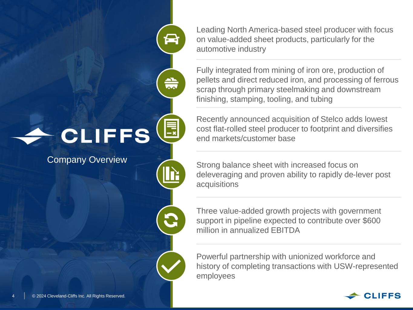 © 2024 Cleveland-Cliffs Inc. All Rights Reserved.3 This presentation contains statements that constitute "forward-looking statements" within the meaning of the federal securities laws. All statements other than historical facts, including, without limitation, statements regarding our current expectations, estimates and projections about our industry or our businesses, are forward-looking statements. We caution investors that any forward-looking statements are subject to risks and uncertainties that may cause actual results and future trends to differ materially from those matters expressed in or implied by such forward-looking statements. Investors are cautioned not to place undue reliance on forward-looking statements. Among the risks and uncertainties that could cause actual results to differ from those described in forward-looking statements are the following: continued volatility of steel, iron ore and scrap metal market prices, which directly and indirectly impact the prices of the products that we sell to our customers; uncertainties associated with the highly competitive and cyclical steel industry and our reliance on the demand for steel from the automotive industry; potential weaknesses and uncertainties in global economic conditions, excess global steelmaking capacity, oversupply of iron ore, prevalence of steel imports and reduced market demand; severe financial hardship, bankruptcy, temporary or permanent shutdowns or operational challenges of one or more of our major customers, key suppliers or contractors, which, among other adverse effects, could disrupt our operations or lead to reduced demand for our products, increased difficulty collecting receivables, and customers and/or suppliers asserting force majeure or other reasons for not performing their contractual obligations to us; risks related to U.S. government actions with respect to Section 232 of the Trade Expansion Act of 1962 (as amended by the Trade Act of 1974), the United States-Mexico-Canada Agreement and/or other trade agreements, tariffs, treaties or policies, as well as the uncertainty of obtaining and maintaining effective antidumping and countervailing duty orders to counteract the harmful effects of unfairly traded imports; impacts of existing and increasing governmental regulation, including potential environmental regulations relating to climate change and carbon emissions, and related costs and liabilities, including failure to receive or maintain required operating and environmental permits, approvals, modifications or other authorizations of, or from, any governmental or regulatory authority and costs related to implementing improvements to ensure compliance with regulatory changes, including potential financial assurance requirements, and reclamation and remediation obligations; potential impacts to the environment or exposure to hazardous substances resulting from our operations; our ability to maintain adequate liquidity, our level of indebtedness and the availability of capital could limit our financial flexibility and cash flow necessary to fund working capital, planned capital expenditures, acquisitions, and other general corporate purposes or ongoing needs of our business, or to repurchase our common shares; our ability to reduce our indebtedness or return capital to shareholders within the currently expected timeframes or at all; adverse changes in credit ratings, interest rates, foreign currency rates and tax laws; the outcome of, and costs incurred in connection with, lawsuits, claims, arbitrations or governmental proceedings relating to commercial and business disputes, antitrust claims, environmental matters, government investigations, occupational or personal injury claims, property-related matters, labor and employment matters, or suits involving legacy operations and other matters; supply chain disruptions or changes in the cost, quality or availability of energy sources, including electricity, natural gas and diesel fuel, critical raw materials and supplies, including iron ore, industrial gases, graphite electrodes, scrap metal, chrome, zinc, other alloys, coke and metallurgical coal, and critical manufacturing equipment and spare parts; problems or disruptions associated with transporting products to our customers, moving manufacturing inputs or products internally among our facilities, or suppliers transporting raw materials to us; the risk that the cost or time to implement a strategic or sustaining capital project may prove to be greater than originally anticipated; our ability to consummate any public or private acquisition transactions and to realize any or all of the anticipated benefits or estimated future synergies, as well as to successfully integrate any acquired businesses into our existing businesses; uncertainties associated with natural or human-caused disasters, adverse weather conditions, unanticipated geological conditions, critical equipment failures, infectious disease outbreaks, tailings dam failures and other unexpected events; cybersecurity incidents relating to, disruptions in, or failures of, information technology systems that are managed by us or third parties that host or have access to our data or systems, including the loss, theft or corruption of sensitive or essential business or personal information and the inability to access or control systems; liabilities and costs arising in connection with any business decisions to temporarily or indefinitely idle or permanently close an operating facility or mine, which could adversely impact the carrying value of associated assets and give rise to impairment charges or closure and reclamation obligations, as well as uncertainties associated with restarting any previously idled operating facility or mine; our level of self-insurance and our ability to obtain sufficient third-party insurance to adequately cover potential adverse events and business risks; uncertainties associated with our ability to meet customer