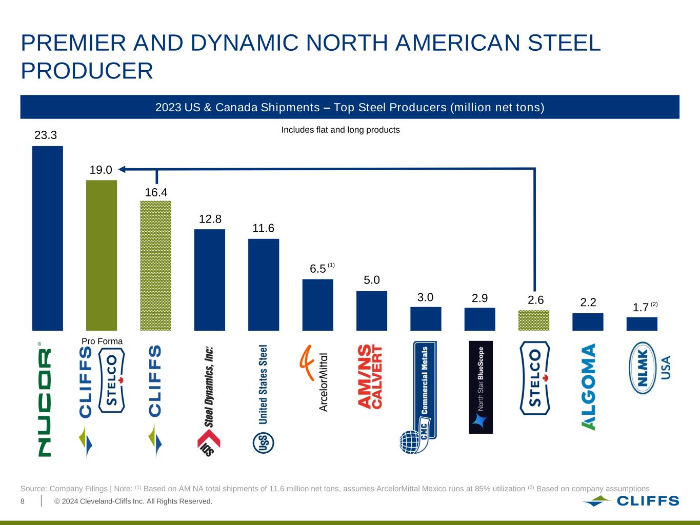 © 2024 Cleveland-Cliffs Inc. All Rights Reserved.7 PRO FORMA OPERATIONAL FOOTPRINT Hibbing Taconite Mine (85.3% owned) BF/BOF Steel Operations Iron Ore Mines And Pellet Plants Coal/Coke Production Facilities EAF Assets Direct Reduced Iron Finishing Facilities Downstream Assets Scrap Processing Facilities Stelco Facilities Northshore Minorca United Taconite ConshohockenSteelton Bowling Green MI Tilden Burns Harbor Windsor & Ontario FPT Michigan Toledo HBI Plant MansfieldWalbridge FPT Ohio Cleveland Columbus Zanesville Coshocton Middletown PrincetonRockport Burns Harbor Plate & Gary Plate Cleveland-Cliffs Headquarters (Cleveland) Dearborn New Carlisle Columbus Monessen Butler MI IN WV KY PA OH Ontario Dearborn Hamilton Works Lake Erie Works NY FPT Ontario Riverdale Indiana Harbor Coatesville Warren WI IL MN Hibbing Source: Company Filings Sites not shown: Alabama (Sylacauga Downstream Assets), Florida (FPT Scrap Processing Facilities), North Carolina (Piedmont Downstream Assets) Tennessee (FPT Scrap Processing Facilities, Cleveland Downstream Assets)
