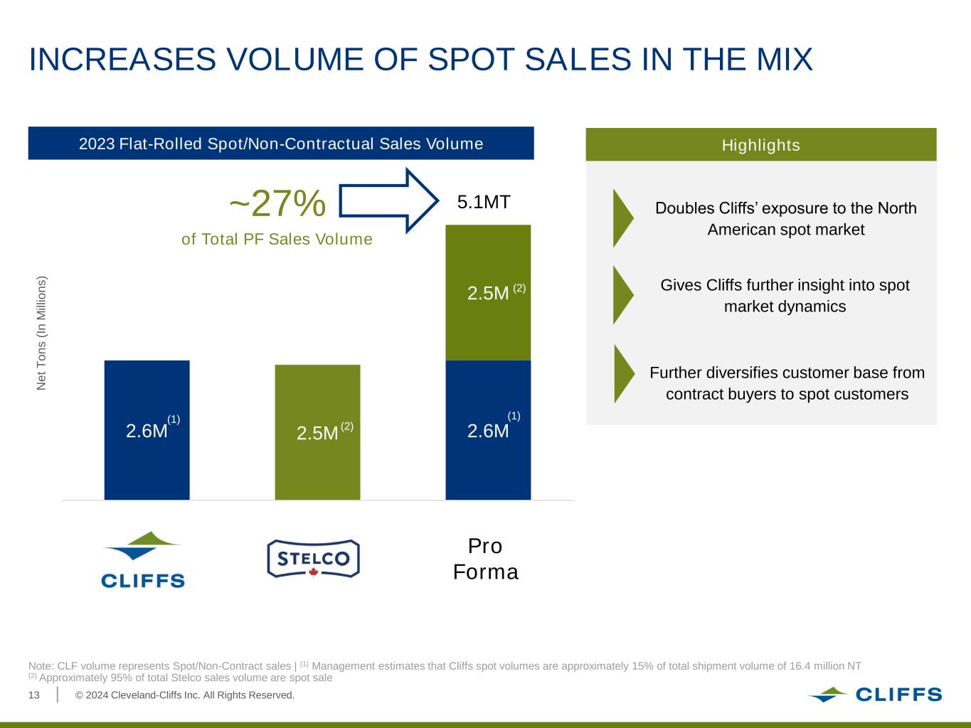 © 2024 Cleveland-Cliffs Inc. All Rights Reserved.13 INCREASES VOLUME OF SPOT SALES IN THE MIX 2023 Flat-Rolled Spot/Non-Contractual Sales Volume Further diversifies customer base from contract buyers to spot customers Pro Forma N e t T o n s ( In M ill io n s ) Note: CLF volume represents Spot/Non-Contract sales | (1) Management estimates that Cliffs spot volumes are approximately 15% of total shipment volume of 16.4 million NT (2) Approximately 95% of total Stelco sales volume are spot sale 5.1MT~27% of Total PF Sales Volume Highlights Gives Cliffs further insight into spot market dynamics 2.6M 2.5M 2.6M 2.5M (2) (2) Doubles Cliffs’ exposure to the North American spot market (1) (1)