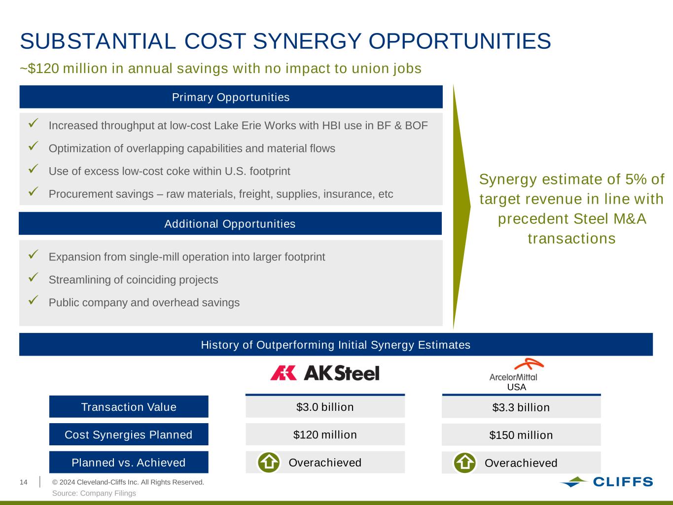 © 2024 Cleveland-Cliffs Inc. All Rights Reserved.14 SUBSTANTIAL COST SYNERGY OPPORTUNITIES ~$120 million in annual savings with no impact to union jobs Primary Opportunities ✓ Increased throughput at low-cost Lake Erie Works with HBI use in BF & BOF ✓ Optimization of overlapping capabilities and material flows ✓ Use of excess low-cost coke within U.S. footprint ✓ Procurement savings – raw materials, freight, supplies, insurance, etc ✓ Expansion from single-mill operation into larger footprint ✓ Streamlining of coinciding projects ✓ Public company and overhead savings Synergy estimate of 5% of target revenue in line with precedent Steel M&A transactions History of Outperforming Initial Synergy Estimates Source: Company Filings Additional Opportunities Transaction Value USA Cost Synergies Planned Planned vs. Achieved $3.0 billion $120 million Overachieved $3.3 billion $150 million Overachieved