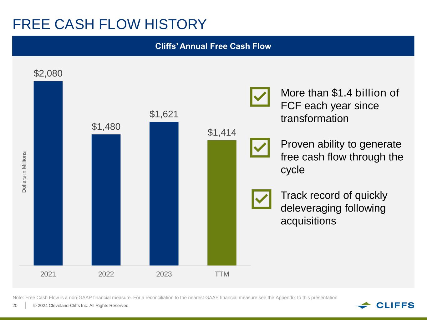 © 2024 Cleveland-Cliffs Inc. All Rights Reserved.19 Cliffs’ Standalone Capex LOWER 2025 CAPEX TARGET 2025 Capex Target D o lla rs i n M ill io n s ▪ $600 million targeted total standalone capex ▪ Updated strategic capital timeline and refined spend estimates ▪ Reduced sustaining capex due to catch-up maintenance cycle ▪ Sustaining capex avoidance related to strategic projects ▪ Inclusive of capital spend for Middletown, Butler and Weirton strategic projects 2021 2022 2023 2024E 2025E $705 $943 $646 $675 $100 $500 Strategic Projects Sustaining $600 Significant Repair & Maintenance Cycle Completed Target 2025