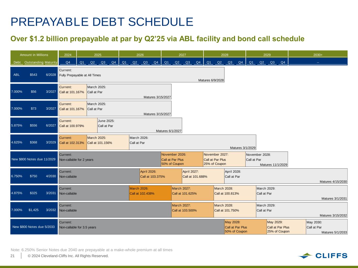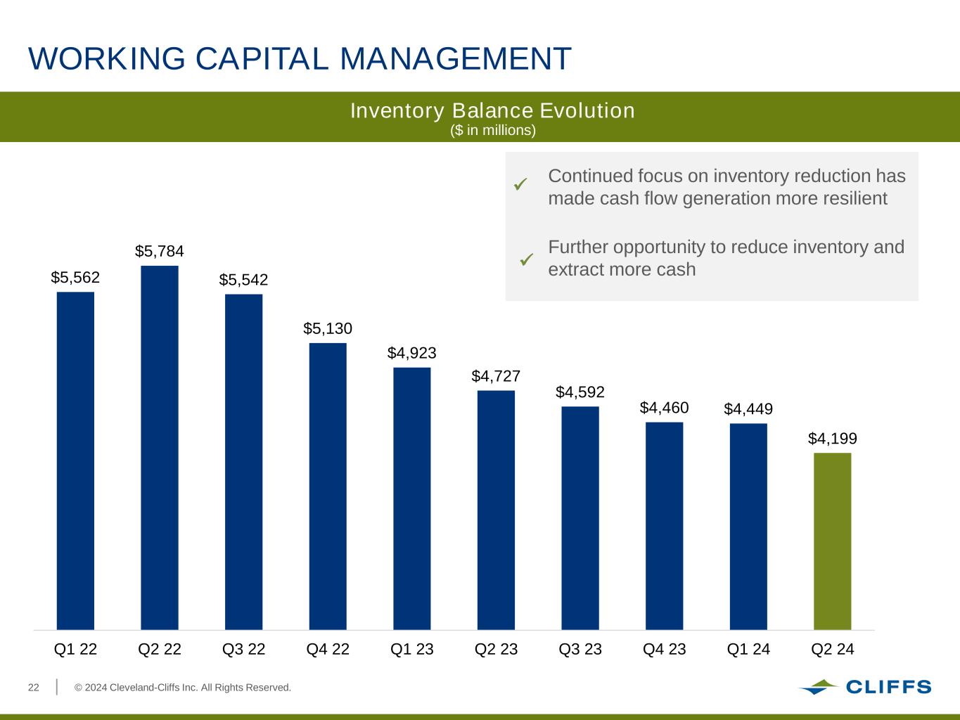 © 2024 Cleveland-Cliffs Inc. All Rights Reserved.21 PREPAYABLE DEBT SCHEDULE Amount in Millions 2024 2025 2026 2027 2028 2029 2030+ Debt Outstanding Maturity Q4 Q1 Q2 Q3 Q4 Q1 Q2 Q3 Q4 Q1 Q2 Q3 Q4 Q1 Q2 Q3 Q4 Q1 Q2 Q3 Q4 -- Current: Fully Prepayable at All Times Matures 6/9/2028 Current: March 2025: Call at 101.167% Call at Par Matures 3/15/2027 Current: March 2025: Call at 101.167% Call at Par Matures 3/15/2027 Current: June 2025: Call at 100.979% Call at Par Matures 6/1/2027 Current: March 2025: March 2026: Call at 102.313% Call at 101.156% Call at Par Matures 3/1/2029 Current: November 2028: Non-callable for 2 years Call at Par Matures 11/1/2029 Current: April 2026: April 2027: April 2028: Non-callable Call at 103.375% Call at 101.688% Call at Par Matures 4/15/2030 Current: March 2026: March 2027: March 2028: March 2029: Non-callable Call at 102.438% Call at 101.625% Call at 100.813% Call at Par Matures 3/1/2031 Current: March 2027: March 2028: March 2029: Non-callable Call at 103.500% Call at 101.750% Call at Par Matures 3/15/2032 Current: May 2030: Non-callable for 3.5 years Call at Par Matures 5/1/2033 May 2028: May 2029: New $800 Notes due 5/2033 Call at Par Plus 50% of Coupon Call at Par Plus 25% of Coupon 3/2031$3254.875% 3/2032$1,4257.000% $556 6/2027 4.625% $368 4/2030$7506.750% 3/2029 November 2026: November 2027: New $800 Notes due 11/2029 ABL $543 6/2028 Call at Par Plus 25% of Coupon Call at Par Plus 50% of Coupon 7.000% $56 3/2027 7.000% $73 3/2027 5.875% Over $1.2 billion prepayable at par by Q2’25 via ABL facility and bond call schedule Note: 6.250% Senior Notes due 2040 are prepayable at a make-whole premium at all times