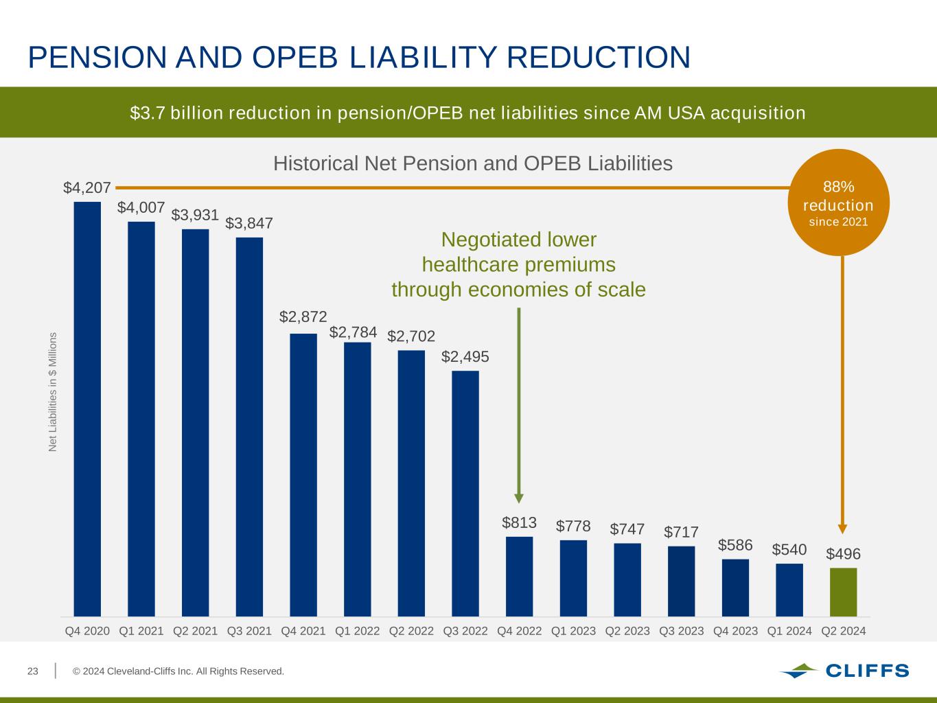 © 2024 Cleveland-Cliffs Inc. All Rights Reserved.23 $4,207 $4,007 $3,931 $3,847 $2,872 $2,784 $2,702 $2,495 $813 $778 $747 $717 $586 $540 $496 Q4 2020 Q1 2021 Q2 2021 Q3 2021 Q4 2021 Q1 2022 Q2 2022 Q3 2022 Q4 2022 Q1 2023 Q2 2023 Q3 2023 Q4 2023 Q1 2024 Q2 2024 PENSION AND OPEB LIABILITY REDUCTION $3.7 billion reduction in pension/OPEB net liabilities since AM USA acquisition N e t L ia b ili ti e s i n $ M ill io n s 88% reduction since 2021 Historical Net Pension and OPEB Liabilities Negotiated lower healthcare premiums through economies of scale