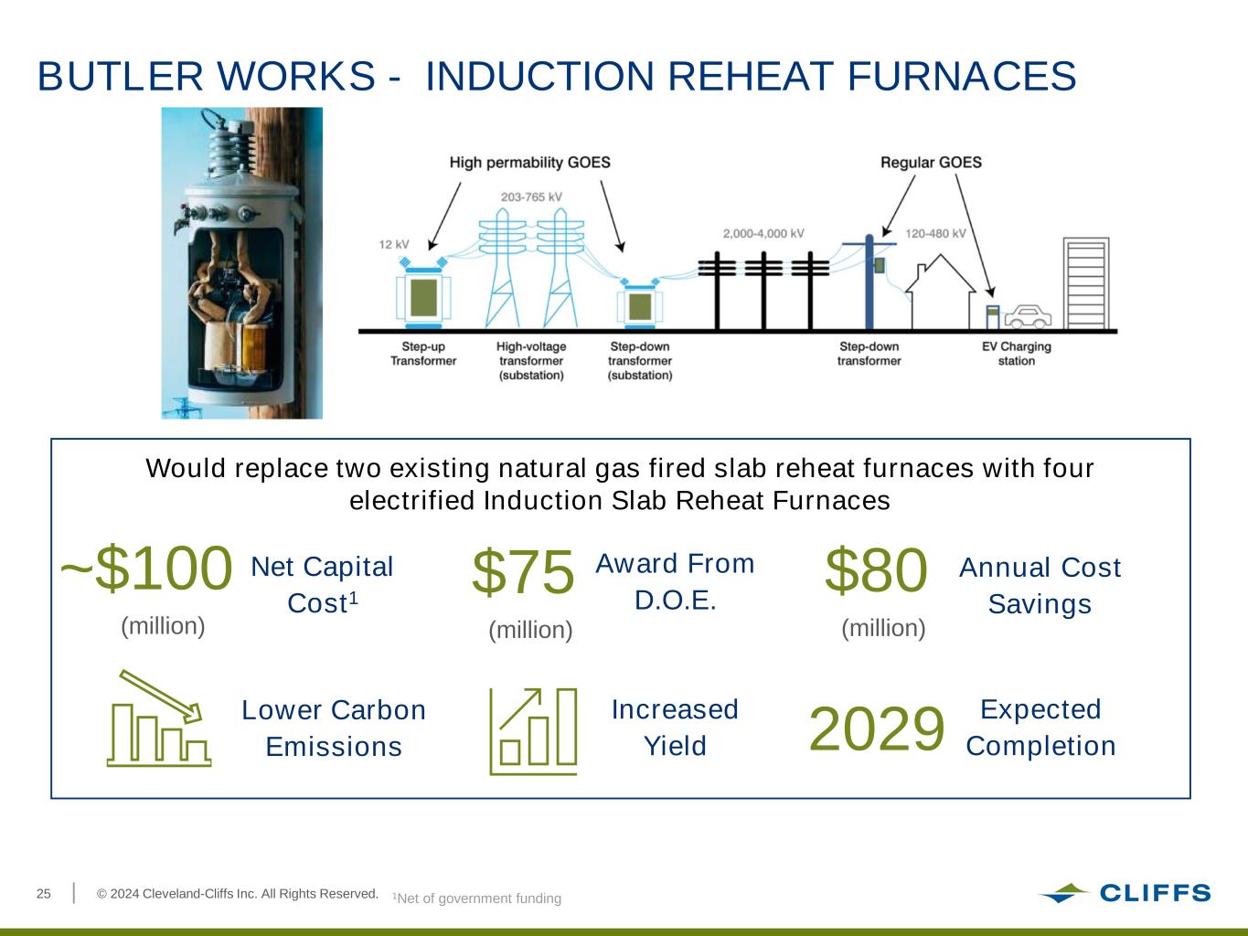 © 2024 Cleveland-Cliffs Inc. All Rights Reserved.24 MIDDLETOWN WORKS - DRI PLANT AND ELECTRIC MELTING FURNACES Lower Carbon Emissions No Impact to Product Quality Net Capital Cost1 Award From D.O.E. Annual Cost Savings $1.3 (billion) $500 (million) $450 (million) Expected Completion2029 Replacement of Blast Furnace with State-of-the-Art DRI-EMF structure 1Net of government funding and capital avoidance on the existing blast furnace and coke plants Phase 1: Contract negotiations, engineering, permit preparation, initial site prep (1 year) Phase 2: Detailed design, approval of permits, site work (1 year) Phase 3: Construction and equipment installation. Fabrication and delivery of the DRI/EMFs (27 months) Phase 4: Commissioning, start-up, and ramp-up activities