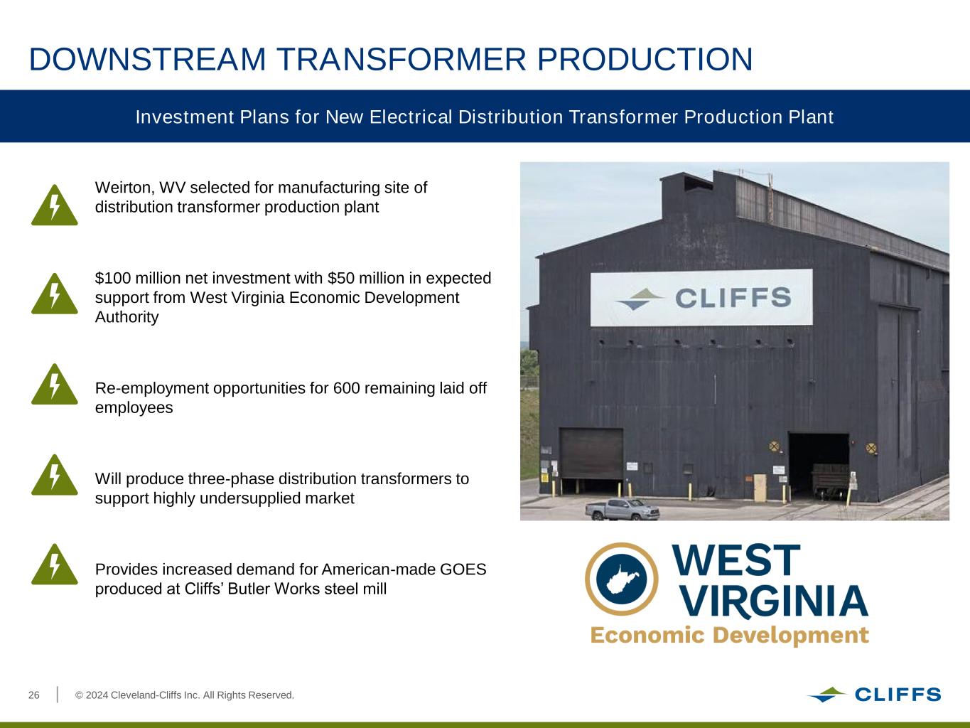 © 2024 Cleveland-Cliffs Inc. All Rights Reserved.26 DOWNSTREAM TRANSFORMER PRODUCTION Weirton, WV selected for manufacturing site of distribution transformer production plant $100 million net investment with $50 million in expected support from West Virginia Economic Development Authority Re-employment opportunities for 600 remaining laid off employees Will produce three-phase distribution transformers to support highly undersupplied market Provides increased demand for American-made GOES produced at Cliffs’ Butler Works steel mill Investment Plans for New Electrical Distribution Transformer Production Plant