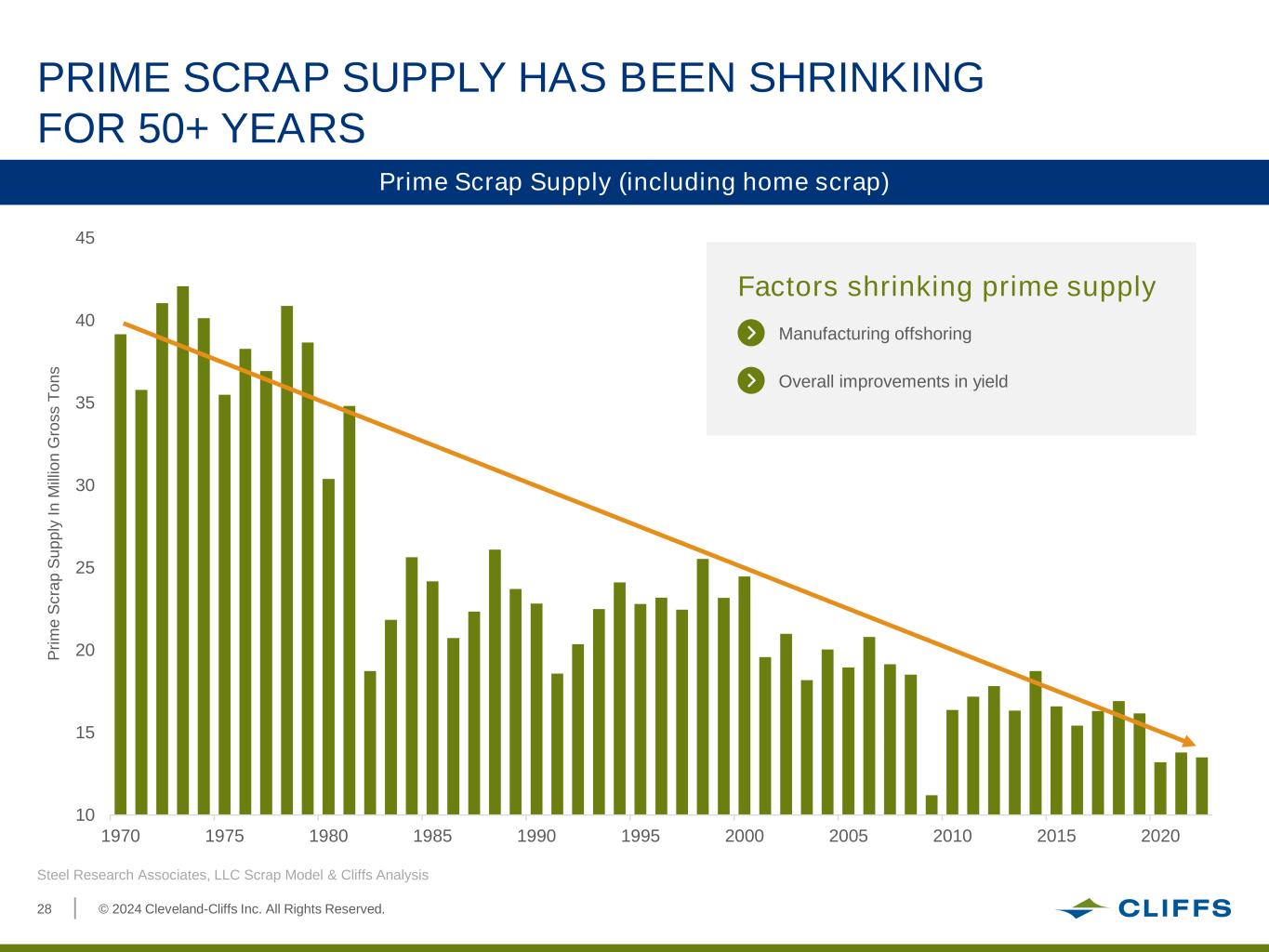 © 2024 Cleveland-Cliffs Inc. All Rights Reserved.28 10 15 20 25 30 35 40 45 1970 1975 1980 1985 1990 1995 2000 2005 2010 2015 2020 Steel Research Associates, LLC Scrap Model & Cliffs Analysis PRIME SCRAP SUPPLY HAS BEEN SHRINKING FOR 50+ YEARS Prime Scrap Supply (including home scrap) P ri m e S c ra p S u p p ly I n M ill io n G ro s s T o n s Factors shrinking prime supply Overall improvements in yield Manufacturing offshoring