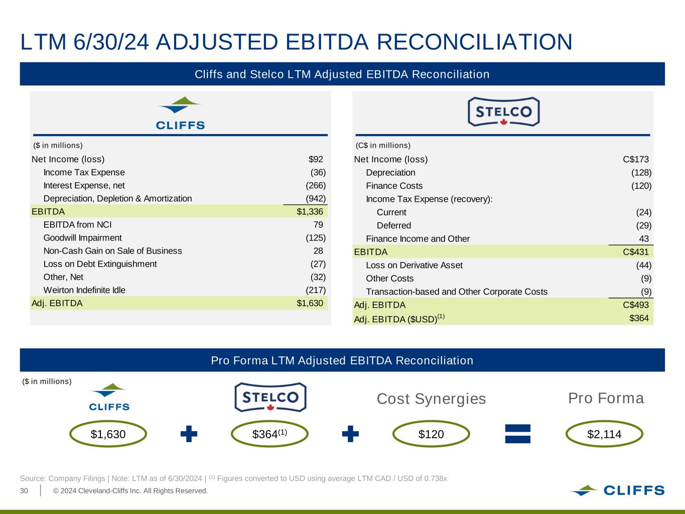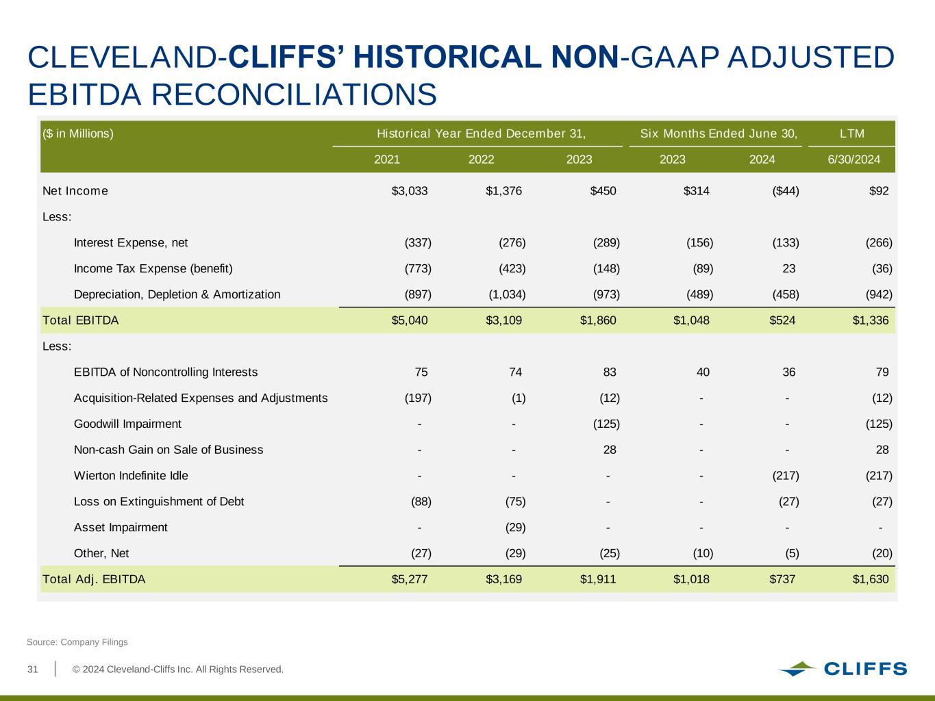 © 2024 Cleveland-Cliffs Inc. All Rights Reserved.30 Source: Company Filings | Note: LTM as of 6/30/2024 | (1) Figures converted to USD using average LTM CAD / USD of 0.738x Pro Forma LTM 6/30/24 ADJUSTED EBITDA RECONCILIATION Net Income (loss) C$173 Depreciation (128) Finance Costs (120) Income Tax Expense (recovery): Current (24) Deferred (29) Finance Income and Other 43 EBITDA C$431 Loss on Derivative Asset (44) Other Costs (9) Transaction-based and Other Corporate Costs (9) Adj. EBITDA C$493 Adj. EBITDA ($USD)(1) $364 Net Income (loss) $92 Income Tax Expense (36) Interest Expense, net (266) Depreciation, Depletion & Amortization (942) EBITDA $1,336 EBITDA from NCI 79 Goodwill Impairment (125) Non-Cash Gain on Sale of Business 28 Loss on Debt Extinguishment (27) Other, Net (32) Weirton Indefinite Idle (217) Adj. EBITDA $1,630 Cliffs and Stelco LTM Adjusted EBITDA Reconciliation ($ in millions) (C$ in millions) $1,630 Pro Forma LTM Adjusted EBITDA Reconciliation $364(1) $2,114 Cost Synergies ($ in millions) $120