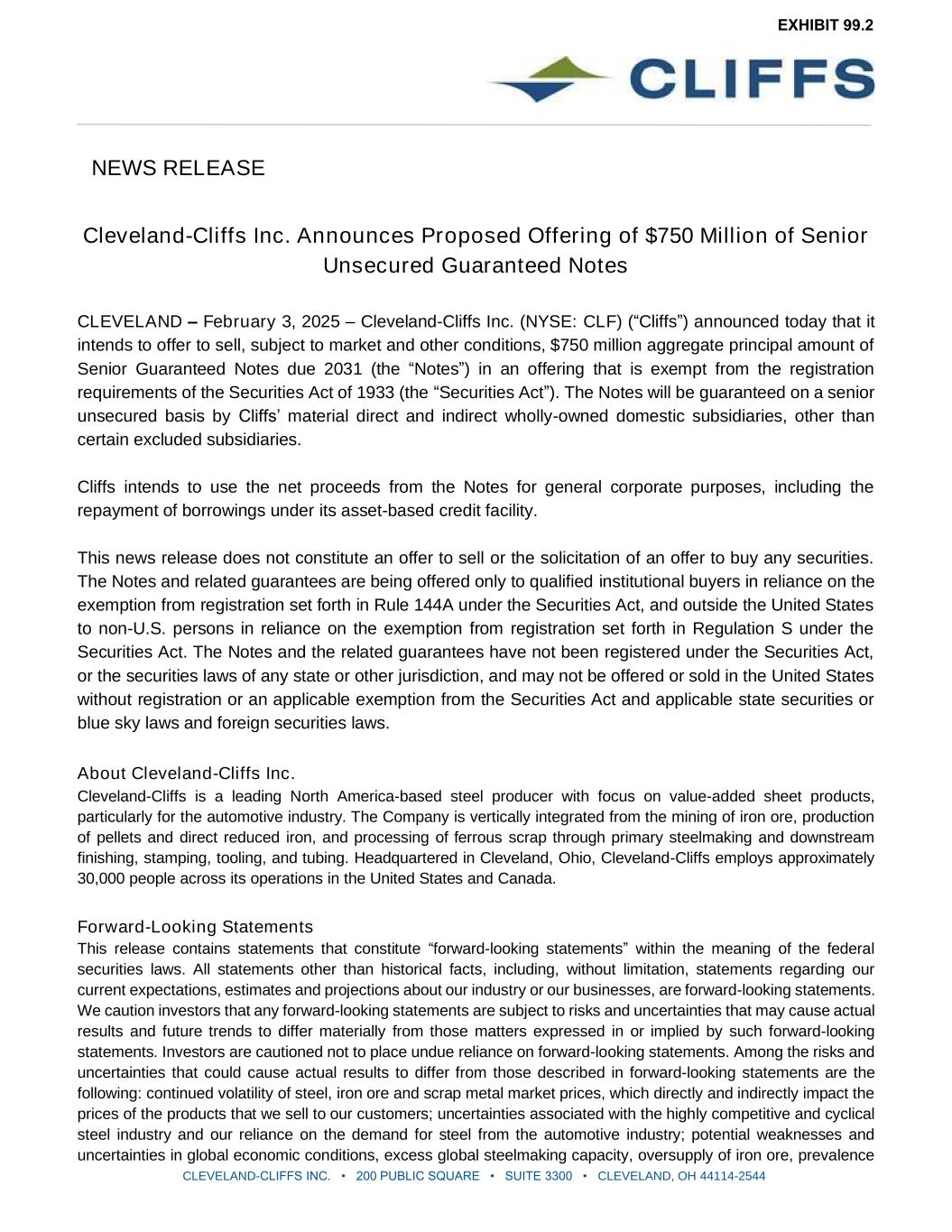 NEWS RELEASE Cleveland-Cliffs Inc. Announces Proposed Offering of $750 Million of Senior Unsecured Guaranteed Notes CLEVELAND – February 3, 2025 – Cleveland-Cliffs Inc. (NYSE: CLF) (“Cliffs”) announced today that it intends to offer to sell, subject to market and other conditions, $750 million aggregate principal amount of Senior Guaranteed Notes due 2031 (the “Notes”) in an offering that is exempt from the registration requirements of the Securities Act of 1933 (the “Securities Act”). The Notes will be guaranteed on a senior unsecured basis by Cliffs’ material direct and indirect wholly-owned domestic subsidiaries, other than certain excluded subsidiaries. Cliffs intends to use the net proceeds from the Notes for general corporate purposes, including the repayment of borrowings under its asset-based credit facility. This news release does not constitute an offer to sell or the solicitation of an offer to buy any securities. The Notes and related guarantees are being offered only to qualified institutional buyers in reliance on the exemption from registration set forth in Rule 144A under the Securities Act, and outside the United States to non-U.S. persons in reliance on the exemption from registration set forth in Regulation S under the Securities Act. The Notes and the related guarantees have not been registered under the Securities Act, or the securities laws of any state or other jurisdiction, and may not be offered or sold in the United States without registration or an applicable exemption from the Securities Act and applicable state securities or blue sky laws and foreign securities laws. About Cleveland-Cliffs Inc. Cleveland-Cliffs is a leading North America-based steel producer with focus on value-added sheet products, particularly for the automotive industry. The Company is vertically integrated from the mining of iron ore, production of pellets and direct reduced iron, and processing of ferrous scrap through primary steelmaking and downstream finishing, stamping, tooling, and tubing. Headquartered in Cleveland, Ohio, Cleveland-Cliffs employs approximately 30,000 people across its operations in the United States and Canada. Forward-Looking Statements This release contains statements that constitute “forward-looking statements” within the meaning of the federal securities laws. All statements other than historical facts, including, without limitation, statements regarding our current expectations, estimates and projections about our industry or our businesses, are forward-looking statements. We caution investors that any forward-looking statements are subject to risks and uncertainties that may cause actual results and future trends to differ materially from those matters expressed in or implied by such forward-looking statements. Investors are cautioned not to place undue reliance on forward-looking statements. Among the risks and uncertainties that could cause actual results to differ from those described in forward-looking statements are the following: continued volatility of steel, iron ore and scrap metal market prices, which directly and indirectly impact the prices of the products that we sell to our customers; uncertainties associated with the highly competitive and cyclical steel industry and our reliance on the demand for steel from the automotive industry; potential weaknesses and uncertainties in global economic conditions, excess global steelmaking capacity, oversupply of iron ore, prevalence CLEVELAND-CLIFFS INC. • 200 PUBLIC SQUARE • SUITE 3300 • CLEVELAND, OH 44114-2544 EXHIBIT 99.2