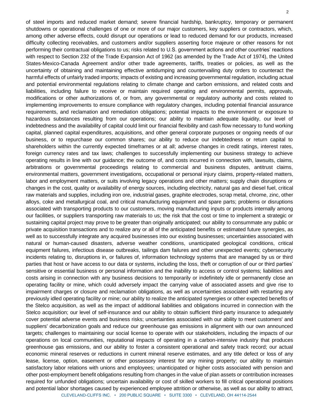 2 of steel imports and reduced market demand; severe financial hardship, bankruptcy, temporary or permanent shutdowns or operational challenges of one or more of our major customers, key suppliers or contractors, which, among other adverse effects, could disrupt our operations or lead to reduced demand for our products, increased difficulty collecting receivables, and customers and/or suppliers asserting force majeure or other reasons for not performing their contractual obligations to us; risks related to U.S. government actions and other countries’ reactions with respect to Section 232 of the Trade Expansion Act of 1962 (as amended by the Trade Act of 1974), the United States-Mexico-Canada Agreement and/or other trade agreements, tariffs, treaties or policies, as well as the uncertainty of obtaining and maintaining effective antidumping and countervailing duty orders to counteract the harmful effects of unfairly traded imports; impacts of existing and increasing governmental regulation, including actual and potential environmental regulations relating to climate change and carbon emissions, and related costs and liabilities, including failure to receive or maintain required operating and environmental permits, approvals, modifications or other authorizations of, or from, any governmental or regulatory authority and costs related to implementing improvements to ensure compliance with regulatory changes, including potential financial assurance requirements, and reclamation and remediation obligations; potential impacts to the environment or exposure to hazardous substances resulting from our operations; our ability to maintain adequate liquidity, our level of indebtedness and the availability of capital could limit our financial flexibility and cash flow necessary to fund working capital, planned capital expenditures, acquisitions, and other general corporate purposes or ongoing needs of our business, or to repurchase our common shares; our ability to reduce our indebtedness or return capital to shareholders within the currently expected timeframes or at all; adverse changes in credit ratings, interest rates, foreign currency rates and tax laws; challenges to successfully implementing our business strategy to achieve operating results in line with our guidance; the outcome of, and costs incurred in connection with, lawsuits, claims, arbitrations or governmental proceedings relating to commercial and business disputes, antitrust claims, environmental matters, government investigations, occupational or personal injury claims, property-related matters, labor and employment matters, or suits involving legacy operations and other matters; supply chain disruptions or changes in the cost, quality or availability of energy sources, including electricity, natural gas and diesel fuel, critical raw materials and supplies, including iron ore, industrial gases, graphite electrodes, scrap metal, chrome, zinc, other alloys, coke and metallurgical coal, and critical manufacturing equipment and spare parts; problems or disruptions associated with transporting products to our customers, moving manufacturing inputs or products internally among our facilities, or suppliers transporting raw materials to us; the risk that the cost or time to implement a strategic or sustaining capital project may prove to be greater than originally anticipated; our ability to consummate any public or private acquisition transactions and to realize any or all of the anticipated benefits or estimated future synergies, as well as to successfully integrate any acquired businesses into our existing businesses; uncertainties associated with natural or human-caused disasters, adverse weather conditions, unanticipated geological conditions, critical equipment failures, infectious disease outbreaks, tailings dam failures and other unexpected events; cybersecurity incidents relating to, disruptions in, or failures of, information technology systems that are managed by us or third parties that host or have access to our data or systems, including the loss, theft or corruption of our or third parties’ sensitive or essential business or personal information and the inability to access or control systems; liabilities and costs arising in connection with any business decisions to temporarily or indefinitely idle or permanently close an operating facility or mine, which could adversely impact the carrying value of associated assets and give rise to impairment charges or closure and reclamation obligations, as well as uncertainties associated with restarting any previously idled operating facility or mine; our ability to realize the anticipated synergies or other expected benefits of the Stelco acquisition, as well as the impact of additional liabilities and obligations incurred in connection with the Stelco acquisition; our level of self-insurance and our ability to obtain sufficient third-party insurance to adequately cover potential adverse events and business risks; uncertainties associated with our ability to meet customers' and suppliers' decarbonization goals and reduce our greenhouse gas emissions in alignment with our own announced targets; challenges to maintaining our social license to operate with our stakeholders, including the impacts of our operations on local communities, reputational impacts of operating in a carbon-intensive industry that produces greenhouse gas emissions, and our ability to foster a consistent operational and safety track record; our actual economic mineral reserves or reductions in current mineral reserve estimates, and any title defect or loss of any lease, license, option, easement or other possessory interest for any mining property; our ability to maintain satisfactory labor relations with unions and employees; unanticipated or higher costs associated with pension and other post-employment benefit obligations resulting from changes in the value of plan assets or contribution increases required for 