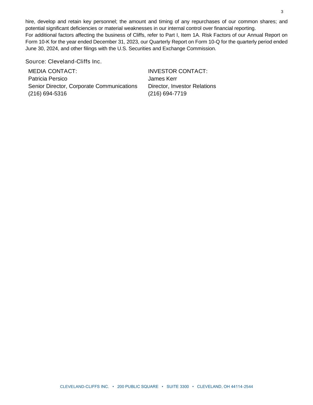 CLEVELAND-CLIFFS INC. • 200 PUBLIC SQUARE • SUITE 3300 • CLEVELAND, OH 44114-2544 3 hire, develop and retain key personnel; the amount and timing of any repurchases of our common shares; and potential significant deficiencies or material weaknesses in our internal control over financial reporting. For additional factors affecting the business of Cliffs, refer to Part I, Item 1A. Risk Factors of our Annual Report on Form 10-K for the year ended December 31, 2023, our Quarterly Report on Form 10-Q for the quarterly period ended June 30, 2024, and other filings with the U.S. Securities and Exchange Commission. Source: Cleveland-Cliffs Inc. MEDIA CONTACT: Patricia Persico Senior Director, Corporate Communications (216) 694-5316 INVESTOR CONTACT: James Kerr Director, Investor Relations (216) 694-7719