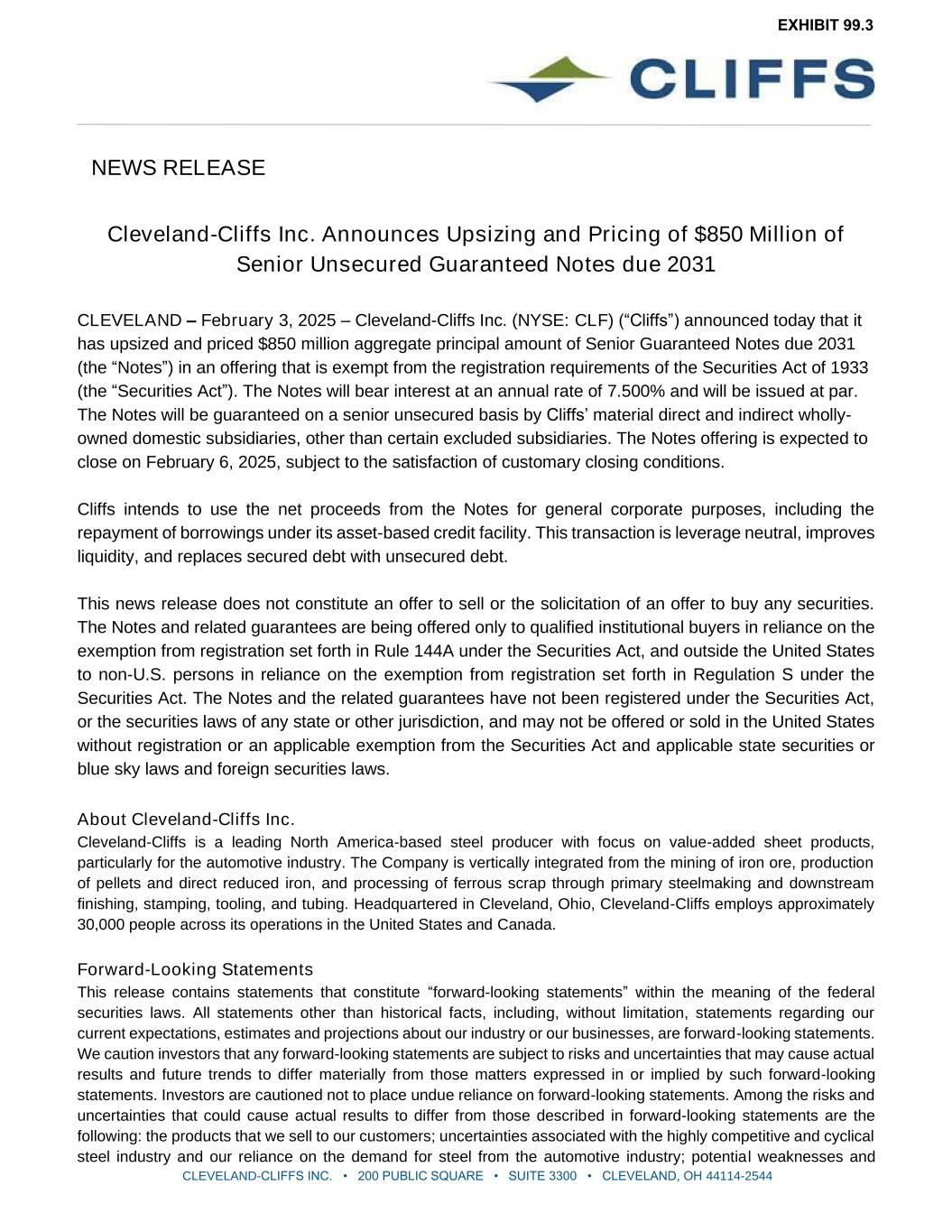 NEWS RELEASE Cleveland-Cliffs Inc. Announces Upsizing and Pricing of $850 Million of Senior Unsecured Guaranteed Notes due 2031 CLEVELAND – February 3, 2025 – Cleveland-Cliffs Inc. (NYSE: CLF) (“Cliffs”) announced today that it has upsized and priced $850 million aggregate principal amount of Senior Guaranteed Notes due 2031 (the “Notes”) in an offering that is exempt from the registration requirements of the Securities Act of 1933 (the “Securities Act”). The Notes will bear interest at an annual rate of 7.500% and will be issued at par. The Notes will be guaranteed on a senior unsecured basis by Cliffs’ material direct and indirect wholly- owned domestic subsidiaries, other than certain excluded subsidiaries. The Notes offering is expected to close on February 6, 2025, subject to the satisfaction of customary closing conditions. Cliffs intends to use the net proceeds from the Notes for general corporate purposes, including the repayment of borrowings under its asset-based credit facility. This transaction is leverage neutral, improves liquidity, and replaces secured debt with unsecured debt. This news release does not constitute an offer to sell or the solicitation of an offer to buy any securities. The Notes and related guarantees are being offered only to qualified institutional buyers in reliance on the exemption from registration set forth in Rule 144A under the Securities Act, and outside the United States to non-U.S. persons in reliance on the exemption from registration set forth in Regulation S under the Securities Act. The Notes and the related guarantees have not been registered under the Securities Act, or the securities laws of any state or other jurisdiction, and may not be offered or sold in the United States without registration or an applicable exemption from the Securities Act and applicable state securities or blue sky laws and foreign securities laws. About Cleveland-Cliffs Inc. Cleveland-Cliffs is a leading North America-based steel producer with focus on value-added sheet products, particularly for the automotive industry. The Company is vertically integrated from the mining of iron ore, production of pellets and direct reduced iron, and processing of ferrous scrap through primary steelmaking and downstream finishing, stamping, tooling, and tubing. Headquartered in Cleveland, Ohio, Cleveland-Cliffs employs approximately 30,000 people across its operations in the United States and Canada. Forward-Looking Statements This release contains statements that constitute “forward-looking statements” within the meaning of the federal securities laws. All statements other than historical facts, including, without limitation, statements regarding our current expectations, estimates and projections about our industry or our businesses, are forward-looking statements. We caution investors that any forward-looking statements are subject to risks and uncertainties that may cause actual results and future trends to differ materially from those matters expressed in or implied by such forward-looking statements. Investors are cautioned not to place undue reliance on forward-looking statements. Among the risks and uncertainties that could cause actual results to differ from those described in forward-looking statements are the following: the products that we sell to our customers; uncertainties associated with the highly competitive and cyclical steel industry and our reliance on the demand for steel from the automotive industry; potential weaknesses and CLEVELAND-CLIFFS INC. • 200 PUBLIC SQUARE • SUITE 3300 • CLEVELAND, OH 44114-2544 EXHIBIT 99.3