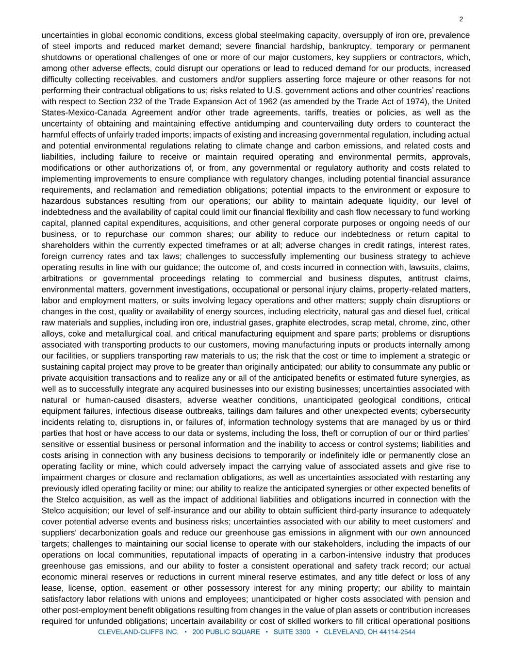 2 uncertainties in global economic conditions, excess global steelmaking capacity, oversupply of iron ore, prevalence of steel imports and reduced market demand; severe financial hardship, bankruptcy, temporary or permanent shutdowns or operational challenges of one or more of our major customers, key suppliers or contractors, which, among other adverse effects, could disrupt our operations or lead to reduced demand for our products, increased difficulty collecting receivables, and customers and/or suppliers asserting force majeure or other reasons for not performing their contractual obligations to us; risks related to U.S. government actions and other countries’ reactions with respect to Section 232 of the Trade Expansion Act of 1962 (as amended by the Trade Act of 1974), the United States-Mexico-Canada Agreement and/or other trade agreements, tariffs, treaties or policies, as well as the uncertainty of obtaining and maintaining effective antidumping and countervailing duty orders to counteract the harmful effects of unfairly traded imports; impacts of existing and increasing governmental regulation, including actual and potential environmental regulations relating to climate change and carbon emissions, and related costs and liabilities, including failure to receive or maintain required operating and environmental permits, approvals, modifications or other authorizations of, or from, any governmental or regulatory authority and costs related to implementing improvements to ensure compliance with regulatory changes, including potential financial assurance requirements, and reclamation and remediation obligations; potential impacts to the environment or exposure to hazardous substances resulting from our operations; our ability to maintain adequate liquidity, our level of indebtedness and the availability of capital could limit our financial flexibility and cash flow necessary to fund working capital, planned capital expenditures, acquisitions, and other general corporate purposes or ongoing needs of our business, or to repurchase our common shares; our ability to reduce our indebtedness or return capital to shareholders within the currently expected timeframes or at all; adverse changes in credit ratings, interest rates, foreign currency rates and tax laws; challenges to successfully implementing our business strategy to achieve operating results in line with our guidance; the outcome of, and costs incurred in connection with, lawsuits, claims, arbitrations or governmental proceedings relating to commercial and business disputes, antitrust claims, environmental matters, government investigations, occupational or personal injury claims, property-related matters, labor and employment matters, or suits involving legacy operations and other matters; supply chain disruptions or changes in the cost, quality or availability of energy sources, including electricity, natural gas and diesel fuel, critical raw materials and supplies, including iron ore, industrial gases, graphite electrodes, scrap metal, chrome, zinc, other alloys, coke and metallurgical coal, and critical manufacturing equipment and spare parts; problems or disruptions associated with transporting products to our customers, moving manufacturing inputs or products internally among our facilities, or suppliers transporting raw materials to us; the risk that the cost or time to implement a strategic or sustaining capital project may prove to be greater than originally anticipated; our ability to consummate any public or private acquisition transactions and to realize any or all of the anticipated benefits or estimated future synergies, as well as to successfully integrate any acquired businesses into our existing businesses; uncertainties associated with natural or human-caused disasters, adverse weather conditions, unanticipated geological conditions, critical equipment failures, infectious disease outbreaks, tailings dam failures and other unexpected events; cybersecurity incidents relating to, disruptions in, or failures of, information technology systems that are managed by us or third parties that host or have access to our data or systems, including the loss, theft or corruption of our or third parties’ sensitive or essential business or personal information and the inability to access or control systems; liabil ities and costs arising in connection with any business decisions to temporarily or indefinitely idle or permanently close an operating facility or mine, which could adversely impact the carrying value of associated assets and give rise to impairment charges or closure and reclamation obligations, as well as uncertainties associated with restarting any previously idled operating facility or mine; our ability to realize the anticipated synergies or other expected benefits of the Stelco acquisition, as well as the impact of additional liabilities and obligations incurred in connection with the Stelco acquisition; our level of self-insurance and our ability to obtain sufficient third-party insurance to adequately cover potential adverse events and business risks; uncertainties associated with our ability to meet customers' and suppliers' decarbonization goals and reduce our greenhouse gas emissions in alignment with our own announced targets; challenges to maintaining our social license to operate with our stakeholders, including the impacts of our operations on local communities, reputational impacts of operating in a carbon-intensive industry that produces greenhouse gas emissions, and our ability to foster a consistent operational and safety track record; our actual economic mineral reserves or reductions in current mineral reserve estimates, and any title defect or loss of any lease, license, option, easement or other possessory interest for any mining property; our ability to maintain satisfactory labor relations with unions and employees; unanticipated or higher costs associated with pension and other post-empl